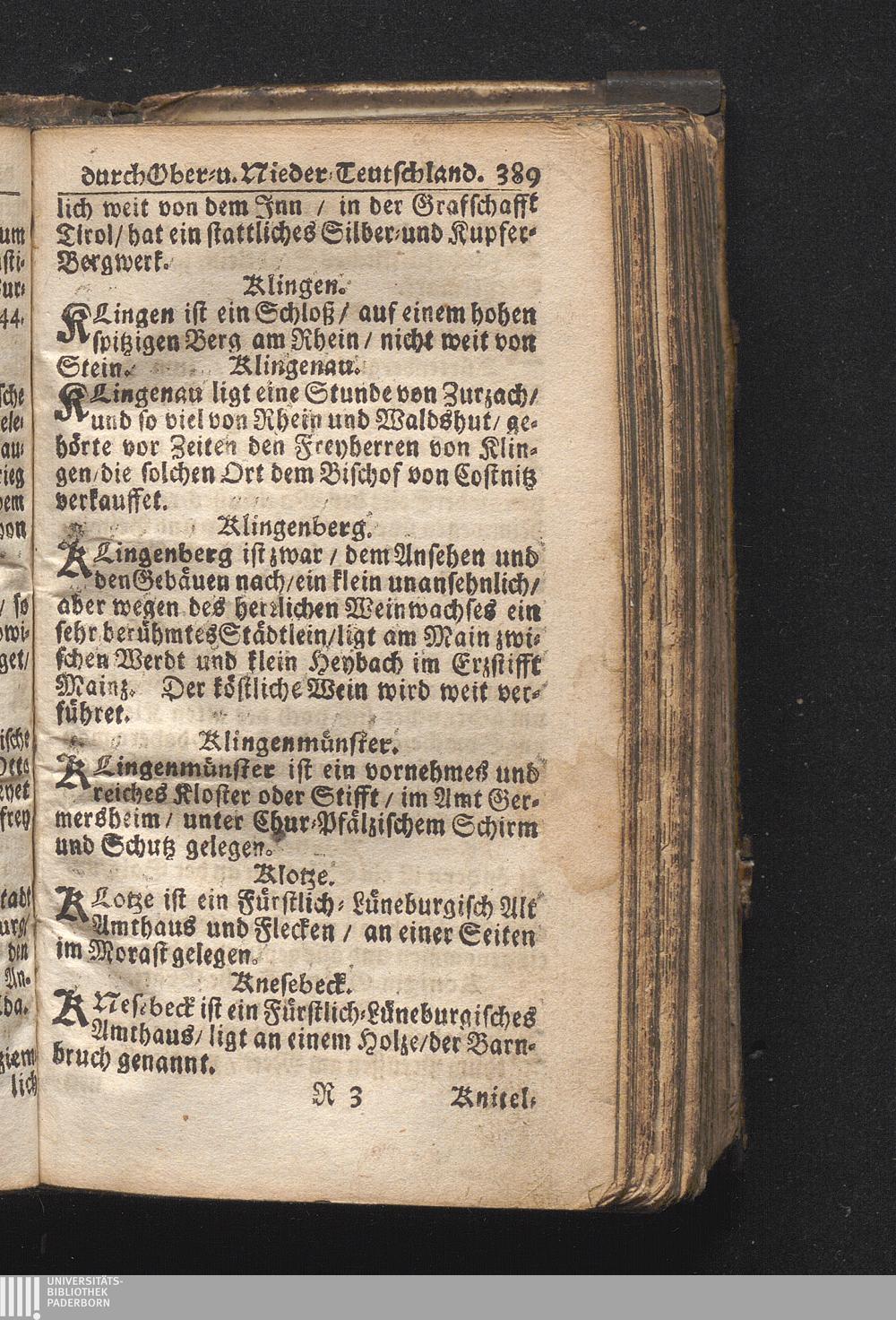 Der getreue Reiß-Gefert durch Ober- und Nieder-Teutschland : Das ist: Grundrichtige und ausführliche Abhandlung derer jenigen Residenzien/ Städte/ Schlösser/ Vestungen/ Städtlein und nahmhafften Markflecken/ welche so wol in Ober- als Nieder-Teutschland/ einem Reisenden sich hin und wieder vorstellig machen und zwar solcher Gestalt/ daß darinn derer Ursprung/ Aufnahm/ Fortification/ Raritäten/ herrliche Gebäue/ und Glück- und Unglücks-Fälle bis auf gegenwärtige Zeit fortgesetzt enthalten. Dabey auch noch über das ein absonderlicher kurz-gefasster Weegweiser angehänget zu finden/ worinnen klärlich zu sehen, wie viel Meilen ein Ort von dem andern entlegen. Alles aus denen bewährtesten Scribenten hervorgesuchet/ zum Nutz-Ergötzen mitgetheilet ...