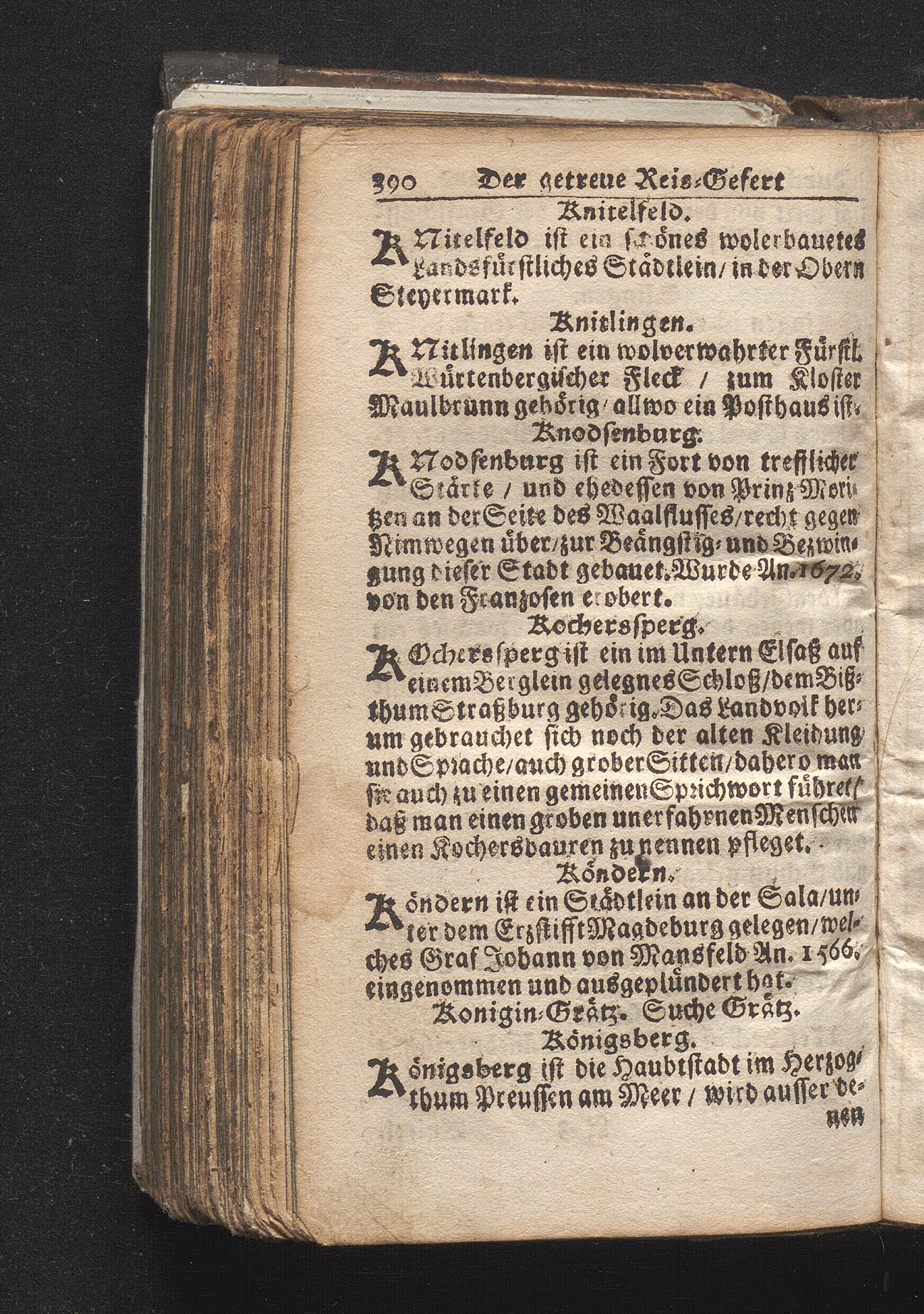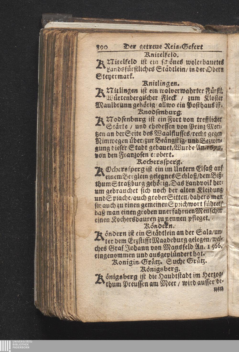 Der getreue Reiß-Gefert durch Ober- und Nieder-Teutschland : Das ist: Grundrichtige und ausführliche Abhandlung derer jenigen Residenzien/ Städte/ Schlösser/ Vestungen/ Städtlein und nahmhafften Markflecken/ welche so wol in Ober- als Nieder-Teutschland/ einem Reisenden sich hin und wieder vorstellig machen und zwar solcher Gestalt/ daß darinn derer Ursprung/ Aufnahm/ Fortification/ Raritäten/ herrliche Gebäue/ und Glück- und Unglücks-Fälle bis auf gegenwärtige Zeit fortgesetzt enthalten. Dabey auch noch über das ein absonderlicher kurz-gefasster Weegweiser angehänget zu finden/ worinnen klärlich zu sehen, wie viel Meilen ein Ort von dem andern entlegen. Alles aus denen bewährtesten Scribenten hervorgesuchet/ zum Nutz-Ergötzen mitgetheilet ...