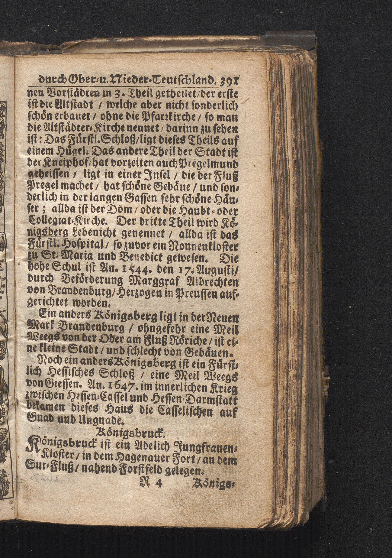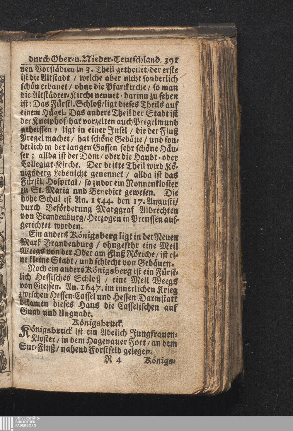 Der getreue Reiß-Gefert durch Ober- und Nieder-Teutschland : Das ist: Grundrichtige und ausführliche Abhandlung derer jenigen Residenzien/ Städte/ Schlösser/ Vestungen/ Städtlein und nahmhafften Markflecken/ welche so wol in Ober- als Nieder-Teutschland/ einem Reisenden sich hin und wieder vorstellig machen und zwar solcher Gestalt/ daß darinn derer Ursprung/ Aufnahm/ Fortification/ Raritäten/ herrliche Gebäue/ und Glück- und Unglücks-Fälle bis auf gegenwärtige Zeit fortgesetzt enthalten. Dabey auch noch über das ein absonderlicher kurz-gefasster Weegweiser angehänget zu finden/ worinnen klärlich zu sehen, wie viel Meilen ein Ort von dem andern entlegen. Alles aus denen bewährtesten Scribenten hervorgesuchet/ zum Nutz-Ergötzen mitgetheilet ...