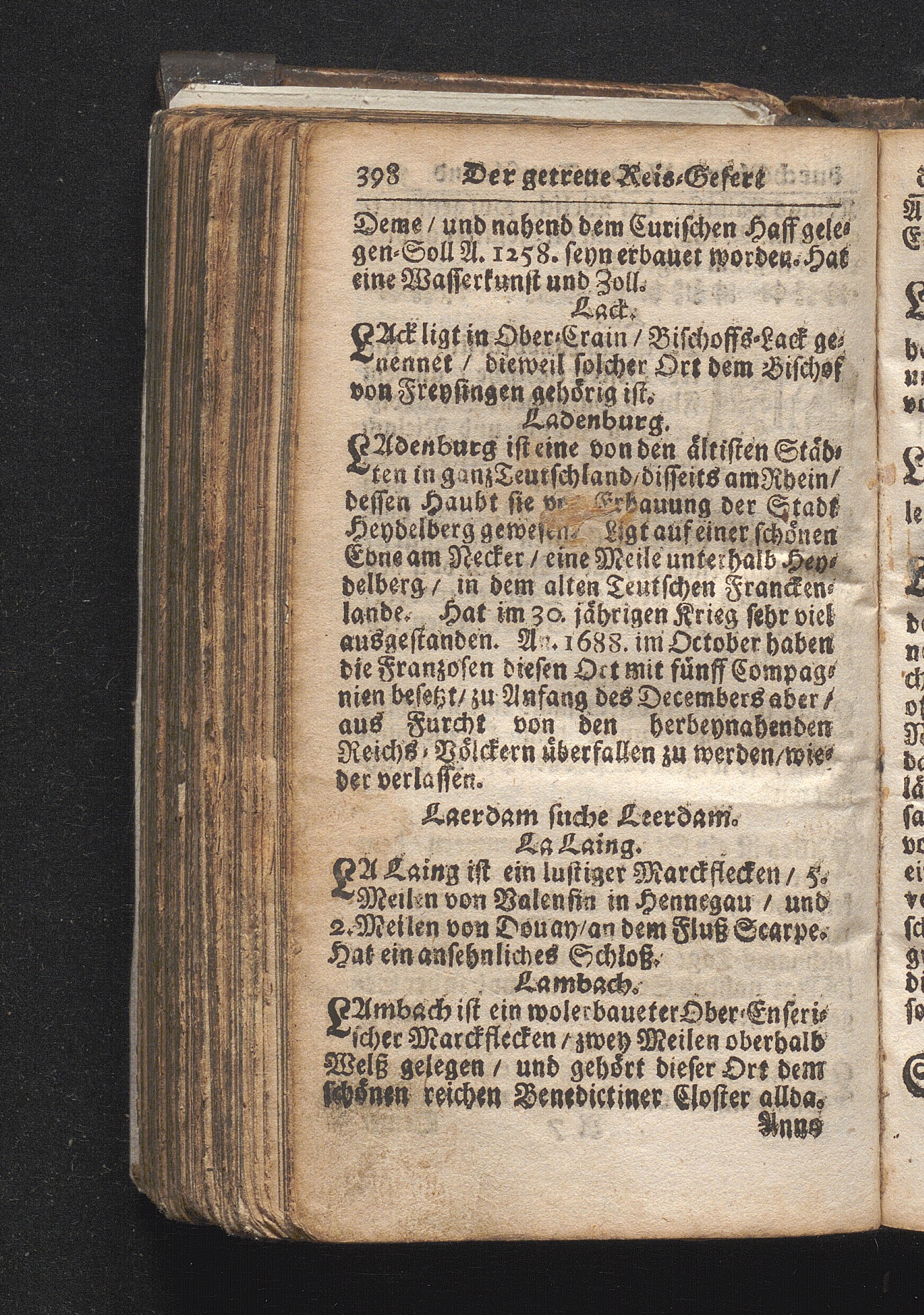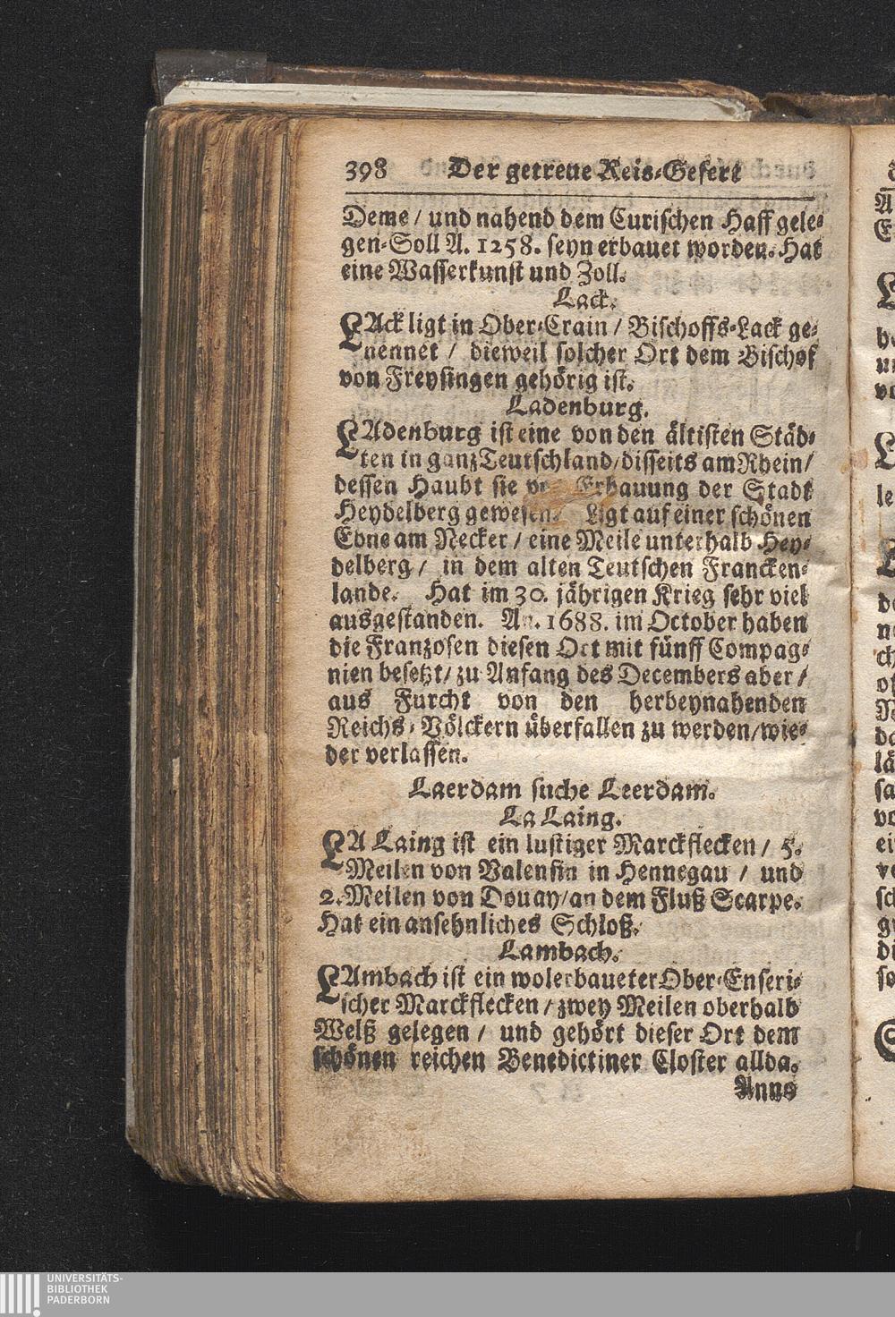 Der getreue Reiß-Gefert durch Ober- und Nieder-Teutschland : Das ist: Grundrichtige und ausführliche Abhandlung derer jenigen Residenzien/ Städte/ Schlösser/ Vestungen/ Städtlein und nahmhafften Markflecken/ welche so wol in Ober- als Nieder-Teutschland/ einem Reisenden sich hin und wieder vorstellig machen und zwar solcher Gestalt/ daß darinn derer Ursprung/ Aufnahm/ Fortification/ Raritäten/ herrliche Gebäue/ und Glück- und Unglücks-Fälle bis auf gegenwärtige Zeit fortgesetzt enthalten. Dabey auch noch über das ein absonderlicher kurz-gefasster Weegweiser angehänget zu finden/ worinnen klärlich zu sehen, wie viel Meilen ein Ort von dem andern entlegen. Alles aus denen bewährtesten Scribenten hervorgesuchet/ zum Nutz-Ergötzen mitgetheilet ...