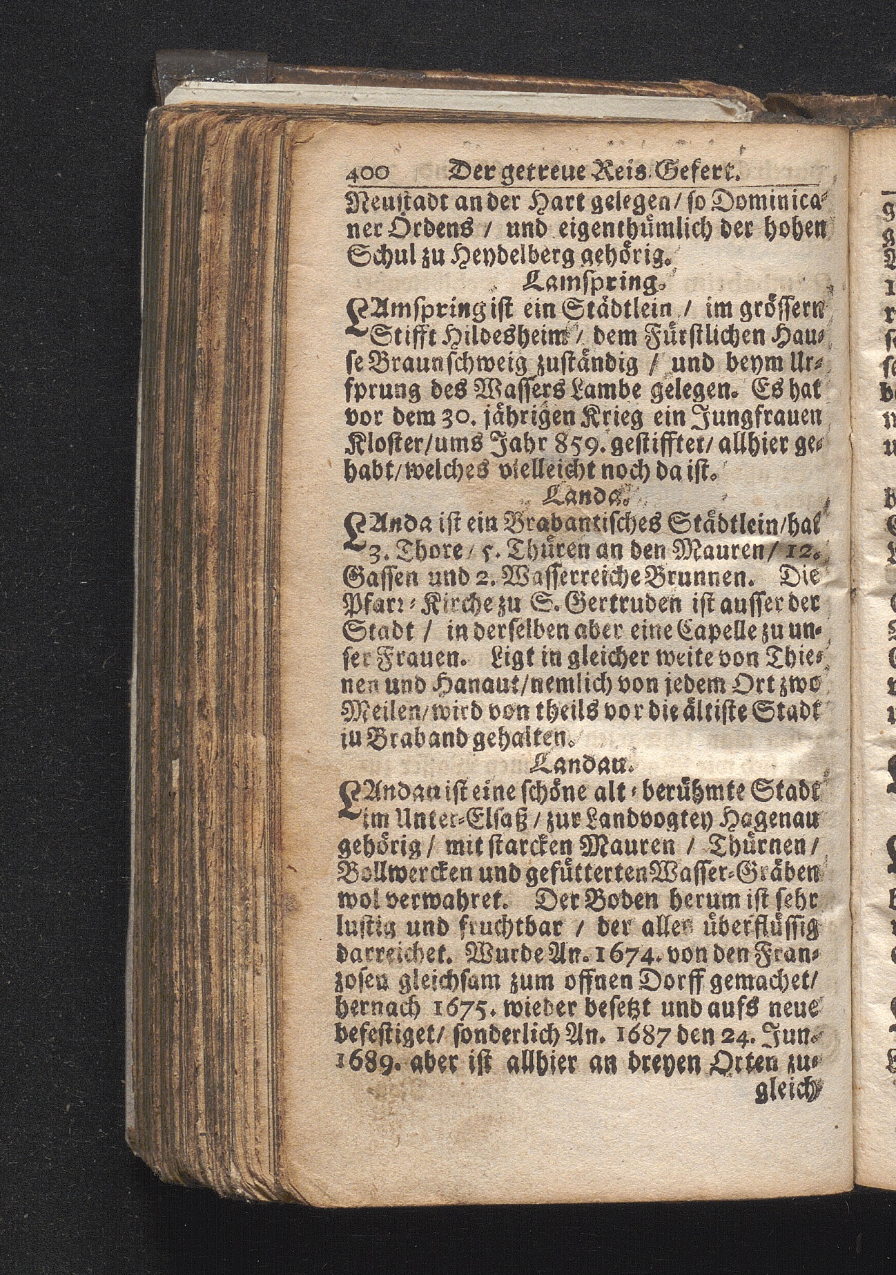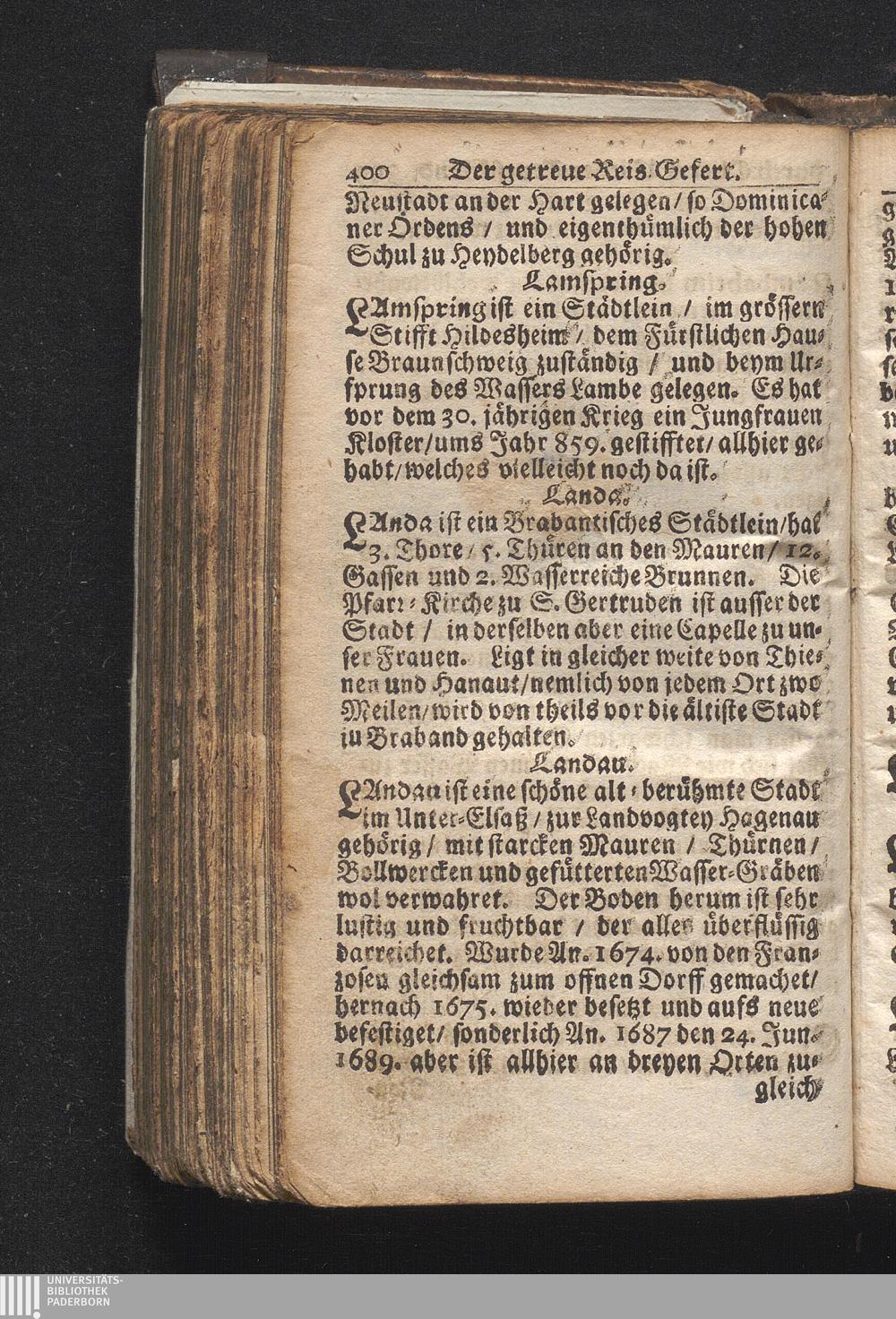 Der getreue Reiß-Gefert durch Ober- und Nieder-Teutschland : Das ist: Grundrichtige und ausführliche Abhandlung derer jenigen Residenzien/ Städte/ Schlösser/ Vestungen/ Städtlein und nahmhafften Markflecken/ welche so wol in Ober- als Nieder-Teutschland/ einem Reisenden sich hin und wieder vorstellig machen und zwar solcher Gestalt/ daß darinn derer Ursprung/ Aufnahm/ Fortification/ Raritäten/ herrliche Gebäue/ und Glück- und Unglücks-Fälle bis auf gegenwärtige Zeit fortgesetzt enthalten. Dabey auch noch über das ein absonderlicher kurz-gefasster Weegweiser angehänget zu finden/ worinnen klärlich zu sehen, wie viel Meilen ein Ort von dem andern entlegen. Alles aus denen bewährtesten Scribenten hervorgesuchet/ zum Nutz-Ergötzen mitgetheilet ...
