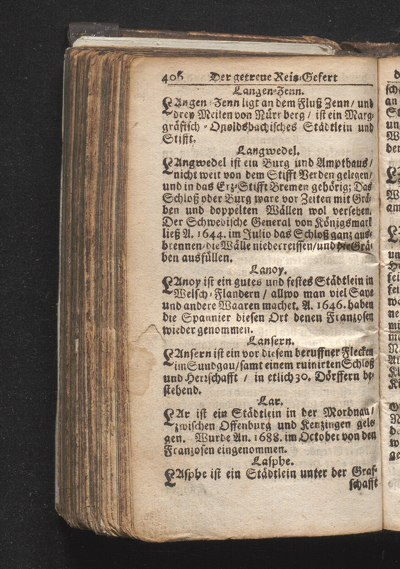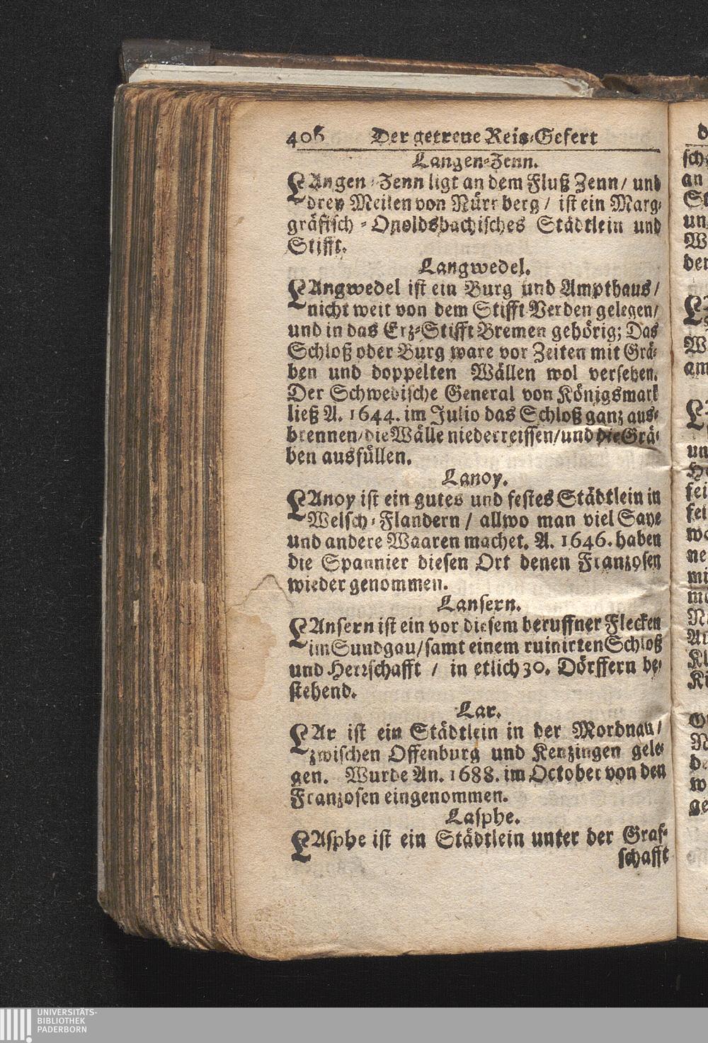 Der getreue Reiß-Gefert durch Ober- und Nieder-Teutschland : Das ist: Grundrichtige und ausführliche Abhandlung derer jenigen Residenzien/ Städte/ Schlösser/ Vestungen/ Städtlein und nahmhafften Markflecken/ welche so wol in Ober- als Nieder-Teutschland/ einem Reisenden sich hin und wieder vorstellig machen und zwar solcher Gestalt/ daß darinn derer Ursprung/ Aufnahm/ Fortification/ Raritäten/ herrliche Gebäue/ und Glück- und Unglücks-Fälle bis auf gegenwärtige Zeit fortgesetzt enthalten. Dabey auch noch über das ein absonderlicher kurz-gefasster Weegweiser angehänget zu finden/ worinnen klärlich zu sehen, wie viel Meilen ein Ort von dem andern entlegen. Alles aus denen bewährtesten Scribenten hervorgesuchet/ zum Nutz-Ergötzen mitgetheilet ...