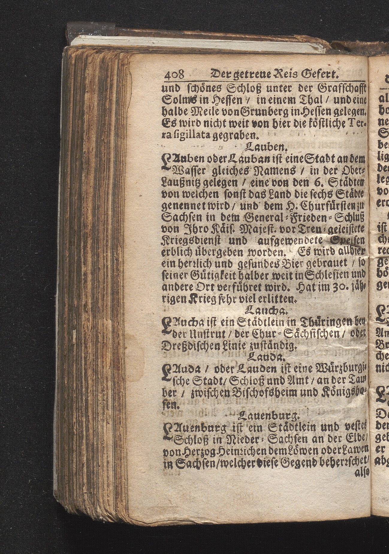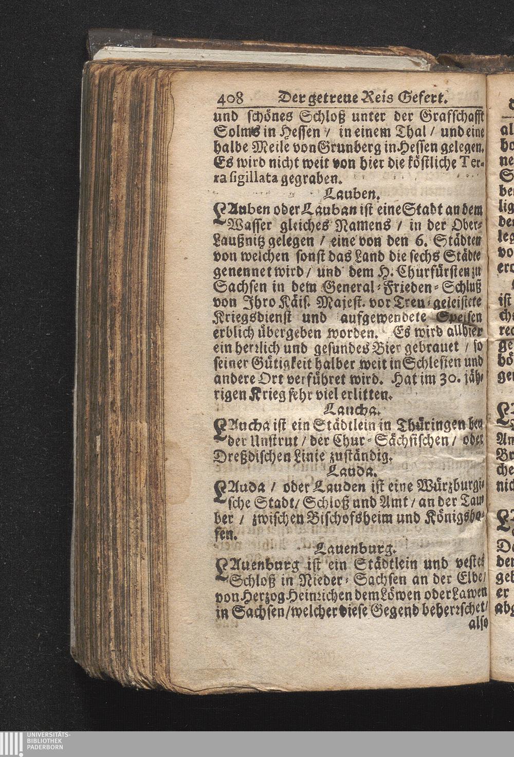 Der getreue Reiß-Gefert durch Ober- und Nieder-Teutschland : Das ist: Grundrichtige und ausführliche Abhandlung derer jenigen Residenzien/ Städte/ Schlösser/ Vestungen/ Städtlein und nahmhafften Markflecken/ welche so wol in Ober- als Nieder-Teutschland/ einem Reisenden sich hin und wieder vorstellig machen und zwar solcher Gestalt/ daß darinn derer Ursprung/ Aufnahm/ Fortification/ Raritäten/ herrliche Gebäue/ und Glück- und Unglücks-Fälle bis auf gegenwärtige Zeit fortgesetzt enthalten. Dabey auch noch über das ein absonderlicher kurz-gefasster Weegweiser angehänget zu finden/ worinnen klärlich zu sehen, wie viel Meilen ein Ort von dem andern entlegen. Alles aus denen bewährtesten Scribenten hervorgesuchet/ zum Nutz-Ergötzen mitgetheilet ...