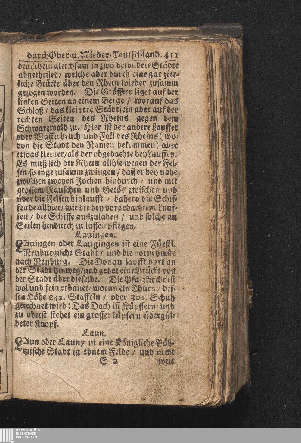 Der getreue Reiß-Gefert durch Ober- und Nieder-Teutschland : Das ist: Grundrichtige und ausführliche Abhandlung derer jenigen Residenzien/ Städte/ Schlösser/ Vestungen/ Städtlein und nahmhafften Markflecken/ welche so wol in Ober- als Nieder-Teutschland/ einem Reisenden sich hin und wieder vorstellig machen und zwar solcher Gestalt/ daß darinn derer Ursprung/ Aufnahm/ Fortification/ Raritäten/ herrliche Gebäue/ und Glück- und Unglücks-Fälle bis auf gegenwärtige Zeit fortgesetzt enthalten. Dabey auch noch über das ein absonderlicher kurz-gefasster Weegweiser angehänget zu finden/ worinnen klärlich zu sehen, wie viel Meilen ein Ort von dem andern entlegen. Alles aus denen bewährtesten Scribenten hervorgesuchet/ zum Nutz-Ergötzen mitgetheilet ...