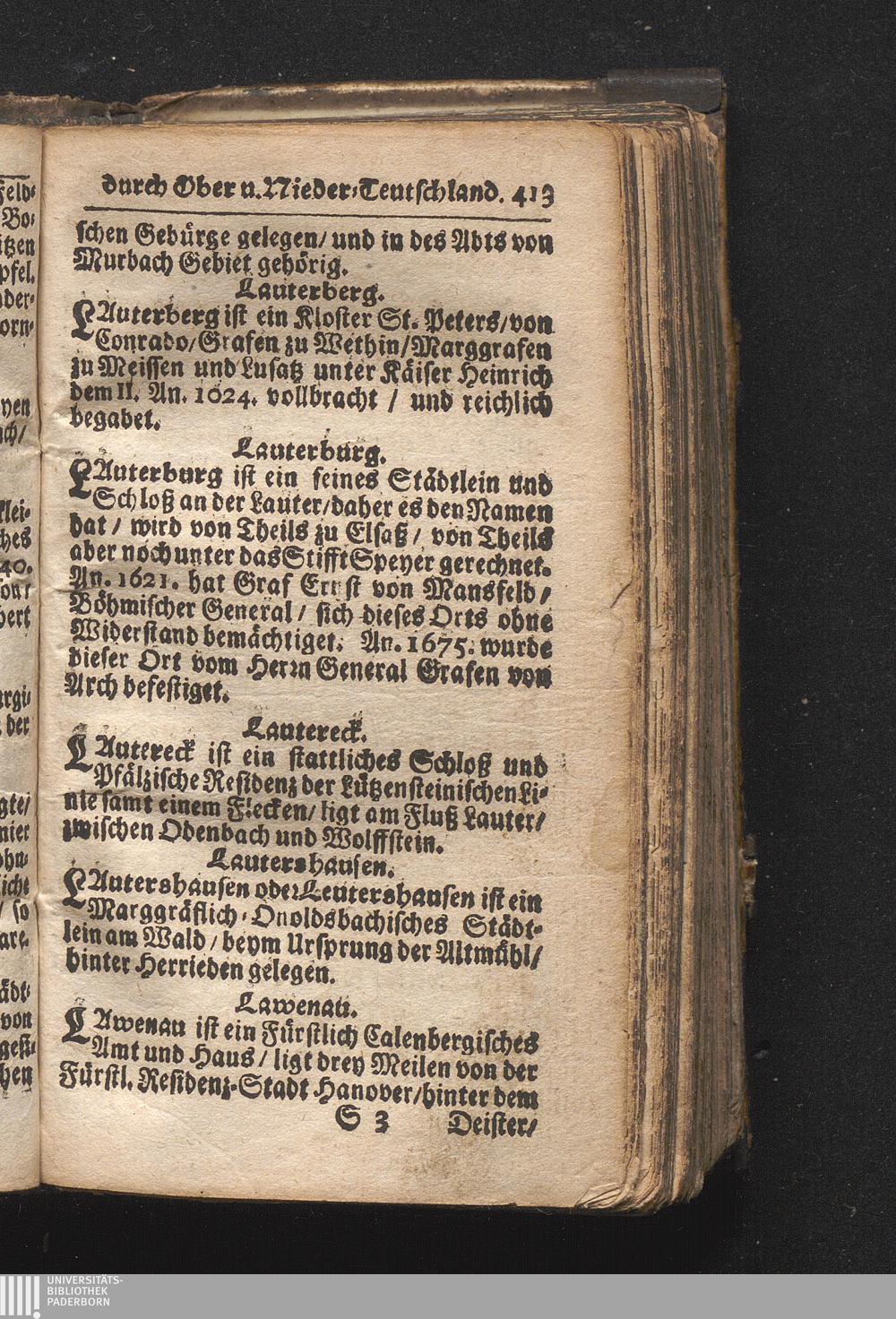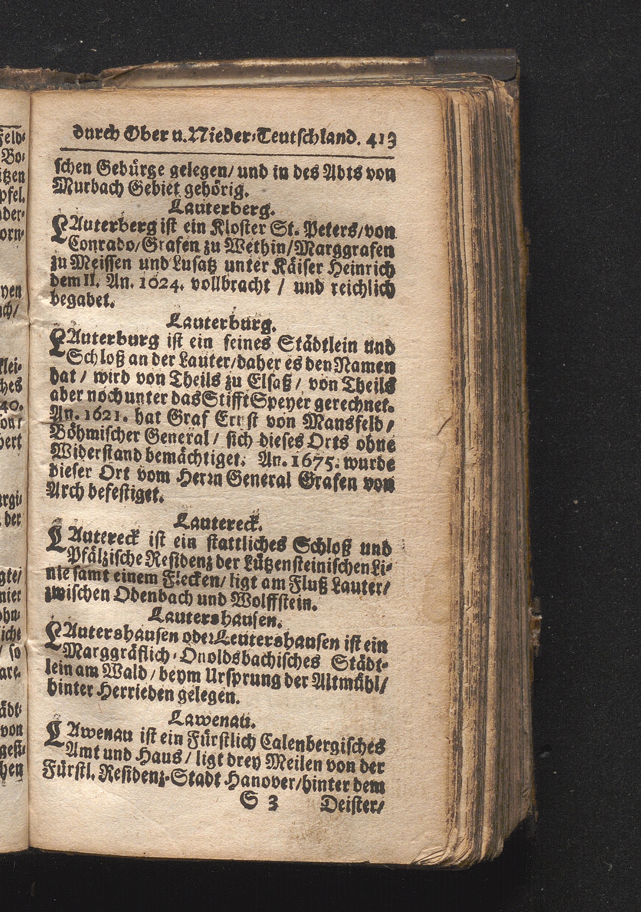Der getreue Reiß-Gefert durch Ober- und Nieder-Teutschland : Das ist: Grundrichtige und ausführliche Abhandlung derer jenigen Residenzien/ Städte/ Schlösser/ Vestungen/ Städtlein und nahmhafften Markflecken/ welche so wol in Ober- als Nieder-Teutschland/ einem Reisenden sich hin und wieder vorstellig machen und zwar solcher Gestalt/ daß darinn derer Ursprung/ Aufnahm/ Fortification/ Raritäten/ herrliche Gebäue/ und Glück- und Unglücks-Fälle bis auf gegenwärtige Zeit fortgesetzt enthalten. Dabey auch noch über das ein absonderlicher kurz-gefasster Weegweiser angehänget zu finden/ worinnen klärlich zu sehen, wie viel Meilen ein Ort von dem andern entlegen. Alles aus denen bewährtesten Scribenten hervorgesuchet/ zum Nutz-Ergötzen mitgetheilet ...