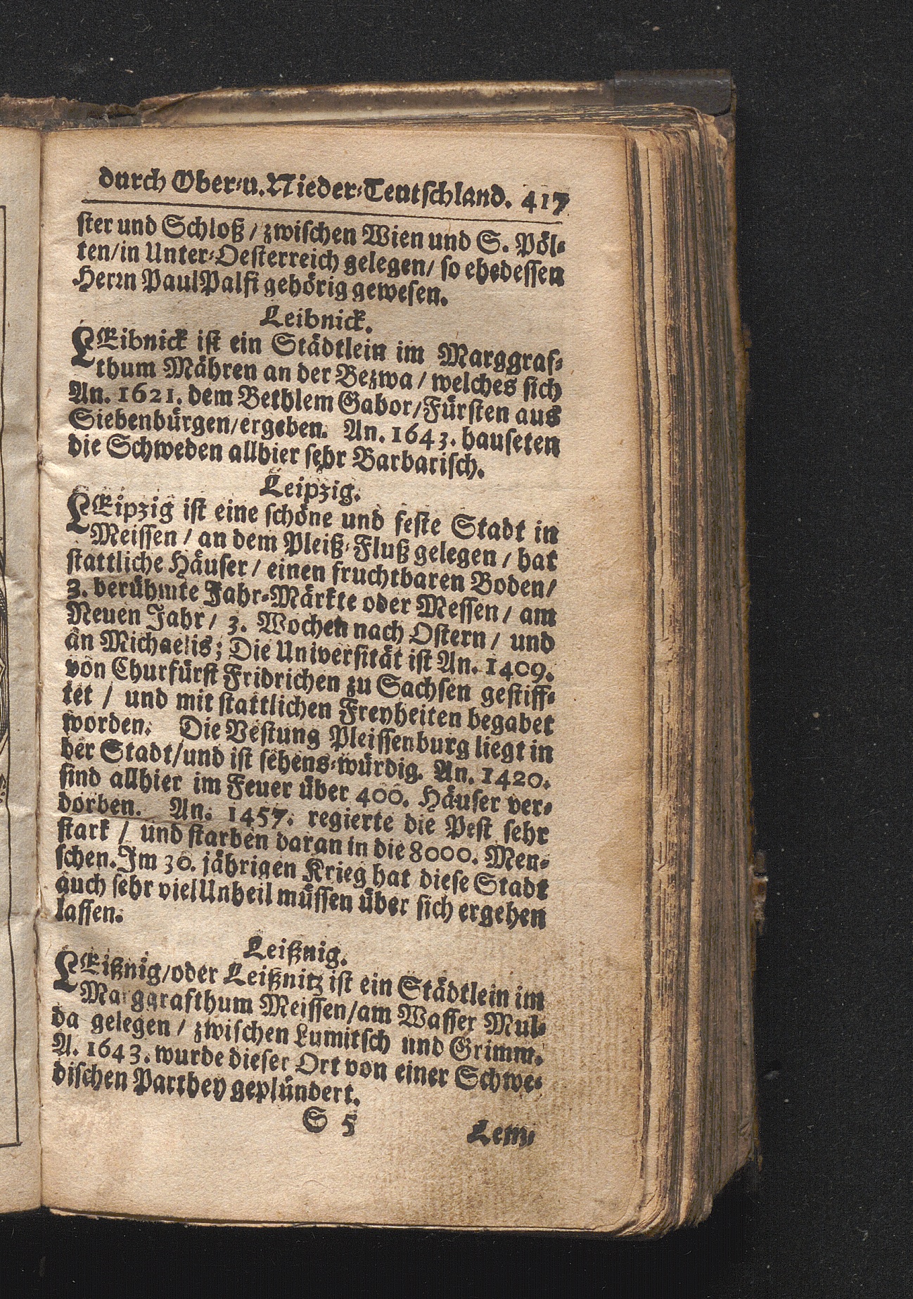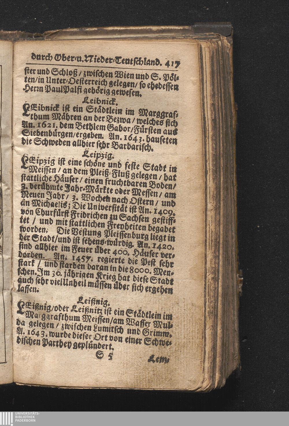 Der getreue Reiß-Gefert durch Ober- und Nieder-Teutschland : Das ist: Grundrichtige und ausführliche Abhandlung derer jenigen Residenzien/ Städte/ Schlösser/ Vestungen/ Städtlein und nahmhafften Markflecken/ welche so wol in Ober- als Nieder-Teutschland/ einem Reisenden sich hin und wieder vorstellig machen und zwar solcher Gestalt/ daß darinn derer Ursprung/ Aufnahm/ Fortification/ Raritäten/ herrliche Gebäue/ und Glück- und Unglücks-Fälle bis auf gegenwärtige Zeit fortgesetzt enthalten. Dabey auch noch über das ein absonderlicher kurz-gefasster Weegweiser angehänget zu finden/ worinnen klärlich zu sehen, wie viel Meilen ein Ort von dem andern entlegen. Alles aus denen bewährtesten Scribenten hervorgesuchet/ zum Nutz-Ergötzen mitgetheilet ...