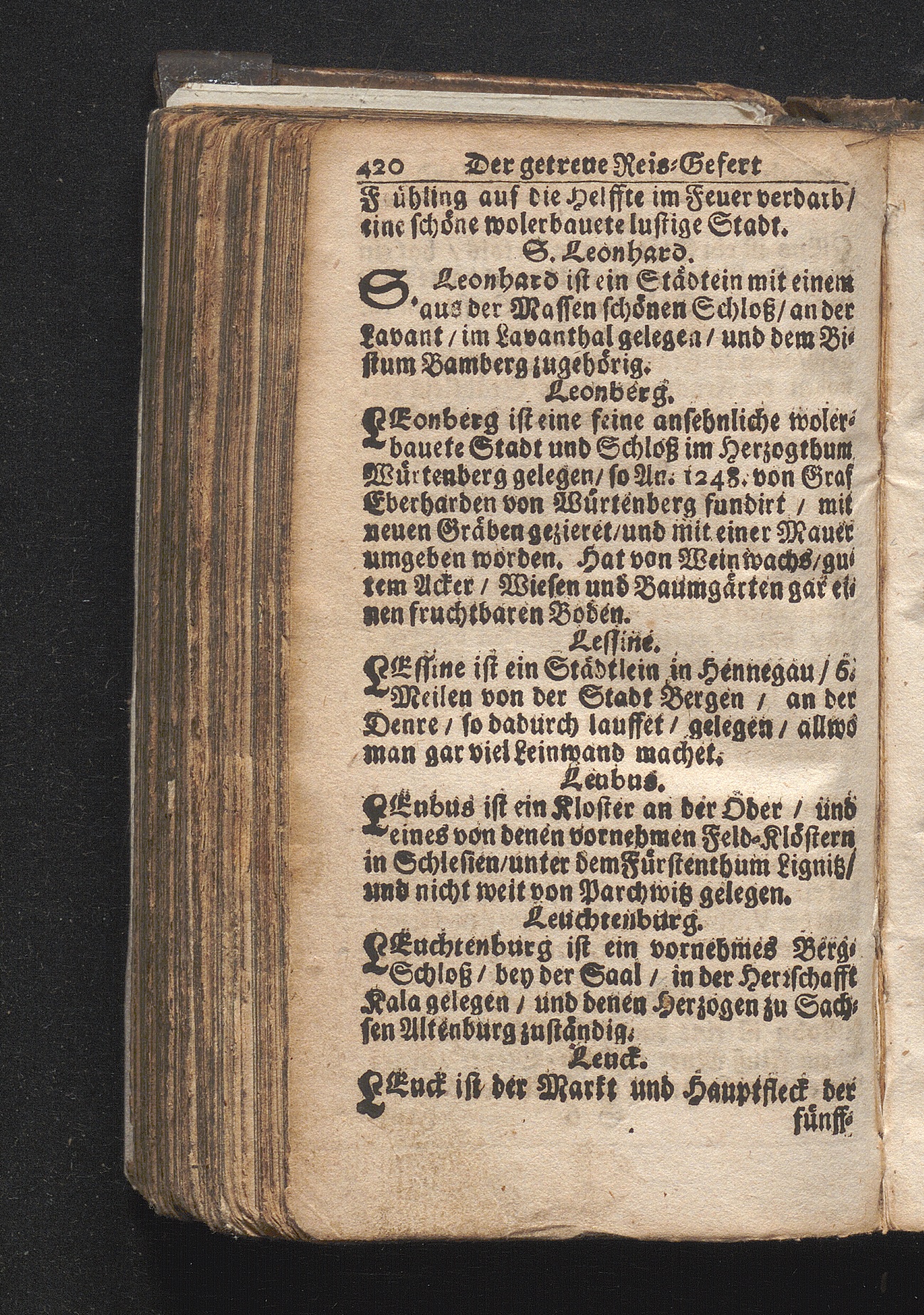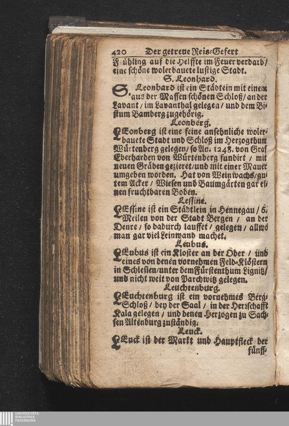 Der getreue Reiß-Gefert durch Ober- und Nieder-Teutschland : Das ist: Grundrichtige und ausführliche Abhandlung derer jenigen Residenzien/ Städte/ Schlösser/ Vestungen/ Städtlein und nahmhafften Markflecken/ welche so wol in Ober- als Nieder-Teutschland/ einem Reisenden sich hin und wieder vorstellig machen und zwar solcher Gestalt/ daß darinn derer Ursprung/ Aufnahm/ Fortification/ Raritäten/ herrliche Gebäue/ und Glück- und Unglücks-Fälle bis auf gegenwärtige Zeit fortgesetzt enthalten. Dabey auch noch über das ein absonderlicher kurz-gefasster Weegweiser angehänget zu finden/ worinnen klärlich zu sehen, wie viel Meilen ein Ort von dem andern entlegen. Alles aus denen bewährtesten Scribenten hervorgesuchet/ zum Nutz-Ergötzen mitgetheilet ...