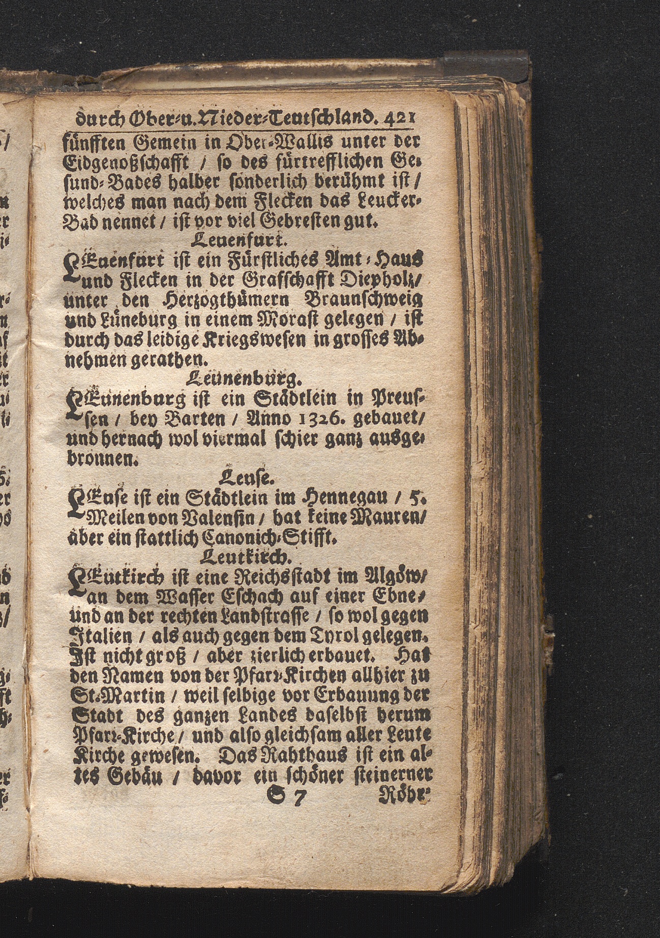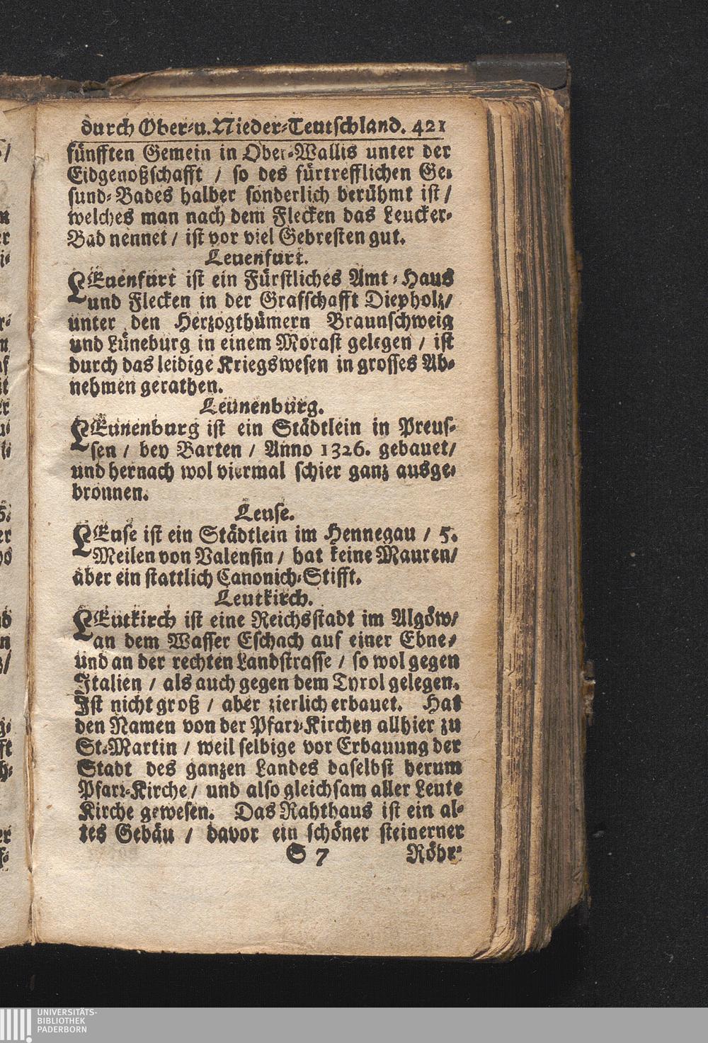 Der getreue Reiß-Gefert durch Ober- und Nieder-Teutschland : Das ist: Grundrichtige und ausführliche Abhandlung derer jenigen Residenzien/ Städte/ Schlösser/ Vestungen/ Städtlein und nahmhafften Markflecken/ welche so wol in Ober- als Nieder-Teutschland/ einem Reisenden sich hin und wieder vorstellig machen und zwar solcher Gestalt/ daß darinn derer Ursprung/ Aufnahm/ Fortification/ Raritäten/ herrliche Gebäue/ und Glück- und Unglücks-Fälle bis auf gegenwärtige Zeit fortgesetzt enthalten. Dabey auch noch über das ein absonderlicher kurz-gefasster Weegweiser angehänget zu finden/ worinnen klärlich zu sehen, wie viel Meilen ein Ort von dem andern entlegen. Alles aus denen bewährtesten Scribenten hervorgesuchet/ zum Nutz-Ergötzen mitgetheilet ...