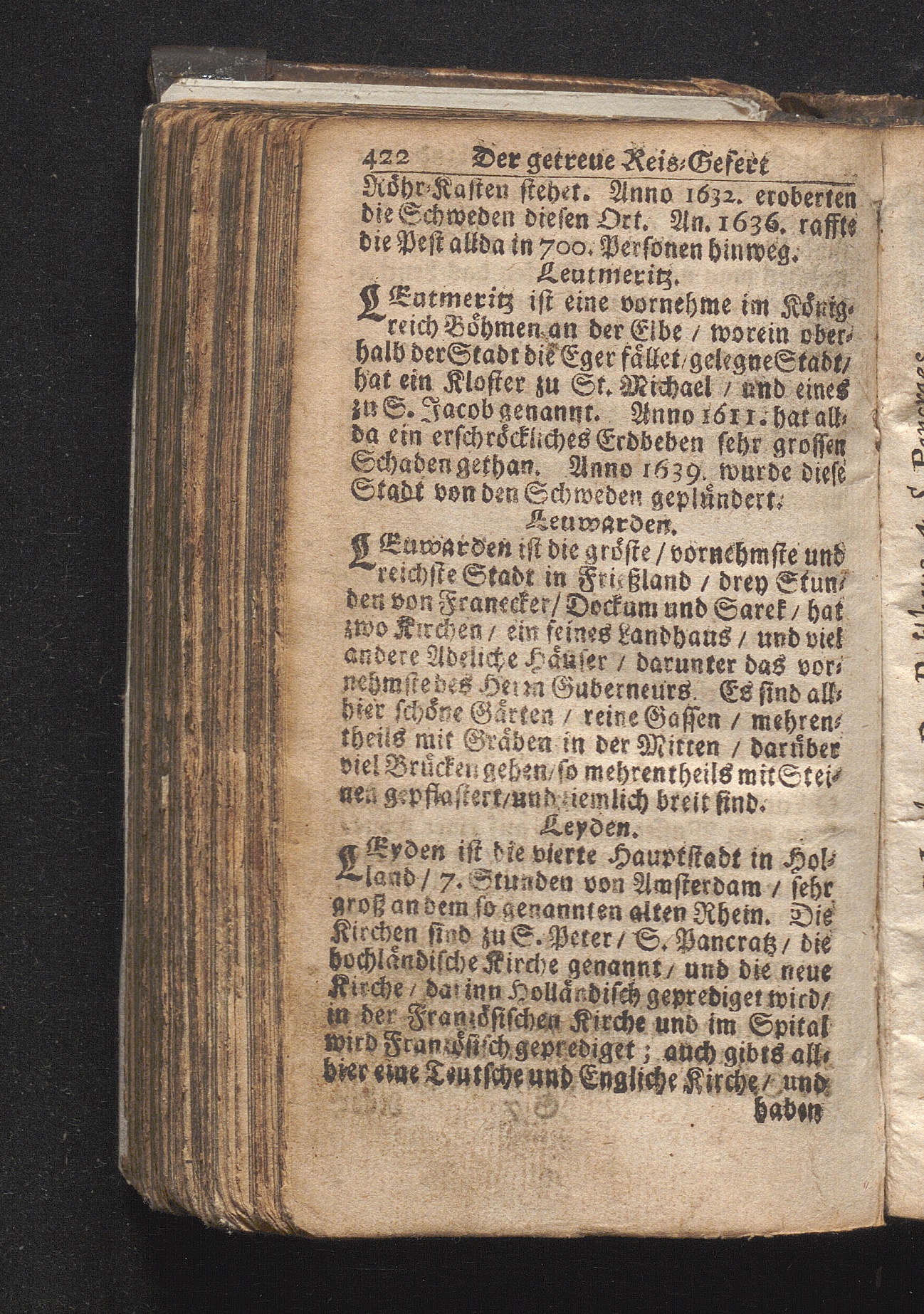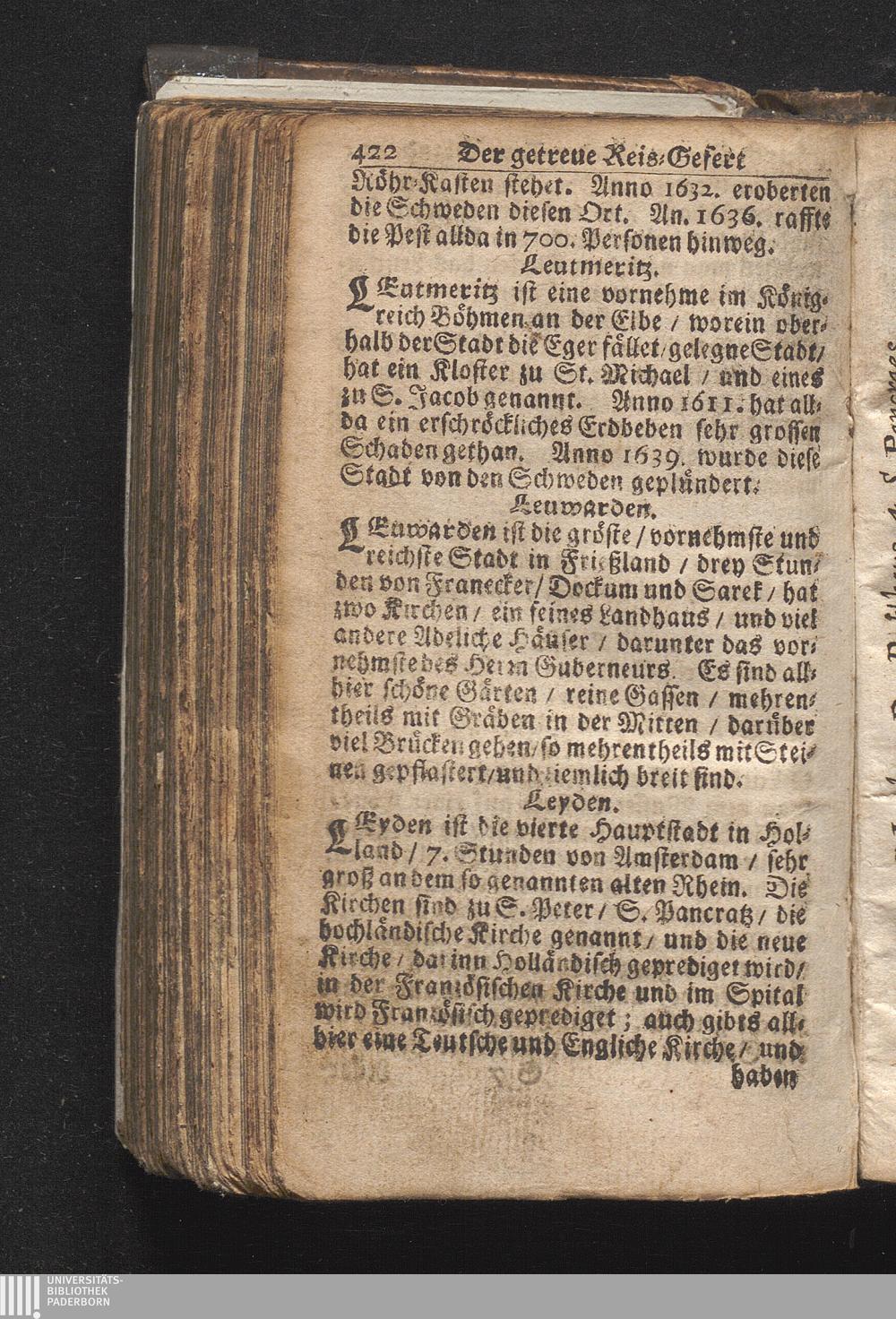 Der getreue Reiß-Gefert durch Ober- und Nieder-Teutschland : Das ist: Grundrichtige und ausführliche Abhandlung derer jenigen Residenzien/ Städte/ Schlösser/ Vestungen/ Städtlein und nahmhafften Markflecken/ welche so wol in Ober- als Nieder-Teutschland/ einem Reisenden sich hin und wieder vorstellig machen und zwar solcher Gestalt/ daß darinn derer Ursprung/ Aufnahm/ Fortification/ Raritäten/ herrliche Gebäue/ und Glück- und Unglücks-Fälle bis auf gegenwärtige Zeit fortgesetzt enthalten. Dabey auch noch über das ein absonderlicher kurz-gefasster Weegweiser angehänget zu finden/ worinnen klärlich zu sehen, wie viel Meilen ein Ort von dem andern entlegen. Alles aus denen bewährtesten Scribenten hervorgesuchet/ zum Nutz-Ergötzen mitgetheilet ...