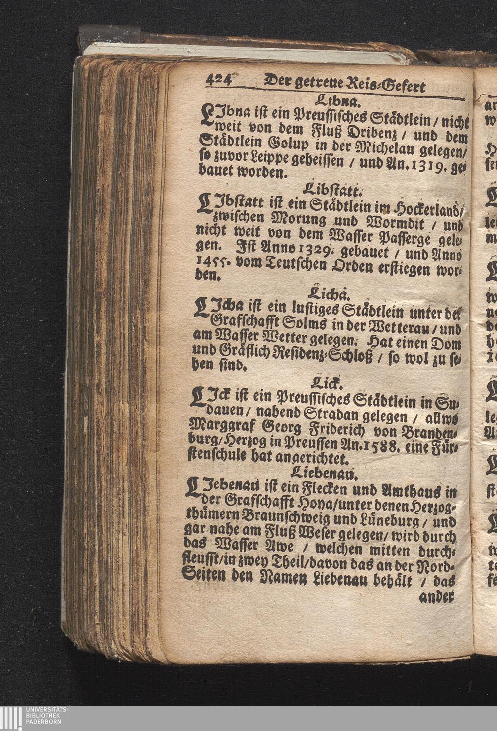 Der getreue Reiß-Gefert durch Ober- und Nieder-Teutschland : Das ist: Grundrichtige und ausführliche Abhandlung derer jenigen Residenzien/ Städte/ Schlösser/ Vestungen/ Städtlein und nahmhafften Markflecken/ welche so wol in Ober- als Nieder-Teutschland/ einem Reisenden sich hin und wieder vorstellig machen und zwar solcher Gestalt/ daß darinn derer Ursprung/ Aufnahm/ Fortification/ Raritäten/ herrliche Gebäue/ und Glück- und Unglücks-Fälle bis auf gegenwärtige Zeit fortgesetzt enthalten. Dabey auch noch über das ein absonderlicher kurz-gefasster Weegweiser angehänget zu finden/ worinnen klärlich zu sehen, wie viel Meilen ein Ort von dem andern entlegen. Alles aus denen bewährtesten Scribenten hervorgesuchet/ zum Nutz-Ergötzen mitgetheilet ...