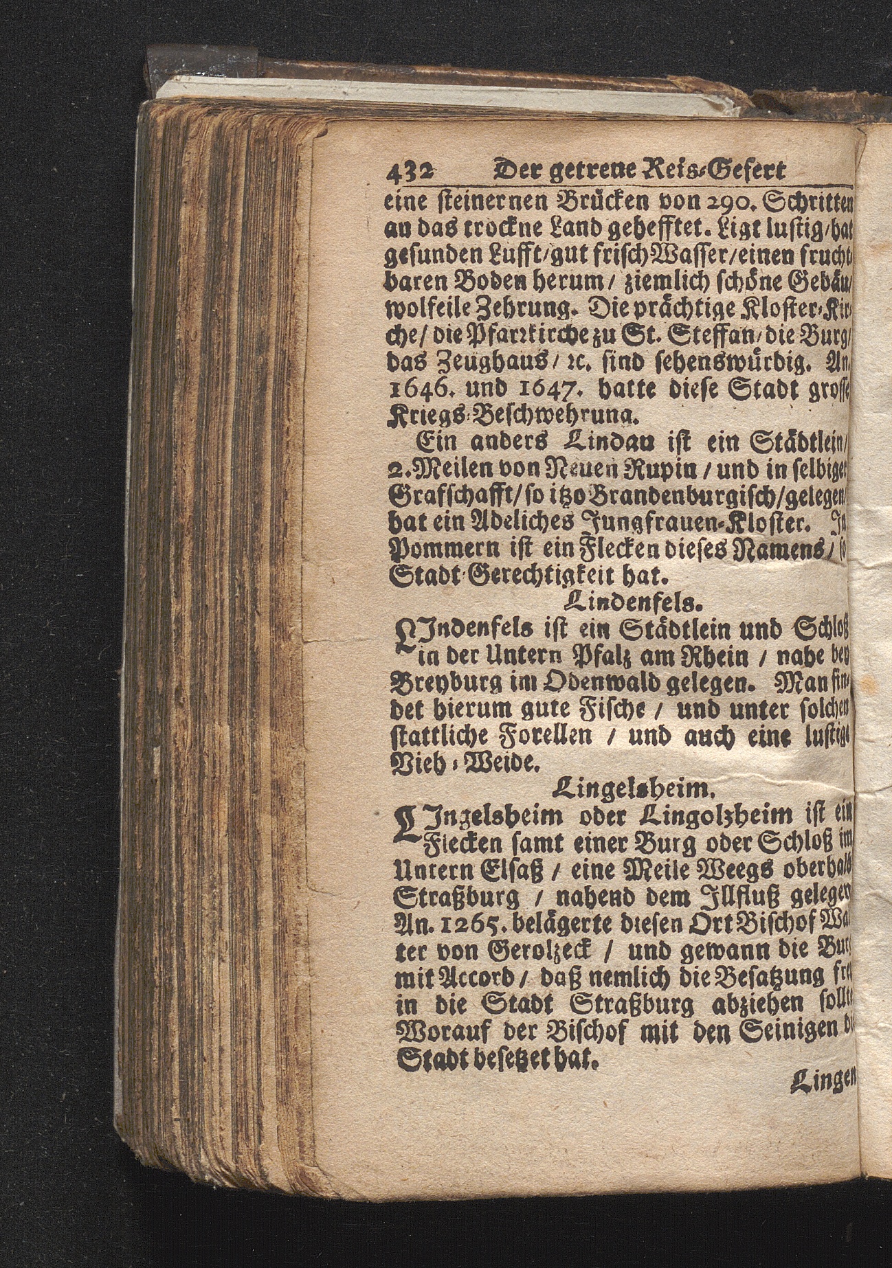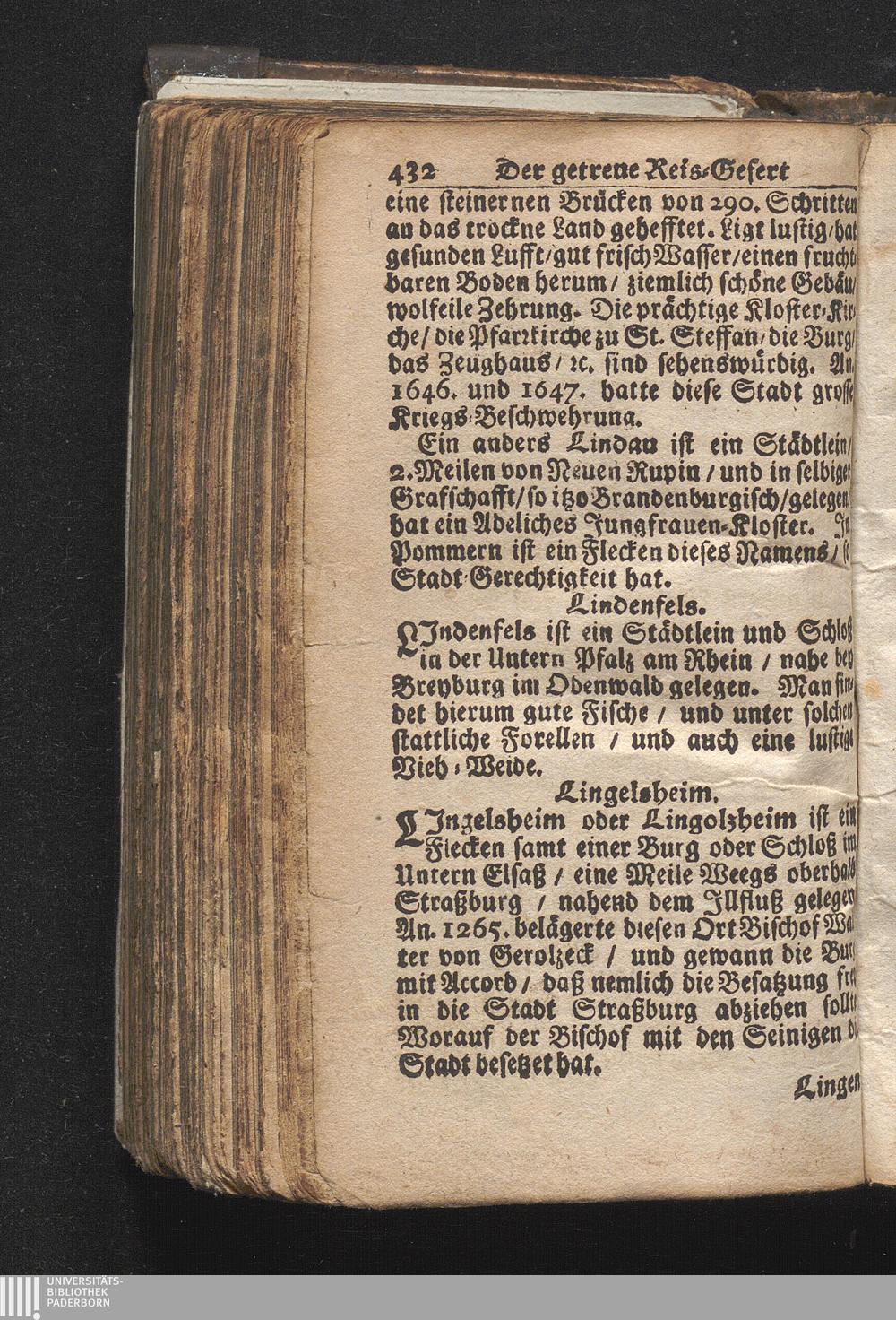 Der getreue Reiß-Gefert durch Ober- und Nieder-Teutschland : Das ist: Grundrichtige und ausführliche Abhandlung derer jenigen Residenzien/ Städte/ Schlösser/ Vestungen/ Städtlein und nahmhafften Markflecken/ welche so wol in Ober- als Nieder-Teutschland/ einem Reisenden sich hin und wieder vorstellig machen und zwar solcher Gestalt/ daß darinn derer Ursprung/ Aufnahm/ Fortification/ Raritäten/ herrliche Gebäue/ und Glück- und Unglücks-Fälle bis auf gegenwärtige Zeit fortgesetzt enthalten. Dabey auch noch über das ein absonderlicher kurz-gefasster Weegweiser angehänget zu finden/ worinnen klärlich zu sehen, wie viel Meilen ein Ort von dem andern entlegen. Alles aus denen bewährtesten Scribenten hervorgesuchet/ zum Nutz-Ergötzen mitgetheilet ...