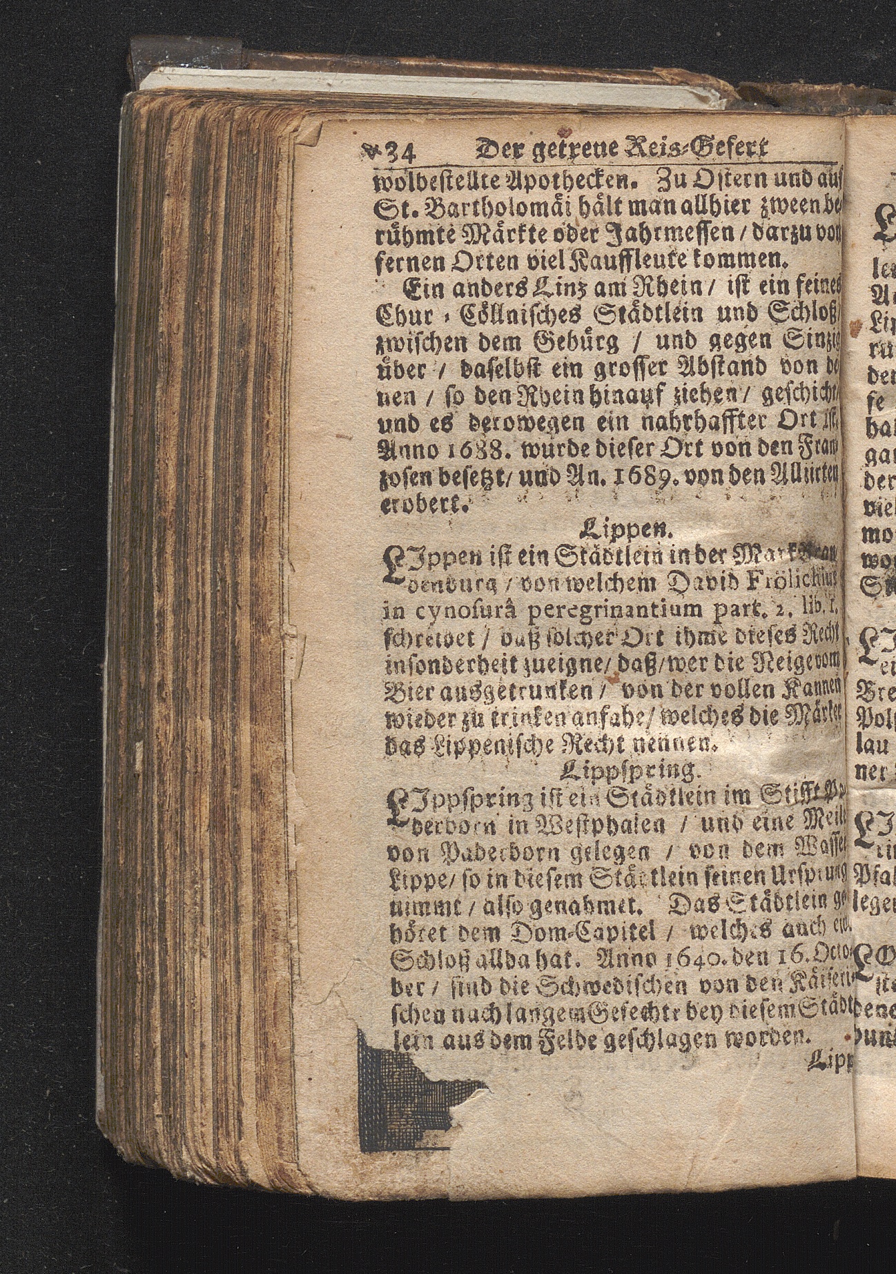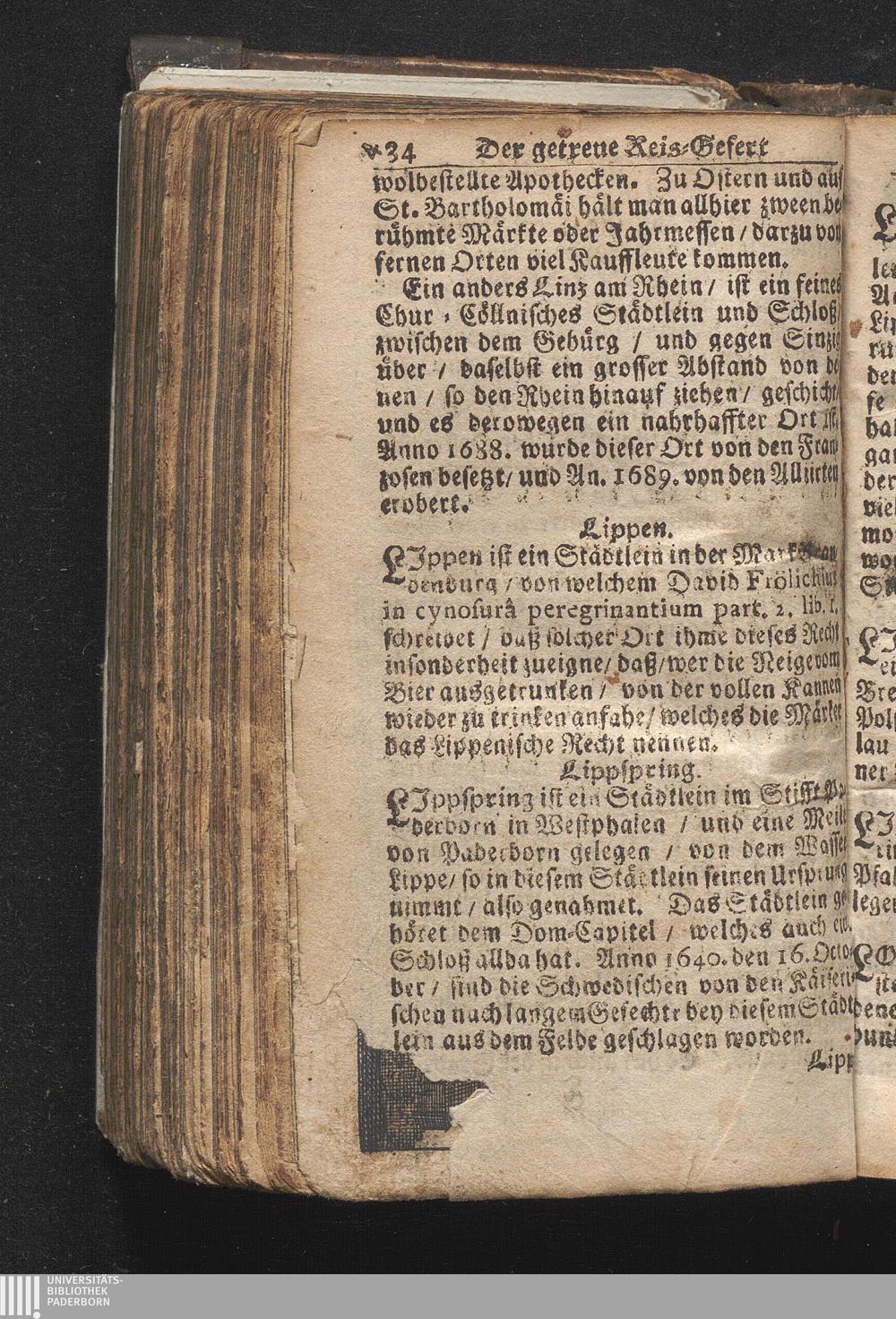 Der getreue Reiß-Gefert durch Ober- und Nieder-Teutschland : Das ist: Grundrichtige und ausführliche Abhandlung derer jenigen Residenzien/ Städte/ Schlösser/ Vestungen/ Städtlein und nahmhafften Markflecken/ welche so wol in Ober- als Nieder-Teutschland/ einem Reisenden sich hin und wieder vorstellig machen und zwar solcher Gestalt/ daß darinn derer Ursprung/ Aufnahm/ Fortification/ Raritäten/ herrliche Gebäue/ und Glück- und Unglücks-Fälle bis auf gegenwärtige Zeit fortgesetzt enthalten. Dabey auch noch über das ein absonderlicher kurz-gefasster Weegweiser angehänget zu finden/ worinnen klärlich zu sehen, wie viel Meilen ein Ort von dem andern entlegen. Alles aus denen bewährtesten Scribenten hervorgesuchet/ zum Nutz-Ergötzen mitgetheilet ...