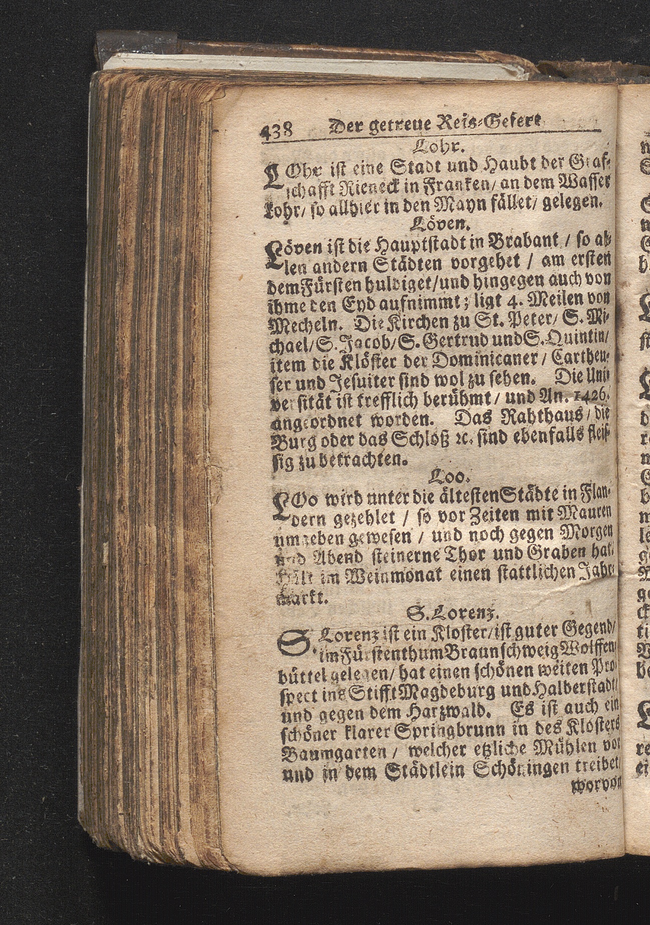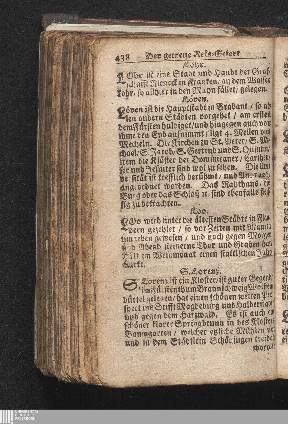 Der getreue Reiß-Gefert durch Ober- und Nieder-Teutschland : Das ist: Grundrichtige und ausführliche Abhandlung derer jenigen Residenzien/ Städte/ Schlösser/ Vestungen/ Städtlein und nahmhafften Markflecken/ welche so wol in Ober- als Nieder-Teutschland/ einem Reisenden sich hin und wieder vorstellig machen und zwar solcher Gestalt/ daß darinn derer Ursprung/ Aufnahm/ Fortification/ Raritäten/ herrliche Gebäue/ und Glück- und Unglücks-Fälle bis auf gegenwärtige Zeit fortgesetzt enthalten. Dabey auch noch über das ein absonderlicher kurz-gefasster Weegweiser angehänget zu finden/ worinnen klärlich zu sehen, wie viel Meilen ein Ort von dem andern entlegen. Alles aus denen bewährtesten Scribenten hervorgesuchet/ zum Nutz-Ergötzen mitgetheilet ...