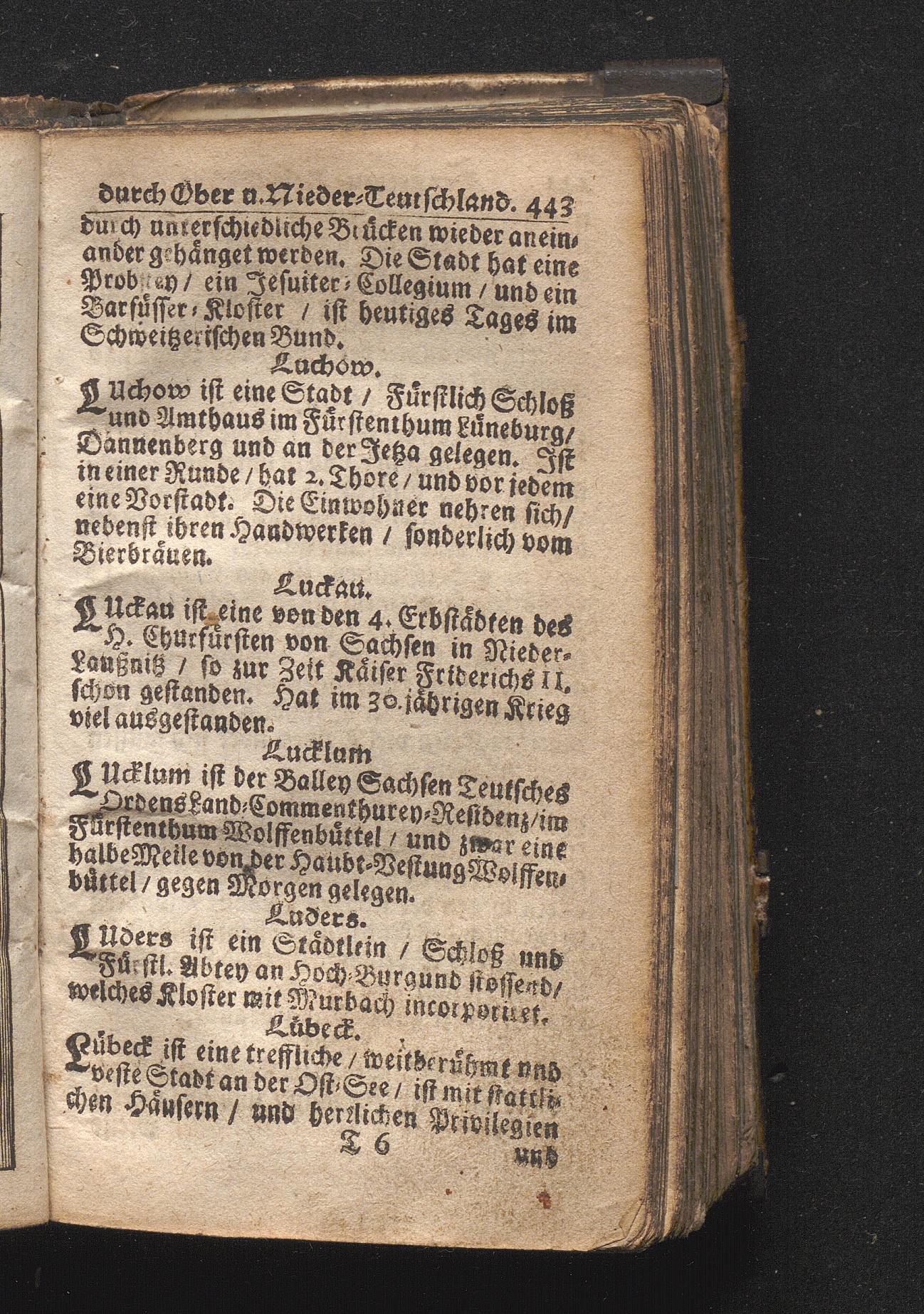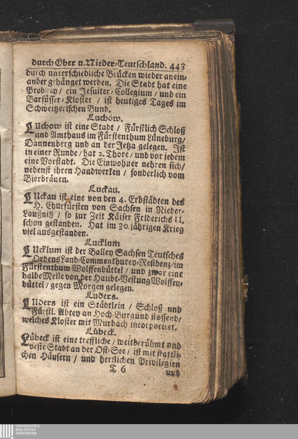Der getreue Reiß-Gefert durch Ober- und Nieder-Teutschland : Das ist: Grundrichtige und ausführliche Abhandlung derer jenigen Residenzien/ Städte/ Schlösser/ Vestungen/ Städtlein und nahmhafften Markflecken/ welche so wol in Ober- als Nieder-Teutschland/ einem Reisenden sich hin und wieder vorstellig machen und zwar solcher Gestalt/ daß darinn derer Ursprung/ Aufnahm/ Fortification/ Raritäten/ herrliche Gebäue/ und Glück- und Unglücks-Fälle bis auf gegenwärtige Zeit fortgesetzt enthalten. Dabey auch noch über das ein absonderlicher kurz-gefasster Weegweiser angehänget zu finden/ worinnen klärlich zu sehen, wie viel Meilen ein Ort von dem andern entlegen. Alles aus denen bewährtesten Scribenten hervorgesuchet/ zum Nutz-Ergötzen mitgetheilet ...