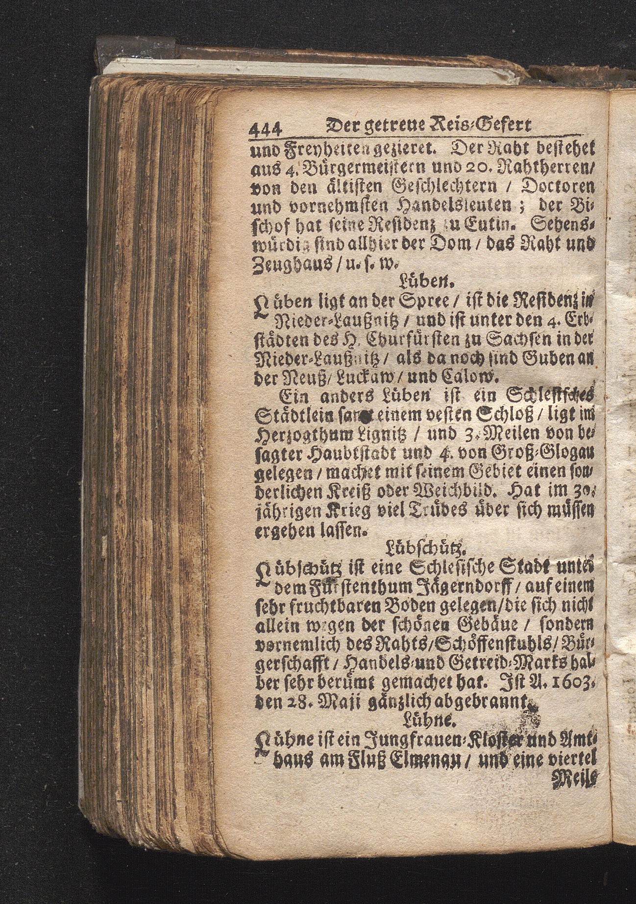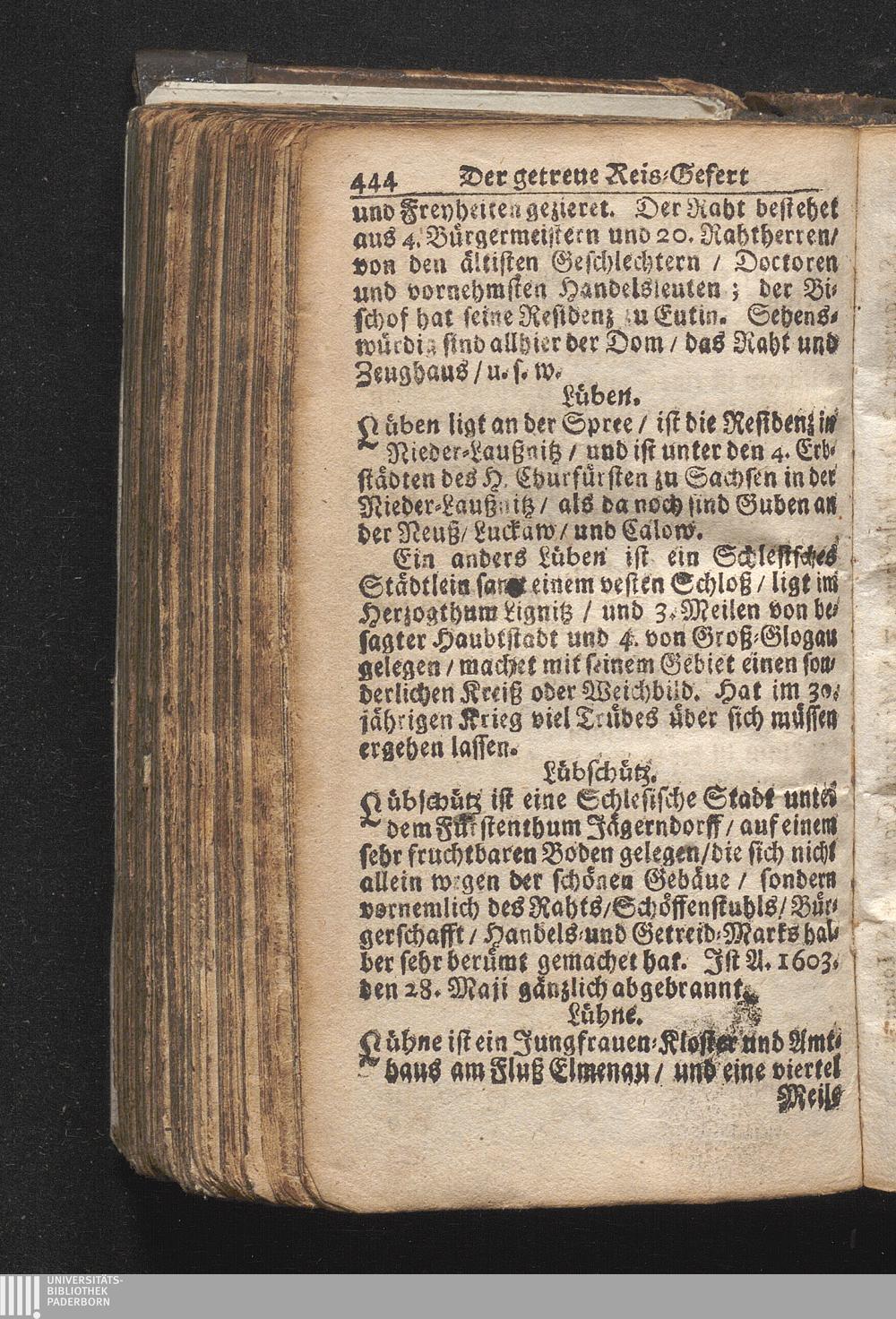 Der getreue Reiß-Gefert durch Ober- und Nieder-Teutschland : Das ist: Grundrichtige und ausführliche Abhandlung derer jenigen Residenzien/ Städte/ Schlösser/ Vestungen/ Städtlein und nahmhafften Markflecken/ welche so wol in Ober- als Nieder-Teutschland/ einem Reisenden sich hin und wieder vorstellig machen und zwar solcher Gestalt/ daß darinn derer Ursprung/ Aufnahm/ Fortification/ Raritäten/ herrliche Gebäue/ und Glück- und Unglücks-Fälle bis auf gegenwärtige Zeit fortgesetzt enthalten. Dabey auch noch über das ein absonderlicher kurz-gefasster Weegweiser angehänget zu finden/ worinnen klärlich zu sehen, wie viel Meilen ein Ort von dem andern entlegen. Alles aus denen bewährtesten Scribenten hervorgesuchet/ zum Nutz-Ergötzen mitgetheilet ...