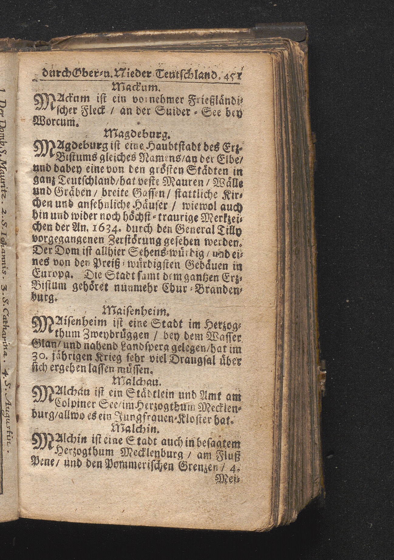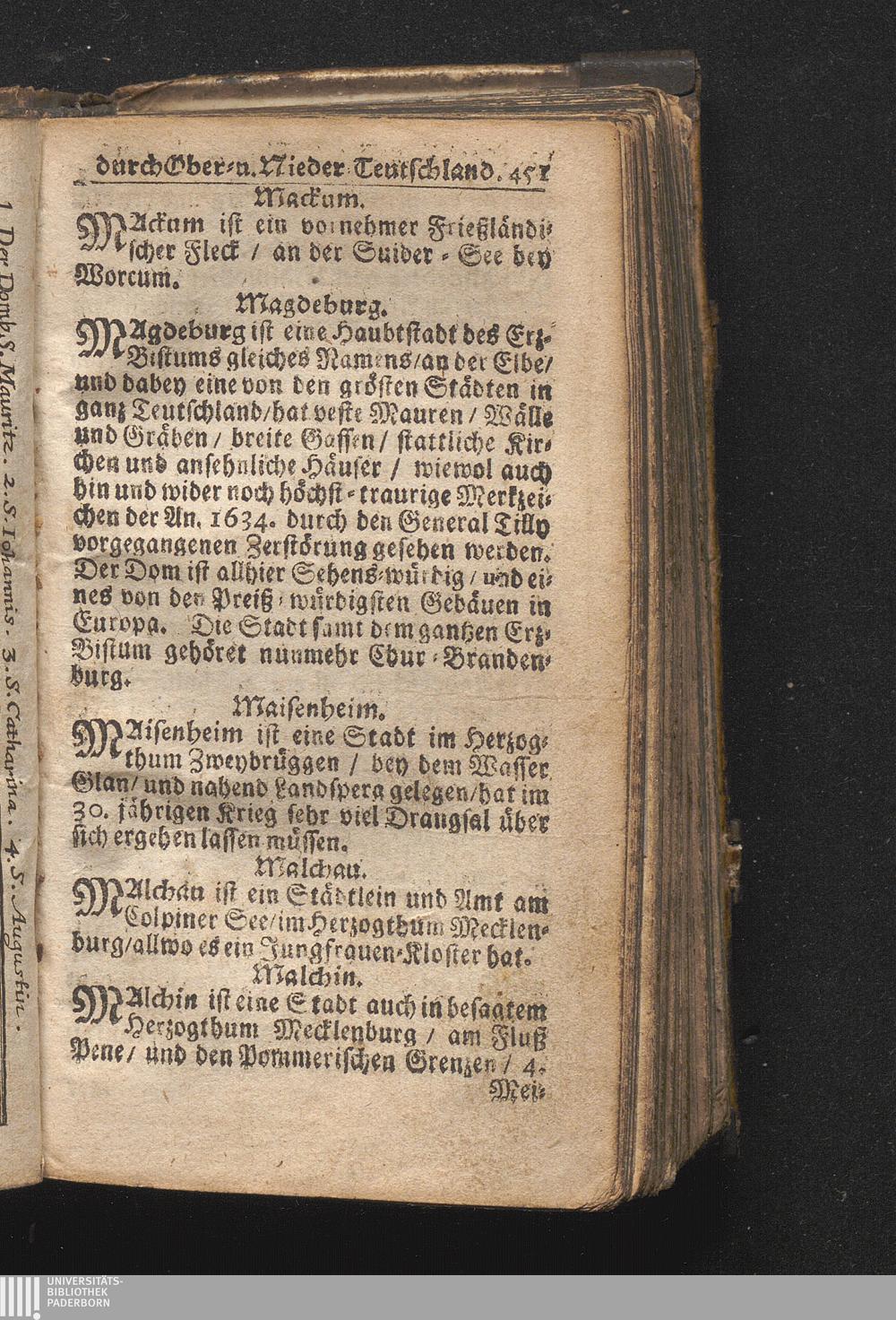 Der getreue Reiß-Gefert durch Ober- und Nieder-Teutschland : Das ist: Grundrichtige und ausführliche Abhandlung derer jenigen Residenzien/ Städte/ Schlösser/ Vestungen/ Städtlein und nahmhafften Markflecken/ welche so wol in Ober- als Nieder-Teutschland/ einem Reisenden sich hin und wieder vorstellig machen und zwar solcher Gestalt/ daß darinn derer Ursprung/ Aufnahm/ Fortification/ Raritäten/ herrliche Gebäue/ und Glück- und Unglücks-Fälle bis auf gegenwärtige Zeit fortgesetzt enthalten. Dabey auch noch über das ein absonderlicher kurz-gefasster Weegweiser angehänget zu finden/ worinnen klärlich zu sehen, wie viel Meilen ein Ort von dem andern entlegen. Alles aus denen bewährtesten Scribenten hervorgesuchet/ zum Nutz-Ergötzen mitgetheilet ...