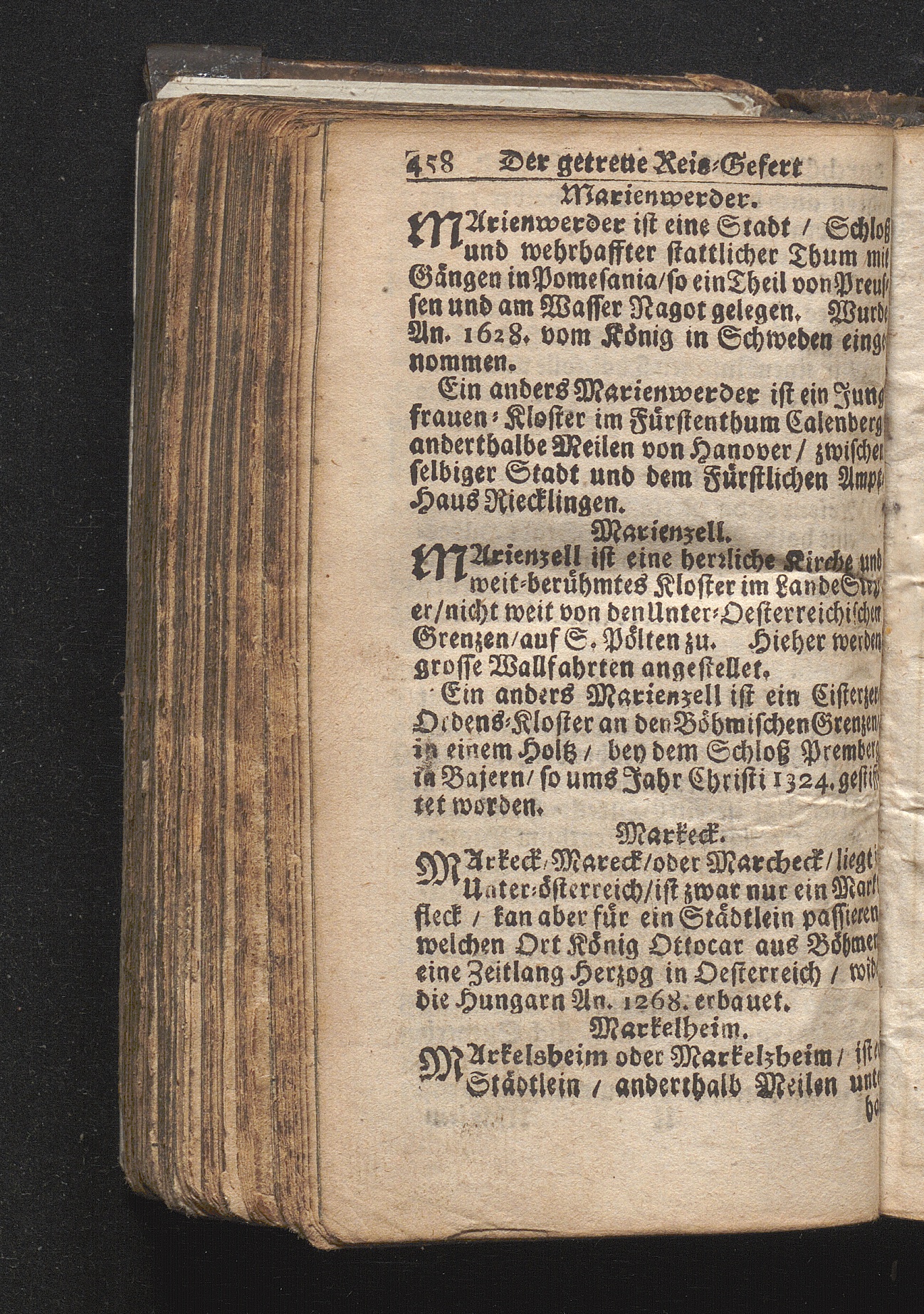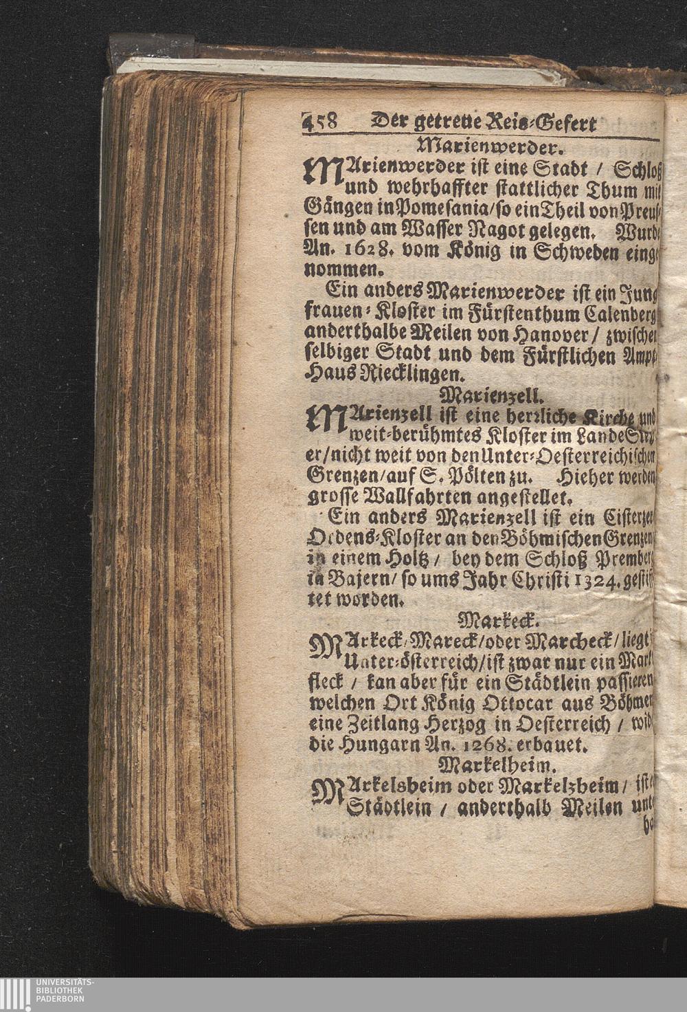 Der getreue Reiß-Gefert durch Ober- und Nieder-Teutschland : Das ist: Grundrichtige und ausführliche Abhandlung derer jenigen Residenzien/ Städte/ Schlösser/ Vestungen/ Städtlein und nahmhafften Markflecken/ welche so wol in Ober- als Nieder-Teutschland/ einem Reisenden sich hin und wieder vorstellig machen und zwar solcher Gestalt/ daß darinn derer Ursprung/ Aufnahm/ Fortification/ Raritäten/ herrliche Gebäue/ und Glück- und Unglücks-Fälle bis auf gegenwärtige Zeit fortgesetzt enthalten. Dabey auch noch über das ein absonderlicher kurz-gefasster Weegweiser angehänget zu finden/ worinnen klärlich zu sehen, wie viel Meilen ein Ort von dem andern entlegen. Alles aus denen bewährtesten Scribenten hervorgesuchet/ zum Nutz-Ergötzen mitgetheilet ...