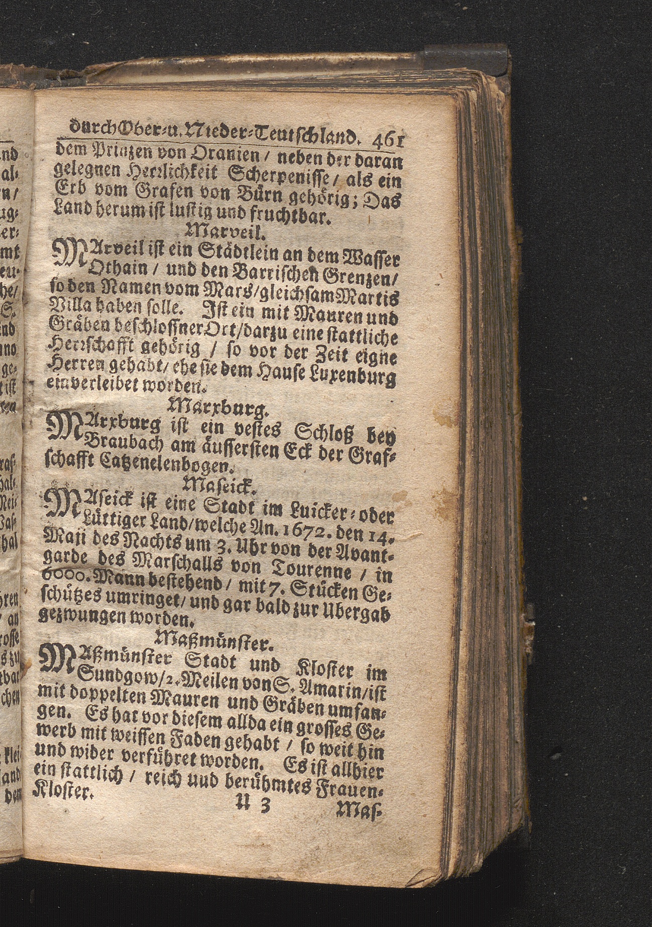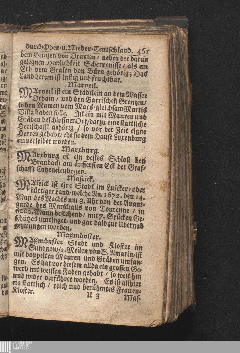 Der getreue Reiß-Gefert durch Ober- und Nieder-Teutschland : Das ist: Grundrichtige und ausführliche Abhandlung derer jenigen Residenzien/ Städte/ Schlösser/ Vestungen/ Städtlein und nahmhafften Markflecken/ welche so wol in Ober- als Nieder-Teutschland/ einem Reisenden sich hin und wieder vorstellig machen und zwar solcher Gestalt/ daß darinn derer Ursprung/ Aufnahm/ Fortification/ Raritäten/ herrliche Gebäue/ und Glück- und Unglücks-Fälle bis auf gegenwärtige Zeit fortgesetzt enthalten. Dabey auch noch über das ein absonderlicher kurz-gefasster Weegweiser angehänget zu finden/ worinnen klärlich zu sehen, wie viel Meilen ein Ort von dem andern entlegen. Alles aus denen bewährtesten Scribenten hervorgesuchet/ zum Nutz-Ergötzen mitgetheilet ...