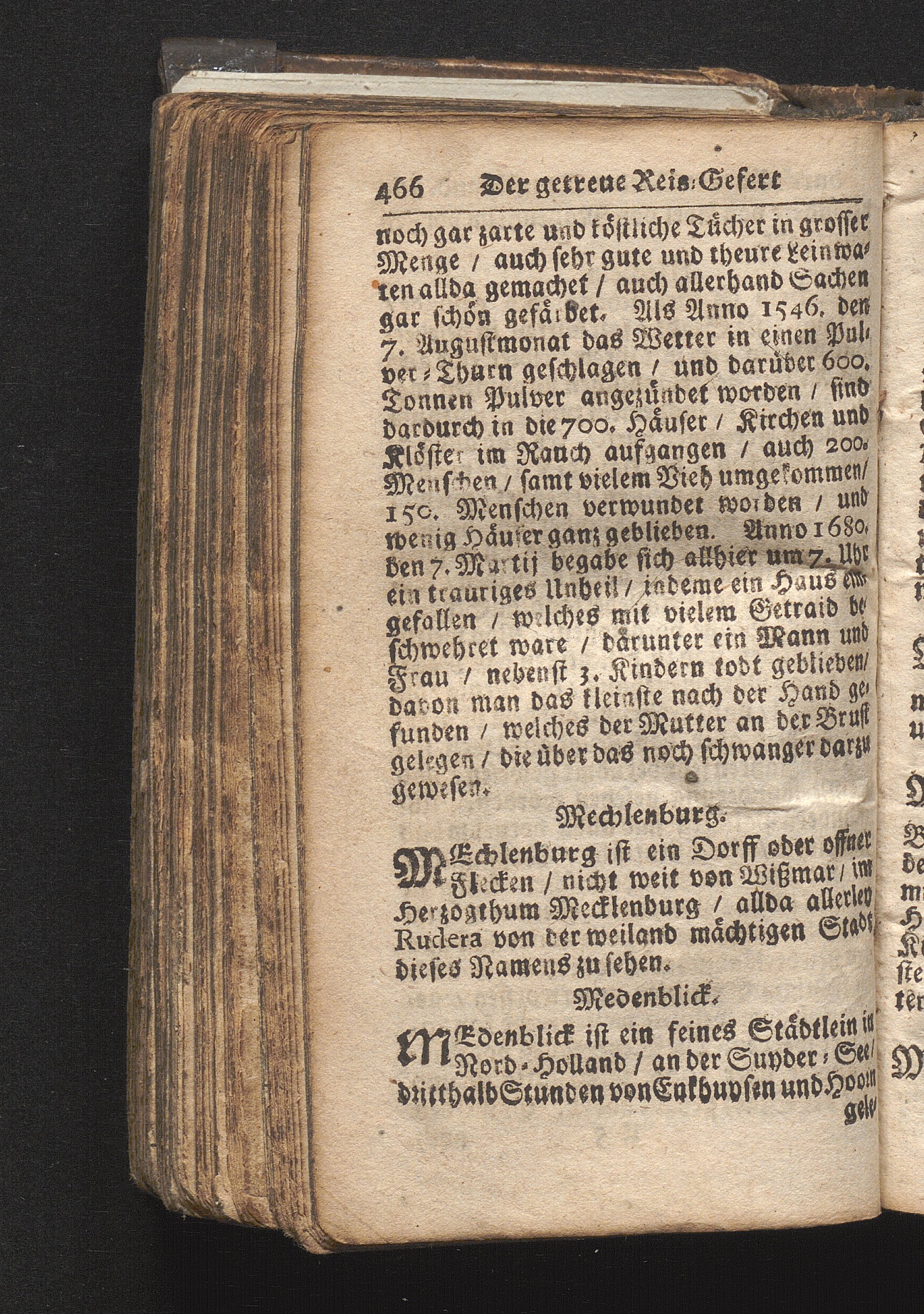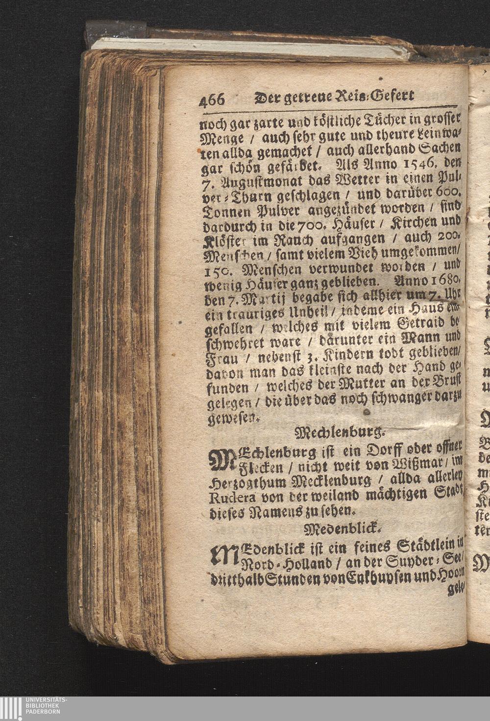 Der getreue Reiß-Gefert durch Ober- und Nieder-Teutschland : Das ist: Grundrichtige und ausführliche Abhandlung derer jenigen Residenzien/ Städte/ Schlösser/ Vestungen/ Städtlein und nahmhafften Markflecken/ welche so wol in Ober- als Nieder-Teutschland/ einem Reisenden sich hin und wieder vorstellig machen und zwar solcher Gestalt/ daß darinn derer Ursprung/ Aufnahm/ Fortification/ Raritäten/ herrliche Gebäue/ und Glück- und Unglücks-Fälle bis auf gegenwärtige Zeit fortgesetzt enthalten. Dabey auch noch über das ein absonderlicher kurz-gefasster Weegweiser angehänget zu finden/ worinnen klärlich zu sehen, wie viel Meilen ein Ort von dem andern entlegen. Alles aus denen bewährtesten Scribenten hervorgesuchet/ zum Nutz-Ergötzen mitgetheilet ...