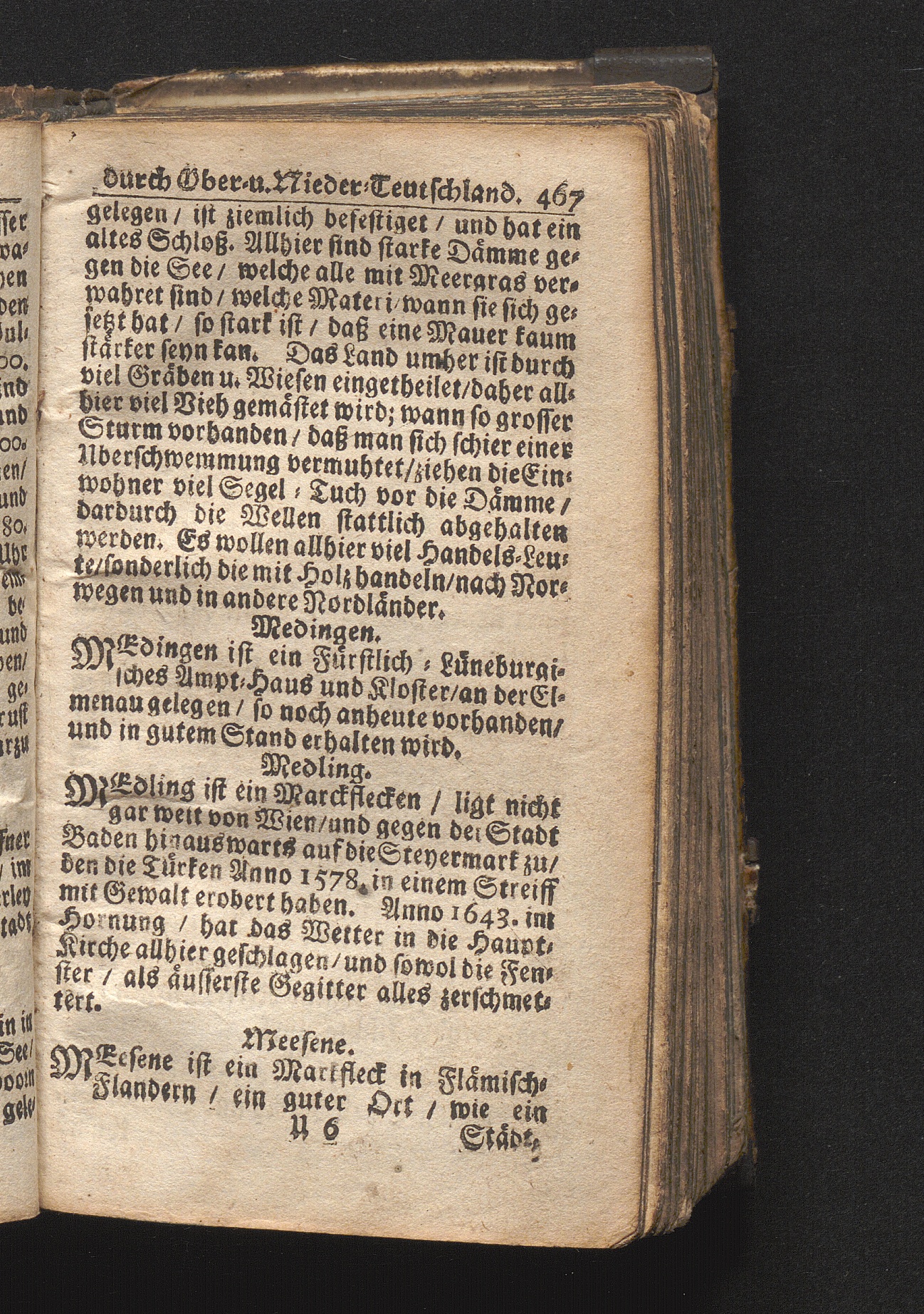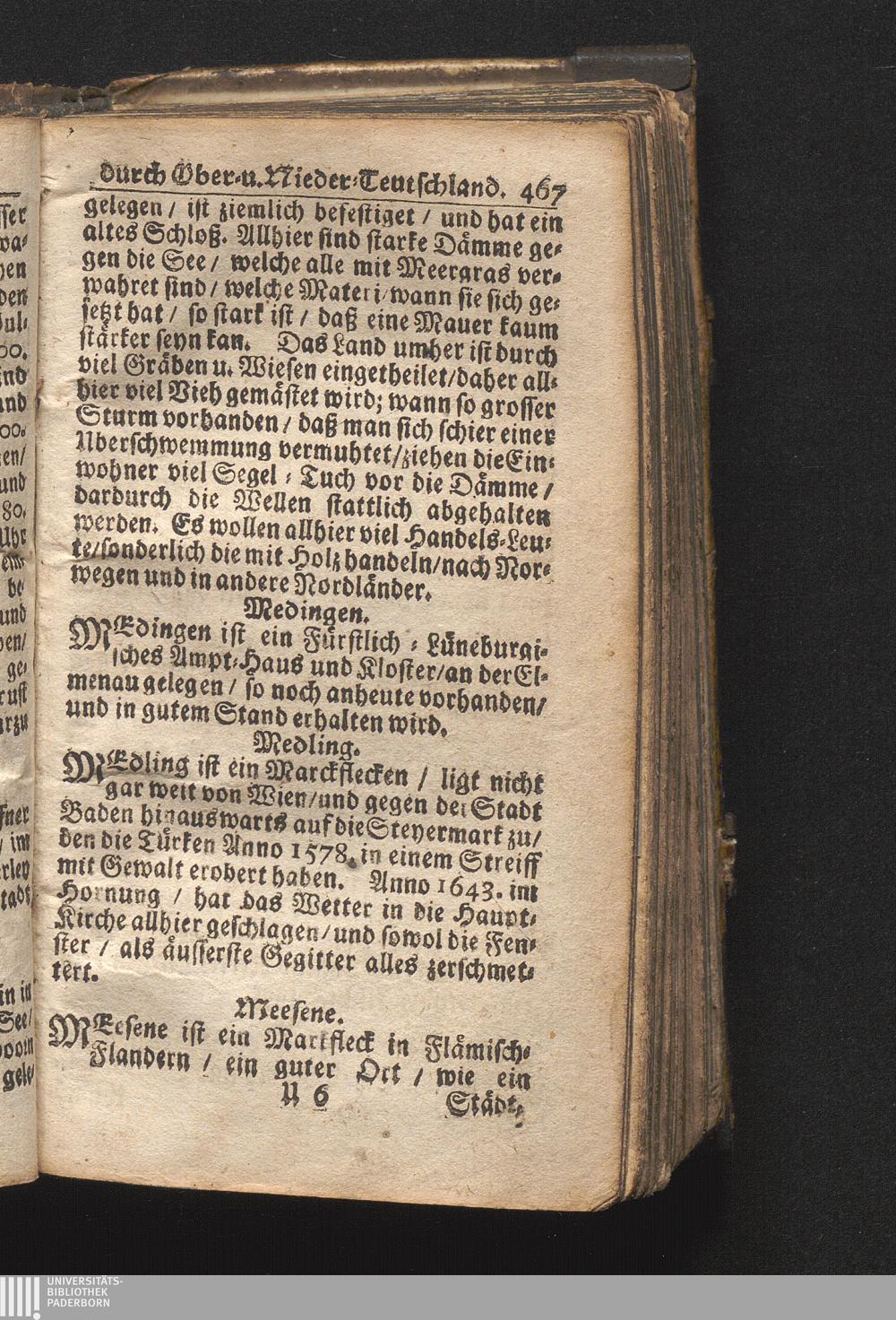Der getreue Reiß-Gefert durch Ober- und Nieder-Teutschland : Das ist: Grundrichtige und ausführliche Abhandlung derer jenigen Residenzien/ Städte/ Schlösser/ Vestungen/ Städtlein und nahmhafften Markflecken/ welche so wol in Ober- als Nieder-Teutschland/ einem Reisenden sich hin und wieder vorstellig machen und zwar solcher Gestalt/ daß darinn derer Ursprung/ Aufnahm/ Fortification/ Raritäten/ herrliche Gebäue/ und Glück- und Unglücks-Fälle bis auf gegenwärtige Zeit fortgesetzt enthalten. Dabey auch noch über das ein absonderlicher kurz-gefasster Weegweiser angehänget zu finden/ worinnen klärlich zu sehen, wie viel Meilen ein Ort von dem andern entlegen. Alles aus denen bewährtesten Scribenten hervorgesuchet/ zum Nutz-Ergötzen mitgetheilet ...