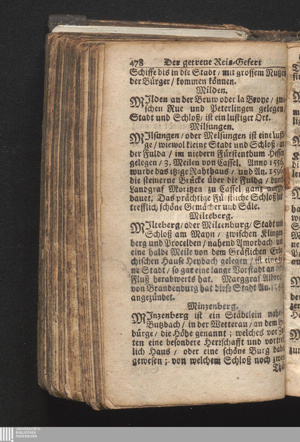 Der getreue Reiß-Gefert durch Ober- und Nieder-Teutschland : Das ist: Grundrichtige und ausführliche Abhandlung derer jenigen Residenzien/ Städte/ Schlösser/ Vestungen/ Städtlein und nahmhafften Markflecken/ welche so wol in Ober- als Nieder-Teutschland/ einem Reisenden sich hin und wieder vorstellig machen und zwar solcher Gestalt/ daß darinn derer Ursprung/ Aufnahm/ Fortification/ Raritäten/ herrliche Gebäue/ und Glück- und Unglücks-Fälle bis auf gegenwärtige Zeit fortgesetzt enthalten. Dabey auch noch über das ein absonderlicher kurz-gefasster Weegweiser angehänget zu finden/ worinnen klärlich zu sehen, wie viel Meilen ein Ort von dem andern entlegen. Alles aus denen bewährtesten Scribenten hervorgesuchet/ zum Nutz-Ergötzen mitgetheilet ...