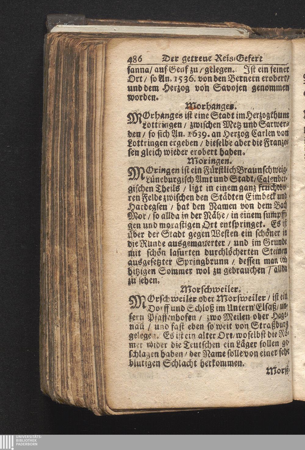 Der getreue Reiß-Gefert durch Ober- und Nieder-Teutschland : Das ist: Grundrichtige und ausführliche Abhandlung derer jenigen Residenzien/ Städte/ Schlösser/ Vestungen/ Städtlein und nahmhafften Markflecken/ welche so wol in Ober- als Nieder-Teutschland/ einem Reisenden sich hin und wieder vorstellig machen und zwar solcher Gestalt/ daß darinn derer Ursprung/ Aufnahm/ Fortification/ Raritäten/ herrliche Gebäue/ und Glück- und Unglücks-Fälle bis auf gegenwärtige Zeit fortgesetzt enthalten. Dabey auch noch über das ein absonderlicher kurz-gefasster Weegweiser angehänget zu finden/ worinnen klärlich zu sehen, wie viel Meilen ein Ort von dem andern entlegen. Alles aus denen bewährtesten Scribenten hervorgesuchet/ zum Nutz-Ergötzen mitgetheilet ...