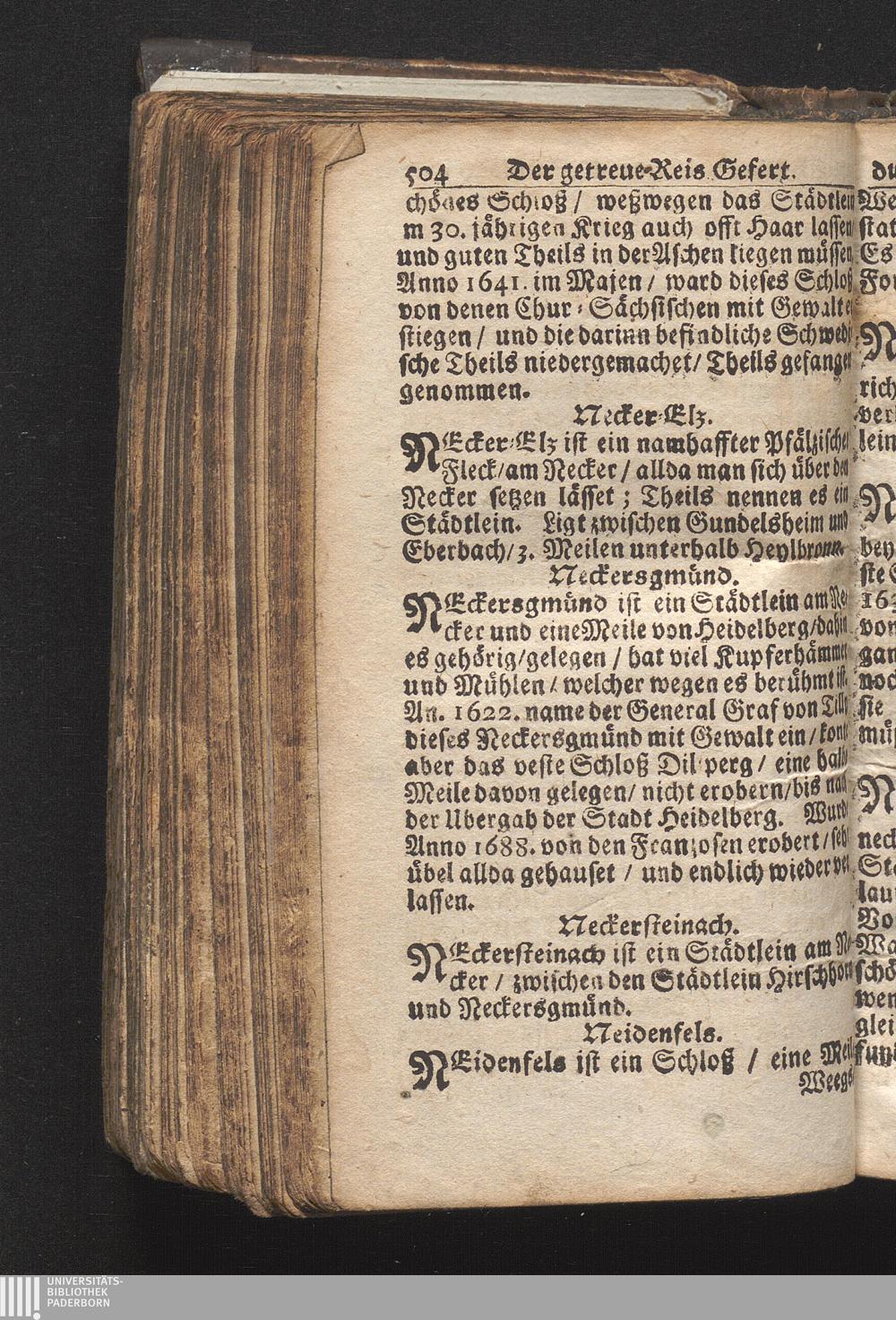 Der getreue Reiß-Gefert durch Ober- und Nieder-Teutschland : Das ist: Grundrichtige und ausführliche Abhandlung derer jenigen Residenzien/ Städte/ Schlösser/ Vestungen/ Städtlein und nahmhafften Markflecken/ welche so wol in Ober- als Nieder-Teutschland/ einem Reisenden sich hin und wieder vorstellig machen und zwar solcher Gestalt/ daß darinn derer Ursprung/ Aufnahm/ Fortification/ Raritäten/ herrliche Gebäue/ und Glück- und Unglücks-Fälle bis auf gegenwärtige Zeit fortgesetzt enthalten. Dabey auch noch über das ein absonderlicher kurz-gefasster Weegweiser angehänget zu finden/ worinnen klärlich zu sehen, wie viel Meilen ein Ort von dem andern entlegen. Alles aus denen bewährtesten Scribenten hervorgesuchet/ zum Nutz-Ergötzen mitgetheilet ...
