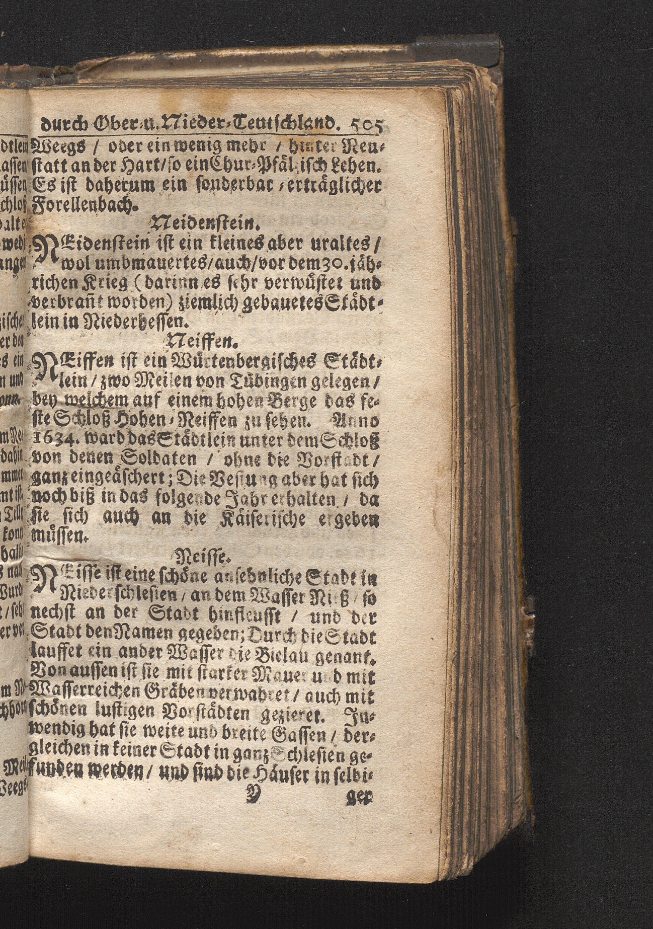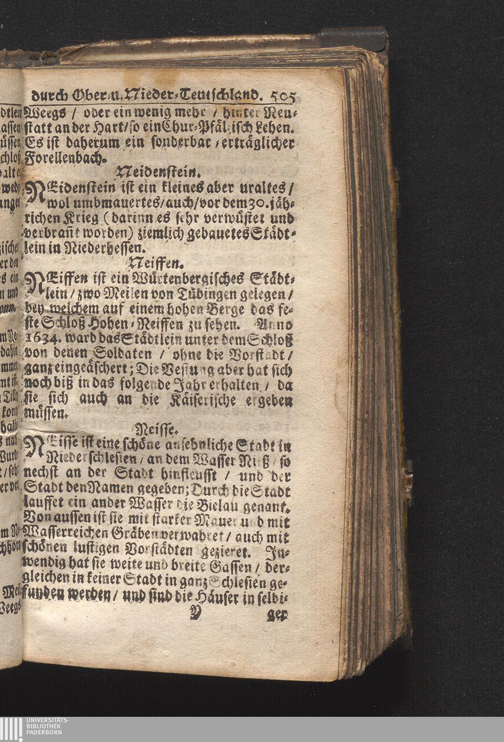 Der getreue Reiß-Gefert durch Ober- und Nieder-Teutschland : Das ist: Grundrichtige und ausführliche Abhandlung derer jenigen Residenzien/ Städte/ Schlösser/ Vestungen/ Städtlein und nahmhafften Markflecken/ welche so wol in Ober- als Nieder-Teutschland/ einem Reisenden sich hin und wieder vorstellig machen und zwar solcher Gestalt/ daß darinn derer Ursprung/ Aufnahm/ Fortification/ Raritäten/ herrliche Gebäue/ und Glück- und Unglücks-Fälle bis auf gegenwärtige Zeit fortgesetzt enthalten. Dabey auch noch über das ein absonderlicher kurz-gefasster Weegweiser angehänget zu finden/ worinnen klärlich zu sehen, wie viel Meilen ein Ort von dem andern entlegen. Alles aus denen bewährtesten Scribenten hervorgesuchet/ zum Nutz-Ergötzen mitgetheilet ...