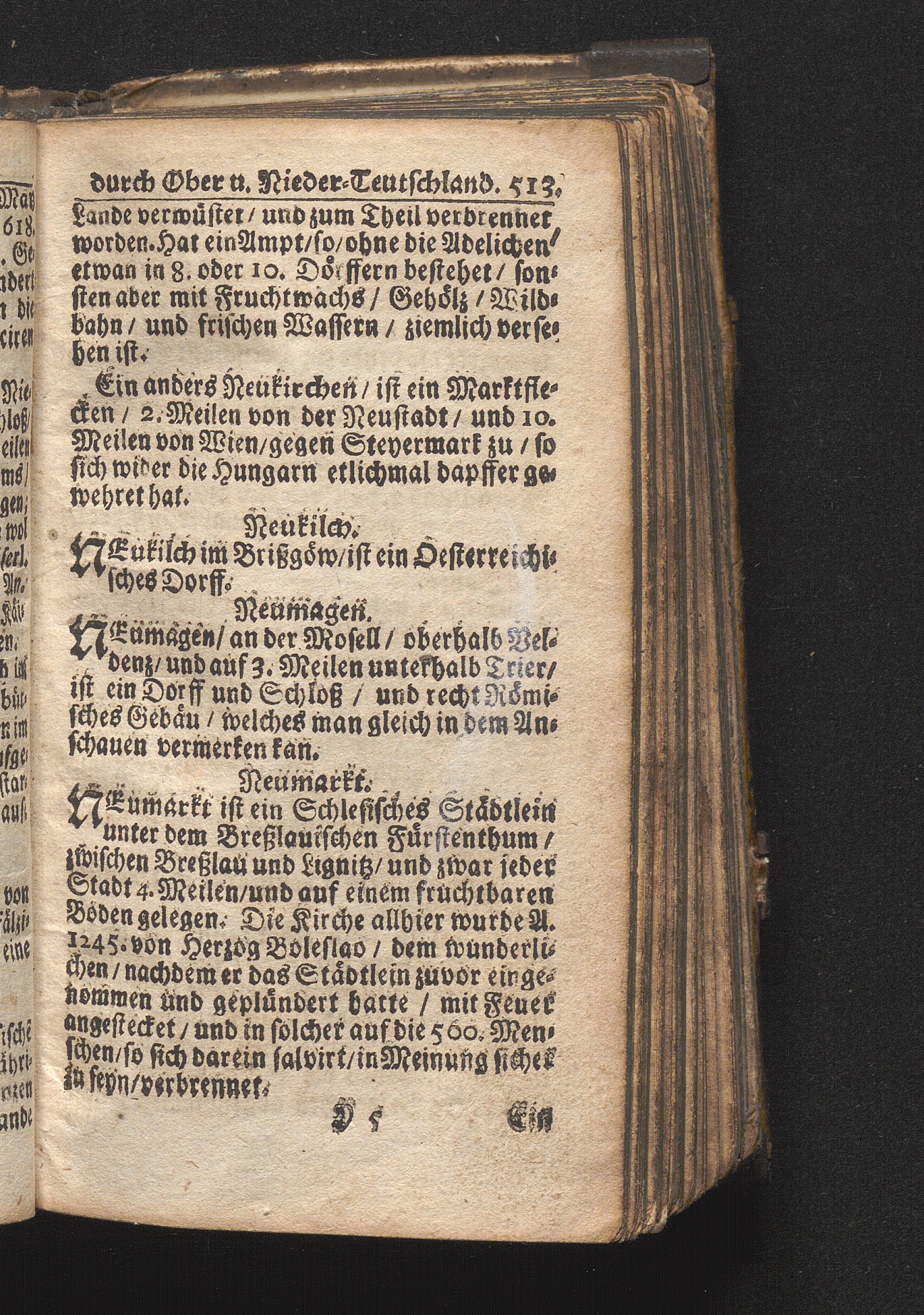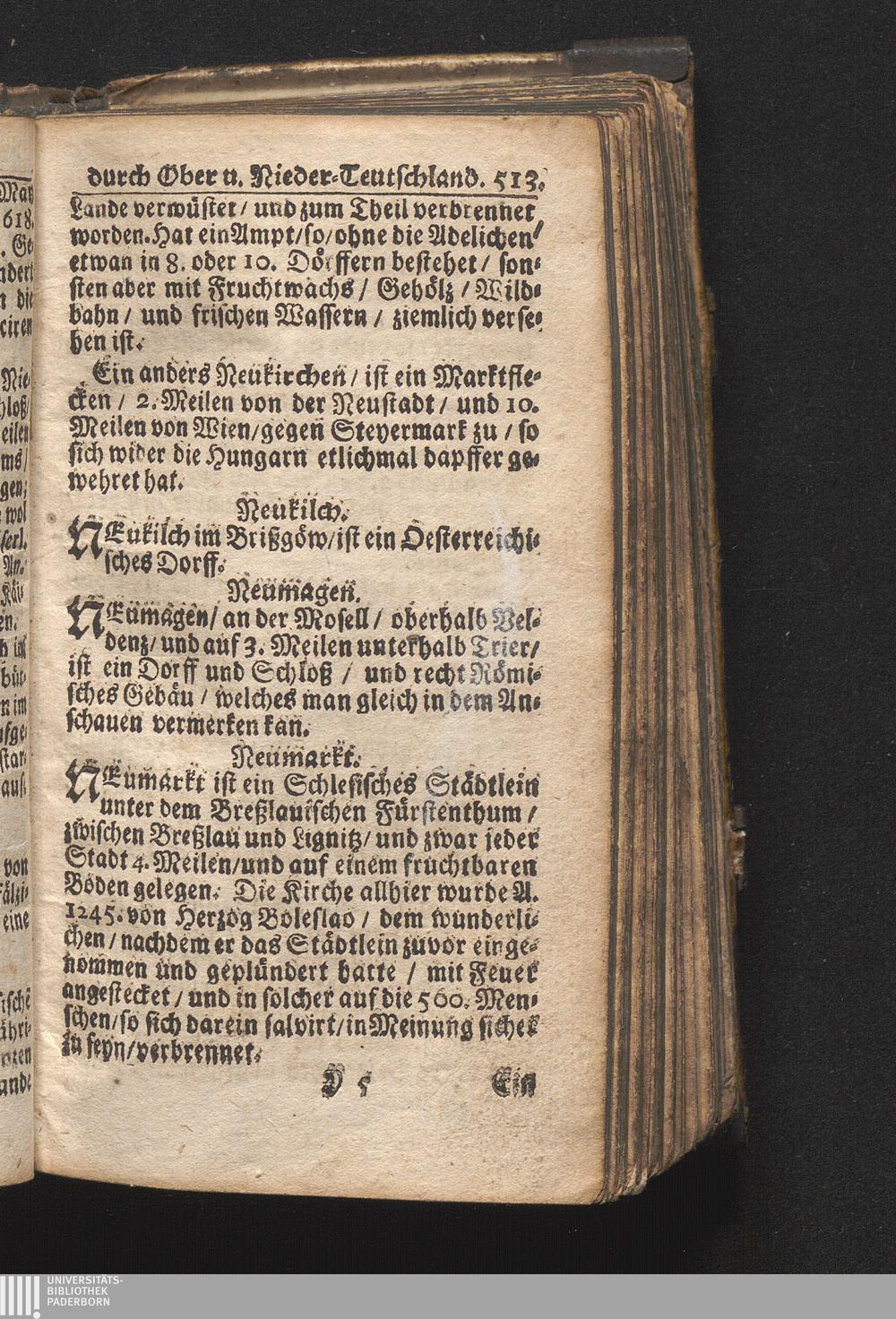 Der getreue Reiß-Gefert durch Ober- und Nieder-Teutschland : Das ist: Grundrichtige und ausführliche Abhandlung derer jenigen Residenzien/ Städte/ Schlösser/ Vestungen/ Städtlein und nahmhafften Markflecken/ welche so wol in Ober- als Nieder-Teutschland/ einem Reisenden sich hin und wieder vorstellig machen und zwar solcher Gestalt/ daß darinn derer Ursprung/ Aufnahm/ Fortification/ Raritäten/ herrliche Gebäue/ und Glück- und Unglücks-Fälle bis auf gegenwärtige Zeit fortgesetzt enthalten. Dabey auch noch über das ein absonderlicher kurz-gefasster Weegweiser angehänget zu finden/ worinnen klärlich zu sehen, wie viel Meilen ein Ort von dem andern entlegen. Alles aus denen bewährtesten Scribenten hervorgesuchet/ zum Nutz-Ergötzen mitgetheilet ...