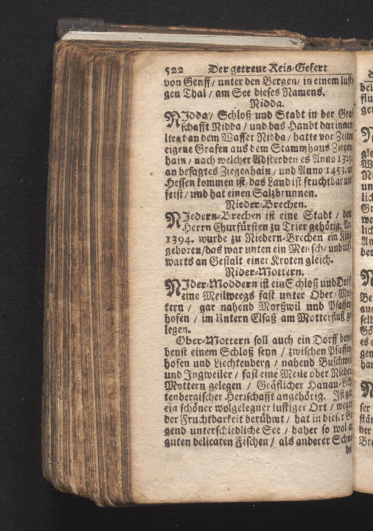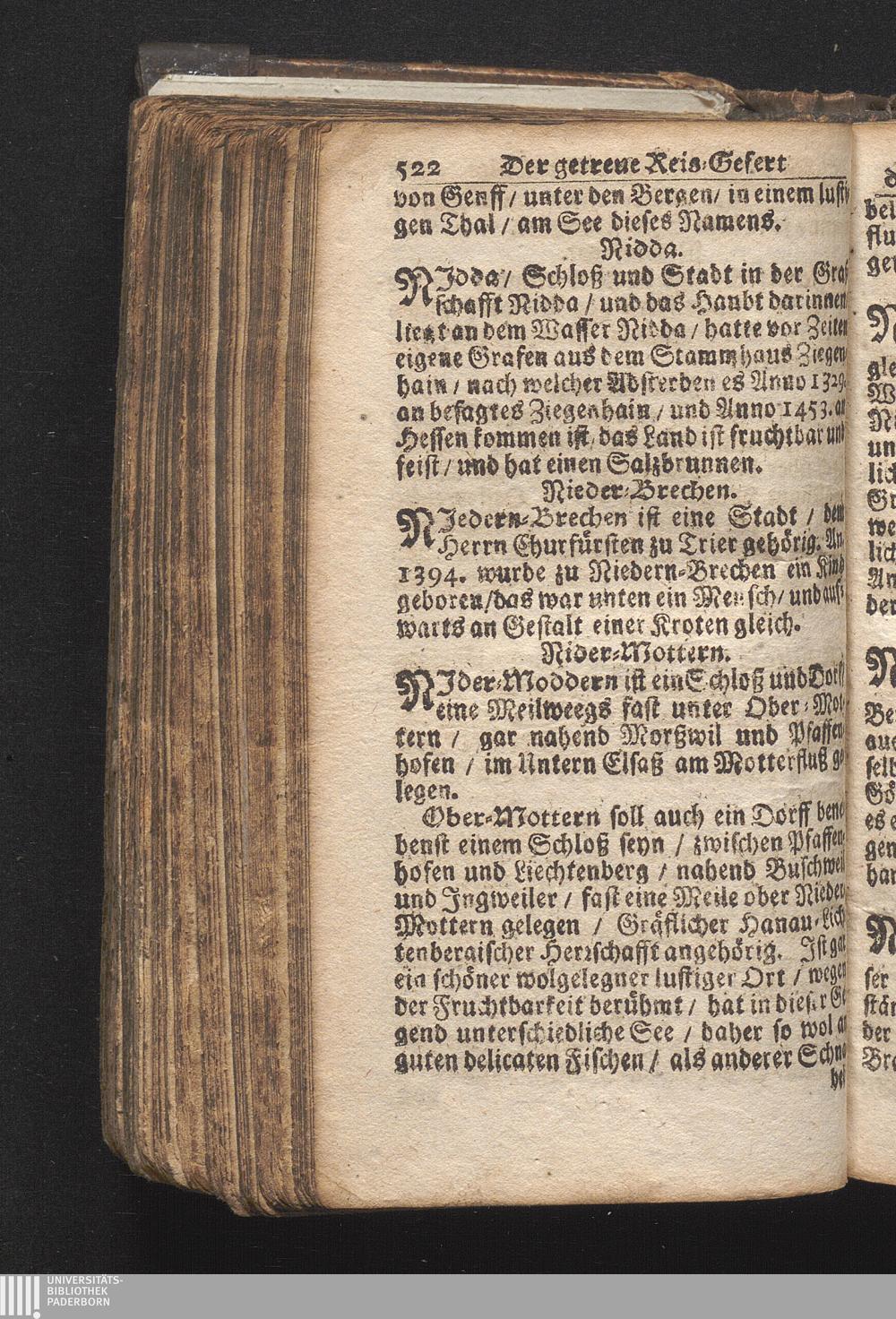 Der getreue Reiß-Gefert durch Ober- und Nieder-Teutschland : Das ist: Grundrichtige und ausführliche Abhandlung derer jenigen Residenzien/ Städte/ Schlösser/ Vestungen/ Städtlein und nahmhafften Markflecken/ welche so wol in Ober- als Nieder-Teutschland/ einem Reisenden sich hin und wieder vorstellig machen und zwar solcher Gestalt/ daß darinn derer Ursprung/ Aufnahm/ Fortification/ Raritäten/ herrliche Gebäue/ und Glück- und Unglücks-Fälle bis auf gegenwärtige Zeit fortgesetzt enthalten. Dabey auch noch über das ein absonderlicher kurz-gefasster Weegweiser angehänget zu finden/ worinnen klärlich zu sehen, wie viel Meilen ein Ort von dem andern entlegen. Alles aus denen bewährtesten Scribenten hervorgesuchet/ zum Nutz-Ergötzen mitgetheilet ...