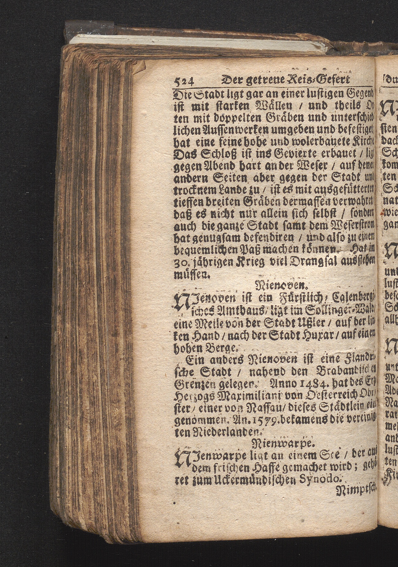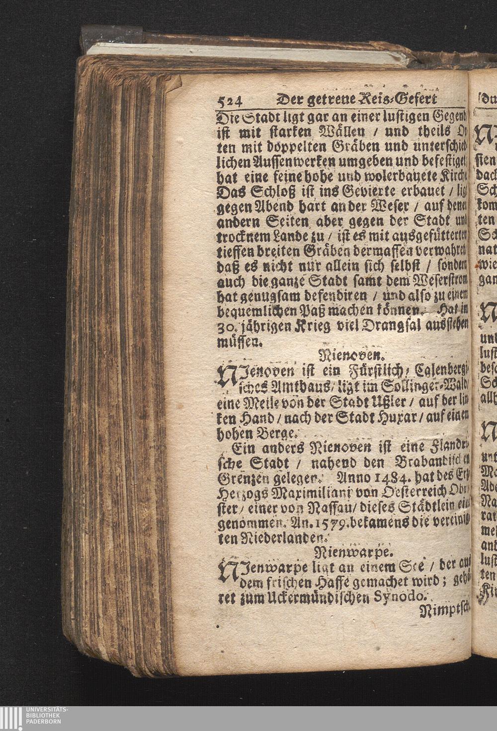 Der getreue Reiß-Gefert durch Ober- und Nieder-Teutschland : Das ist: Grundrichtige und ausführliche Abhandlung derer jenigen Residenzien/ Städte/ Schlösser/ Vestungen/ Städtlein und nahmhafften Markflecken/ welche so wol in Ober- als Nieder-Teutschland/ einem Reisenden sich hin und wieder vorstellig machen und zwar solcher Gestalt/ daß darinn derer Ursprung/ Aufnahm/ Fortification/ Raritäten/ herrliche Gebäue/ und Glück- und Unglücks-Fälle bis auf gegenwärtige Zeit fortgesetzt enthalten. Dabey auch noch über das ein absonderlicher kurz-gefasster Weegweiser angehänget zu finden/ worinnen klärlich zu sehen, wie viel Meilen ein Ort von dem andern entlegen. Alles aus denen bewährtesten Scribenten hervorgesuchet/ zum Nutz-Ergötzen mitgetheilet ...