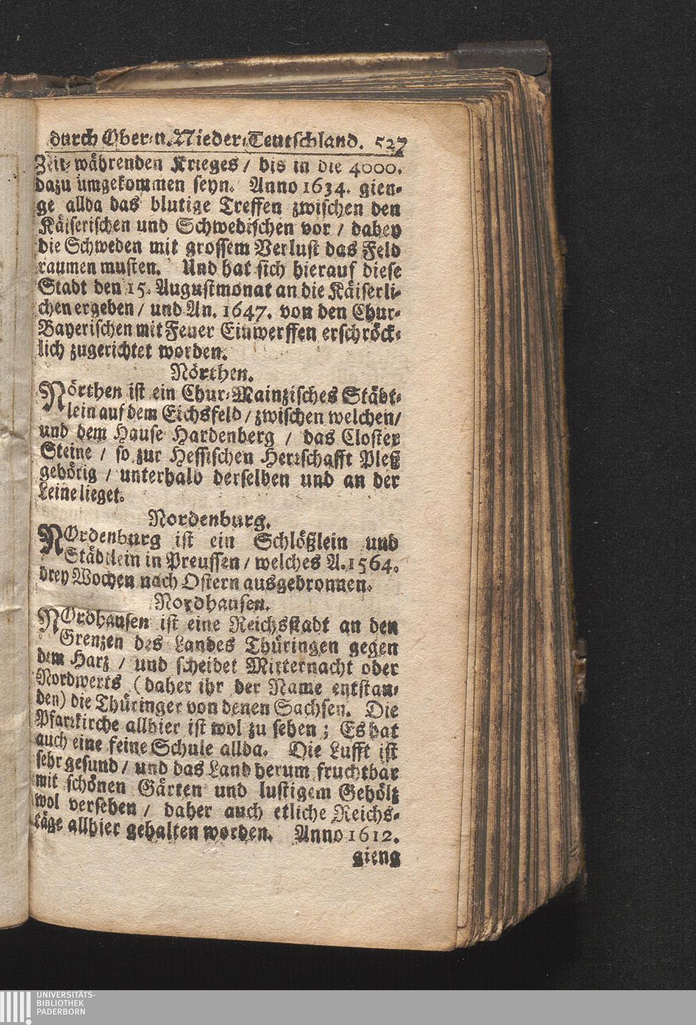 Der getreue Reiß-Gefert durch Ober- und Nieder-Teutschland : Das ist: Grundrichtige und ausführliche Abhandlung derer jenigen Residenzien/ Städte/ Schlösser/ Vestungen/ Städtlein und nahmhafften Markflecken/ welche so wol in Ober- als Nieder-Teutschland/ einem Reisenden sich hin und wieder vorstellig machen und zwar solcher Gestalt/ daß darinn derer Ursprung/ Aufnahm/ Fortification/ Raritäten/ herrliche Gebäue/ und Glück- und Unglücks-Fälle bis auf gegenwärtige Zeit fortgesetzt enthalten. Dabey auch noch über das ein absonderlicher kurz-gefasster Weegweiser angehänget zu finden/ worinnen klärlich zu sehen, wie viel Meilen ein Ort von dem andern entlegen. Alles aus denen bewährtesten Scribenten hervorgesuchet/ zum Nutz-Ergötzen mitgetheilet ...