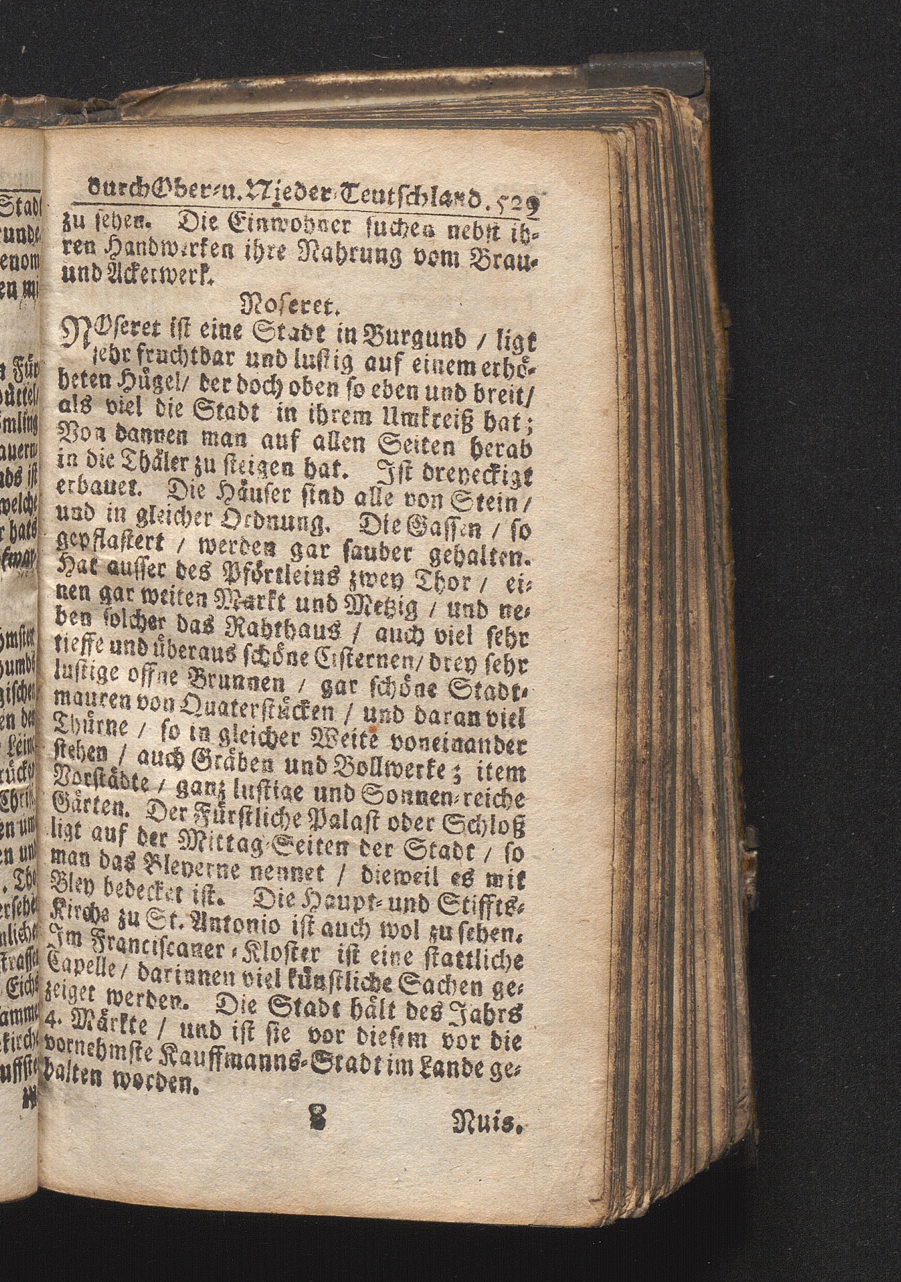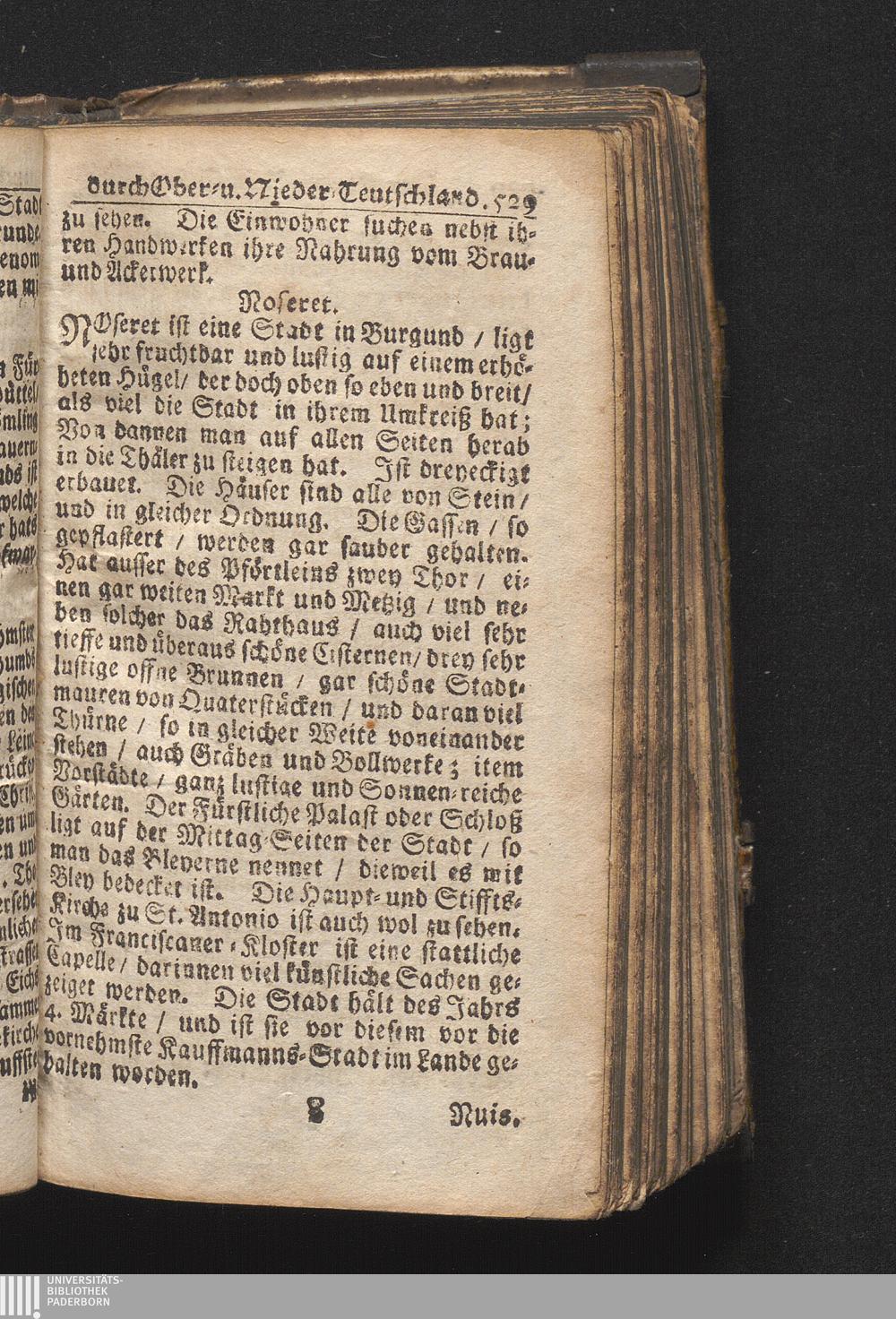 Der getreue Reiß-Gefert durch Ober- und Nieder-Teutschland : Das ist: Grundrichtige und ausführliche Abhandlung derer jenigen Residenzien/ Städte/ Schlösser/ Vestungen/ Städtlein und nahmhafften Markflecken/ welche so wol in Ober- als Nieder-Teutschland/ einem Reisenden sich hin und wieder vorstellig machen und zwar solcher Gestalt/ daß darinn derer Ursprung/ Aufnahm/ Fortification/ Raritäten/ herrliche Gebäue/ und Glück- und Unglücks-Fälle bis auf gegenwärtige Zeit fortgesetzt enthalten. Dabey auch noch über das ein absonderlicher kurz-gefasster Weegweiser angehänget zu finden/ worinnen klärlich zu sehen, wie viel Meilen ein Ort von dem andern entlegen. Alles aus denen bewährtesten Scribenten hervorgesuchet/ zum Nutz-Ergötzen mitgetheilet ...