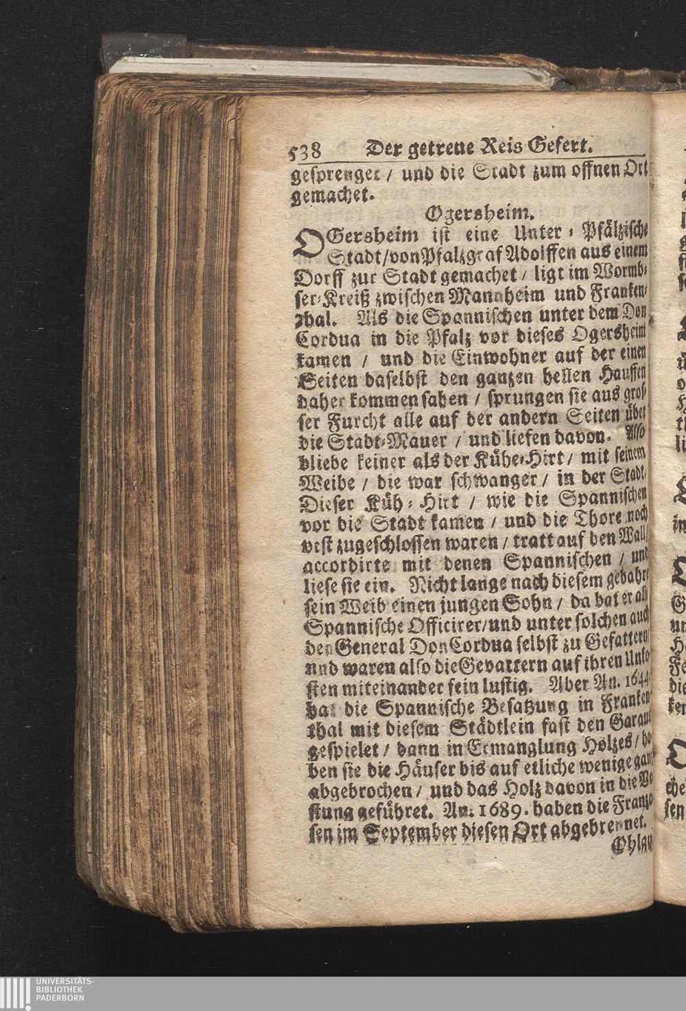 Der getreue Reiß-Gefert durch Ober- und Nieder-Teutschland : Das ist: Grundrichtige und ausführliche Abhandlung derer jenigen Residenzien/ Städte/ Schlösser/ Vestungen/ Städtlein und nahmhafften Markflecken/ welche so wol in Ober- als Nieder-Teutschland/ einem Reisenden sich hin und wieder vorstellig machen und zwar solcher Gestalt/ daß darinn derer Ursprung/ Aufnahm/ Fortification/ Raritäten/ herrliche Gebäue/ und Glück- und Unglücks-Fälle bis auf gegenwärtige Zeit fortgesetzt enthalten. Dabey auch noch über das ein absonderlicher kurz-gefasster Weegweiser angehänget zu finden/ worinnen klärlich zu sehen, wie viel Meilen ein Ort von dem andern entlegen. Alles aus denen bewährtesten Scribenten hervorgesuchet/ zum Nutz-Ergötzen mitgetheilet ...