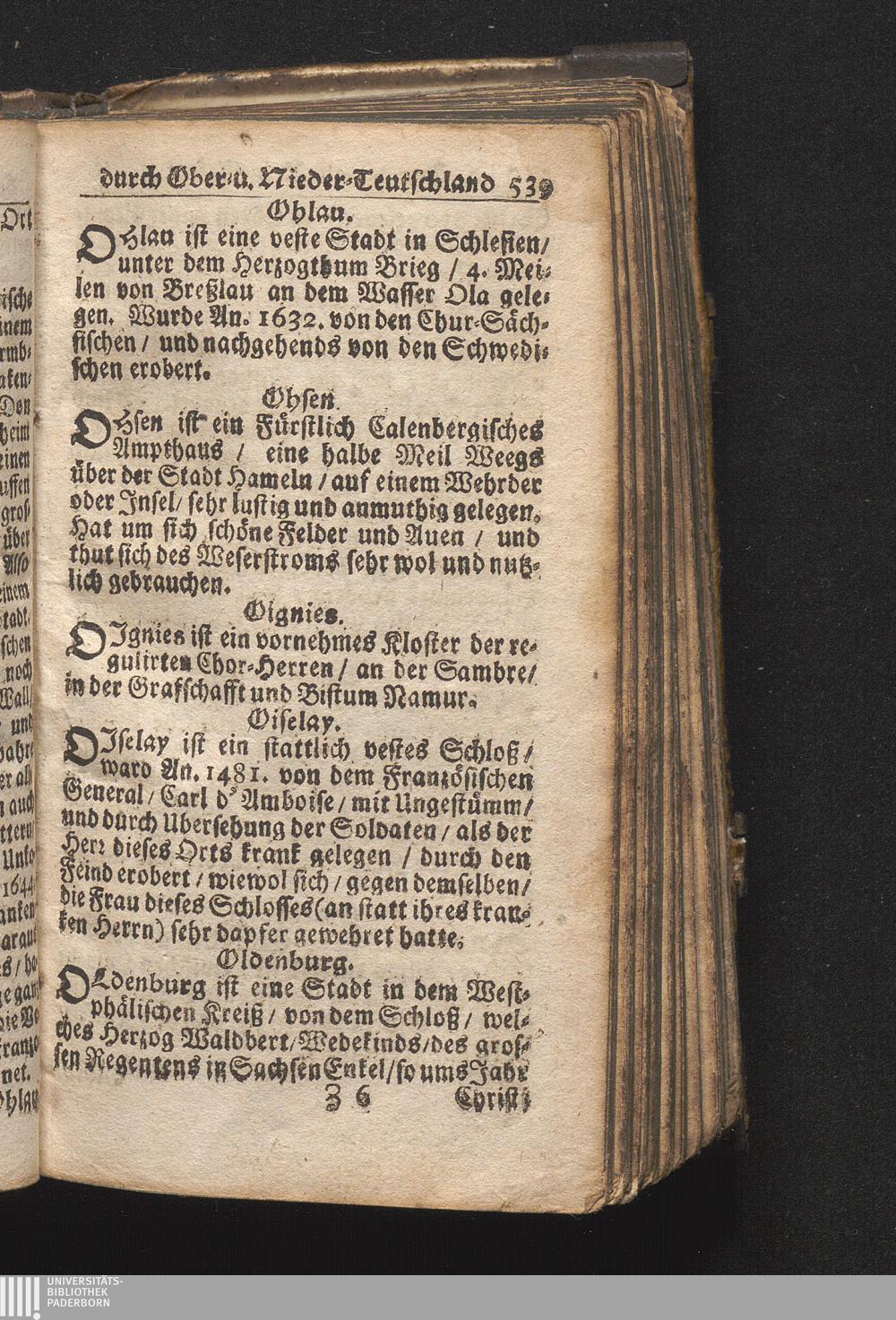 Der getreue Reiß-Gefert durch Ober- und Nieder-Teutschland : Das ist: Grundrichtige und ausführliche Abhandlung derer jenigen Residenzien/ Städte/ Schlösser/ Vestungen/ Städtlein und nahmhafften Markflecken/ welche so wol in Ober- als Nieder-Teutschland/ einem Reisenden sich hin und wieder vorstellig machen und zwar solcher Gestalt/ daß darinn derer Ursprung/ Aufnahm/ Fortification/ Raritäten/ herrliche Gebäue/ und Glück- und Unglücks-Fälle bis auf gegenwärtige Zeit fortgesetzt enthalten. Dabey auch noch über das ein absonderlicher kurz-gefasster Weegweiser angehänget zu finden/ worinnen klärlich zu sehen, wie viel Meilen ein Ort von dem andern entlegen. Alles aus denen bewährtesten Scribenten hervorgesuchet/ zum Nutz-Ergötzen mitgetheilet ...