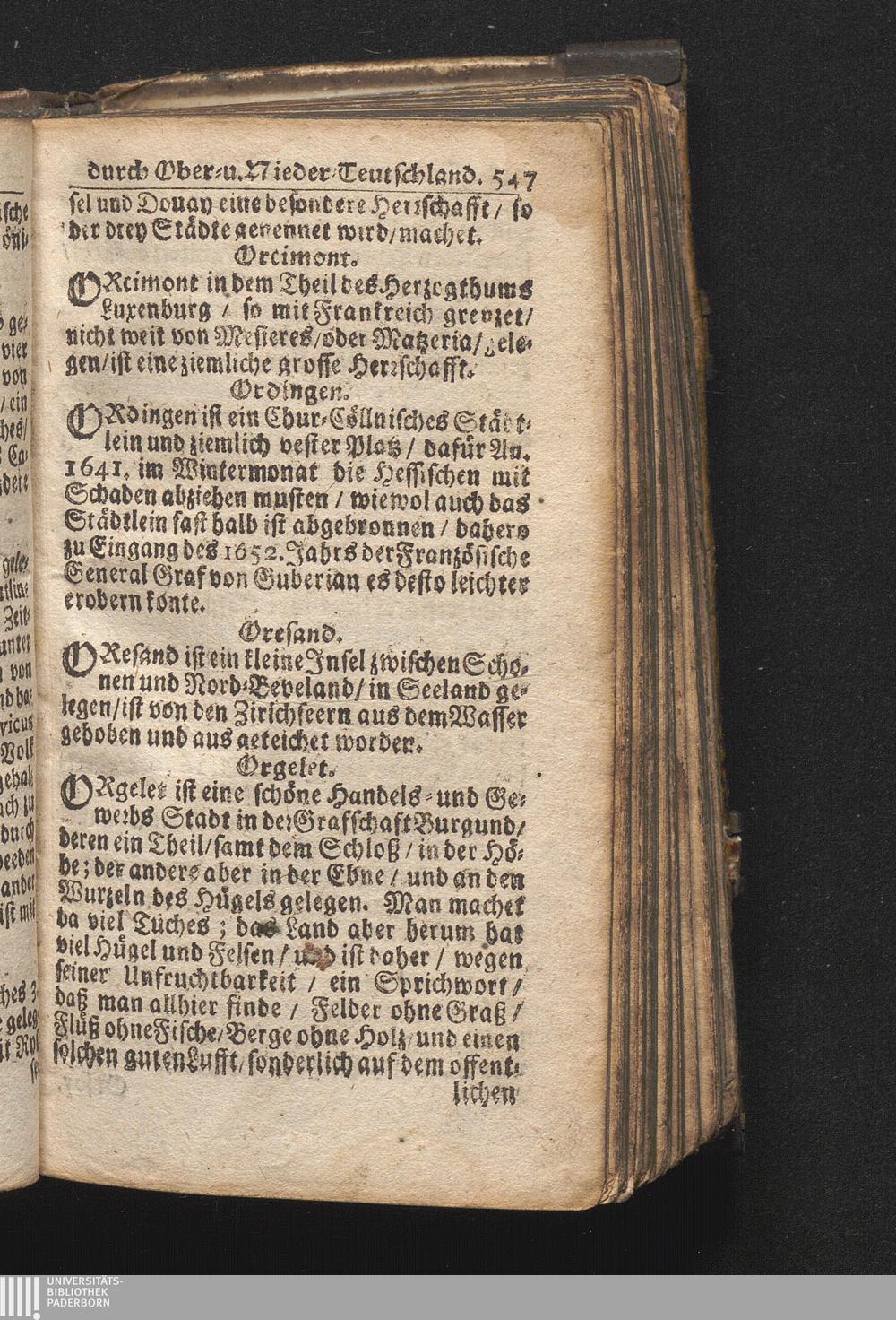 Der getreue Reiß-Gefert durch Ober- und Nieder-Teutschland : Das ist: Grundrichtige und ausführliche Abhandlung derer jenigen Residenzien/ Städte/ Schlösser/ Vestungen/ Städtlein und nahmhafften Markflecken/ welche so wol in Ober- als Nieder-Teutschland/ einem Reisenden sich hin und wieder vorstellig machen und zwar solcher Gestalt/ daß darinn derer Ursprung/ Aufnahm/ Fortification/ Raritäten/ herrliche Gebäue/ und Glück- und Unglücks-Fälle bis auf gegenwärtige Zeit fortgesetzt enthalten. Dabey auch noch über das ein absonderlicher kurz-gefasster Weegweiser angehänget zu finden/ worinnen klärlich zu sehen, wie viel Meilen ein Ort von dem andern entlegen. Alles aus denen bewährtesten Scribenten hervorgesuchet/ zum Nutz-Ergötzen mitgetheilet ...