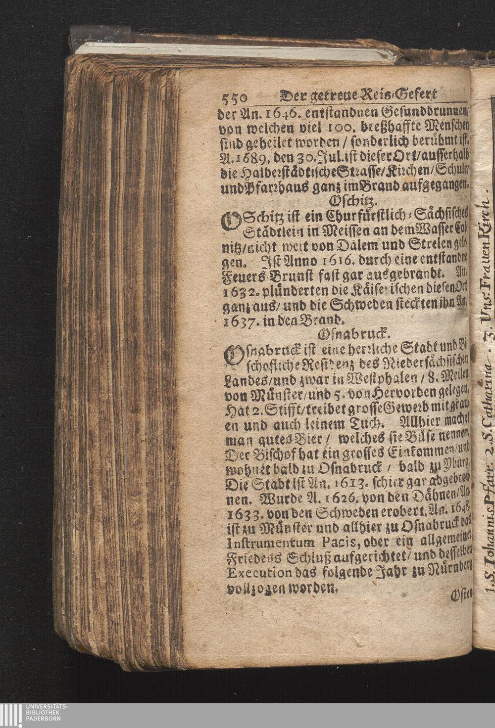 Der getreue Reiß-Gefert durch Ober- und Nieder-Teutschland : Das ist: Grundrichtige und ausführliche Abhandlung derer jenigen Residenzien/ Städte/ Schlösser/ Vestungen/ Städtlein und nahmhafften Markflecken/ welche so wol in Ober- als Nieder-Teutschland/ einem Reisenden sich hin und wieder vorstellig machen und zwar solcher Gestalt/ daß darinn derer Ursprung/ Aufnahm/ Fortification/ Raritäten/ herrliche Gebäue/ und Glück- und Unglücks-Fälle bis auf gegenwärtige Zeit fortgesetzt enthalten. Dabey auch noch über das ein absonderlicher kurz-gefasster Weegweiser angehänget zu finden/ worinnen klärlich zu sehen, wie viel Meilen ein Ort von dem andern entlegen. Alles aus denen bewährtesten Scribenten hervorgesuchet/ zum Nutz-Ergötzen mitgetheilet ...