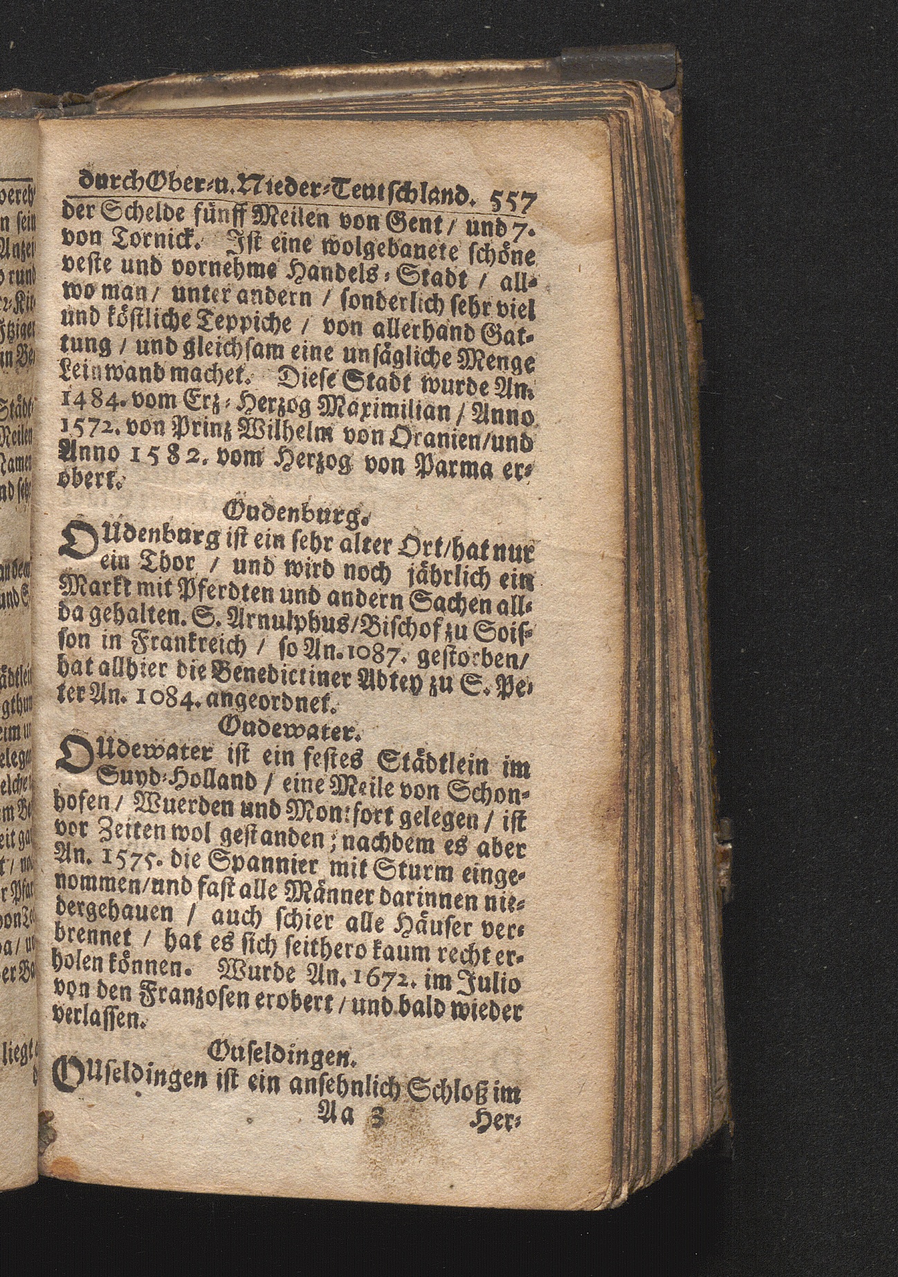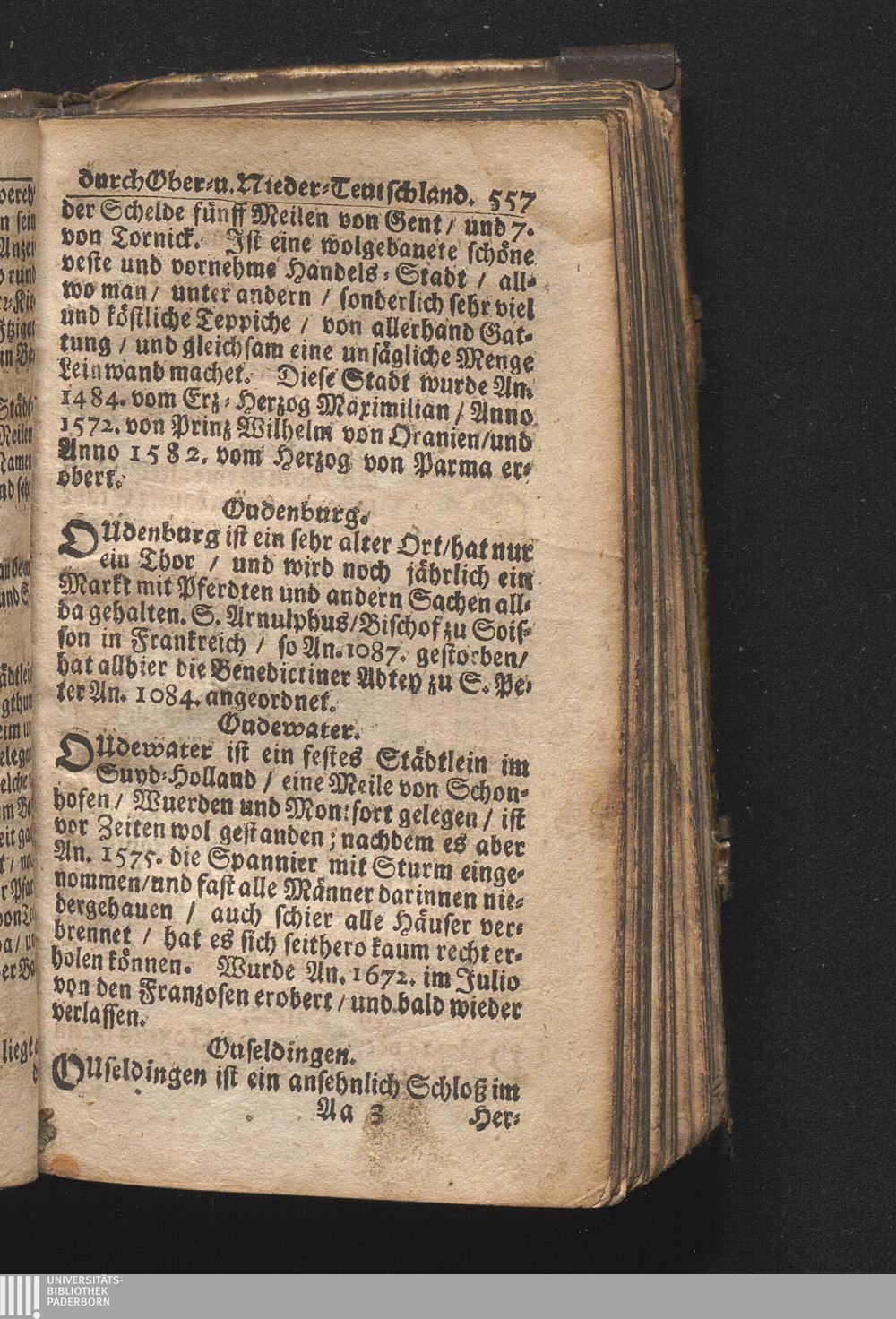 Der getreue Reiß-Gefert durch Ober- und Nieder-Teutschland : Das ist: Grundrichtige und ausführliche Abhandlung derer jenigen Residenzien/ Städte/ Schlösser/ Vestungen/ Städtlein und nahmhafften Markflecken/ welche so wol in Ober- als Nieder-Teutschland/ einem Reisenden sich hin und wieder vorstellig machen und zwar solcher Gestalt/ daß darinn derer Ursprung/ Aufnahm/ Fortification/ Raritäten/ herrliche Gebäue/ und Glück- und Unglücks-Fälle bis auf gegenwärtige Zeit fortgesetzt enthalten. Dabey auch noch über das ein absonderlicher kurz-gefasster Weegweiser angehänget zu finden/ worinnen klärlich zu sehen, wie viel Meilen ein Ort von dem andern entlegen. Alles aus denen bewährtesten Scribenten hervorgesuchet/ zum Nutz-Ergötzen mitgetheilet ...