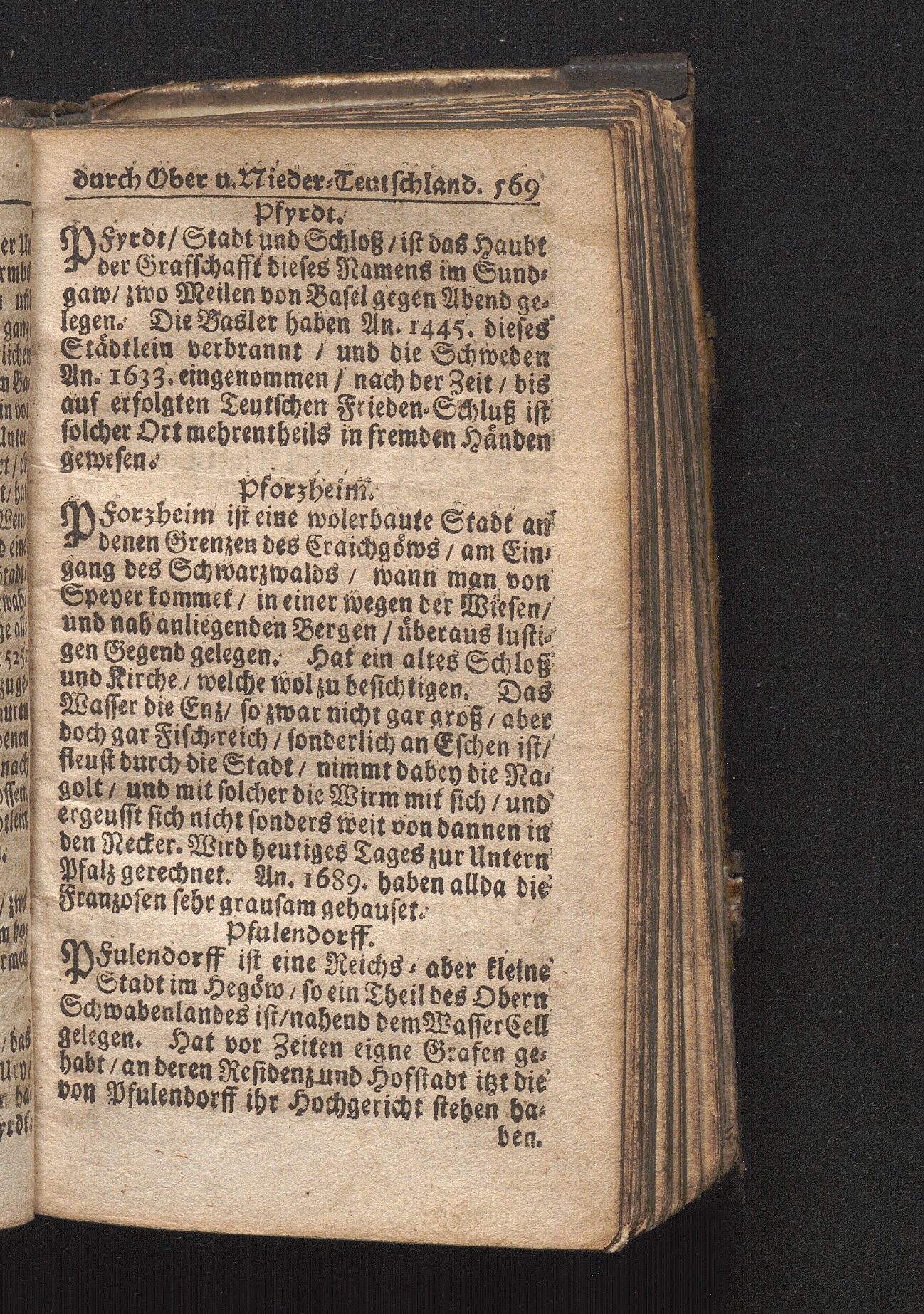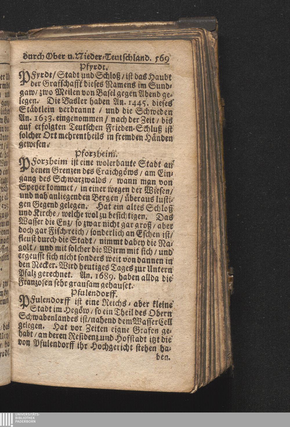 Der getreue Reiß-Gefert durch Ober- und Nieder-Teutschland : Das ist: Grundrichtige und ausführliche Abhandlung derer jenigen Residenzien/ Städte/ Schlösser/ Vestungen/ Städtlein und nahmhafften Markflecken/ welche so wol in Ober- als Nieder-Teutschland/ einem Reisenden sich hin und wieder vorstellig machen und zwar solcher Gestalt/ daß darinn derer Ursprung/ Aufnahm/ Fortification/ Raritäten/ herrliche Gebäue/ und Glück- und Unglücks-Fälle bis auf gegenwärtige Zeit fortgesetzt enthalten. Dabey auch noch über das ein absonderlicher kurz-gefasster Weegweiser angehänget zu finden/ worinnen klärlich zu sehen, wie viel Meilen ein Ort von dem andern entlegen. Alles aus denen bewährtesten Scribenten hervorgesuchet/ zum Nutz-Ergötzen mitgetheilet ...