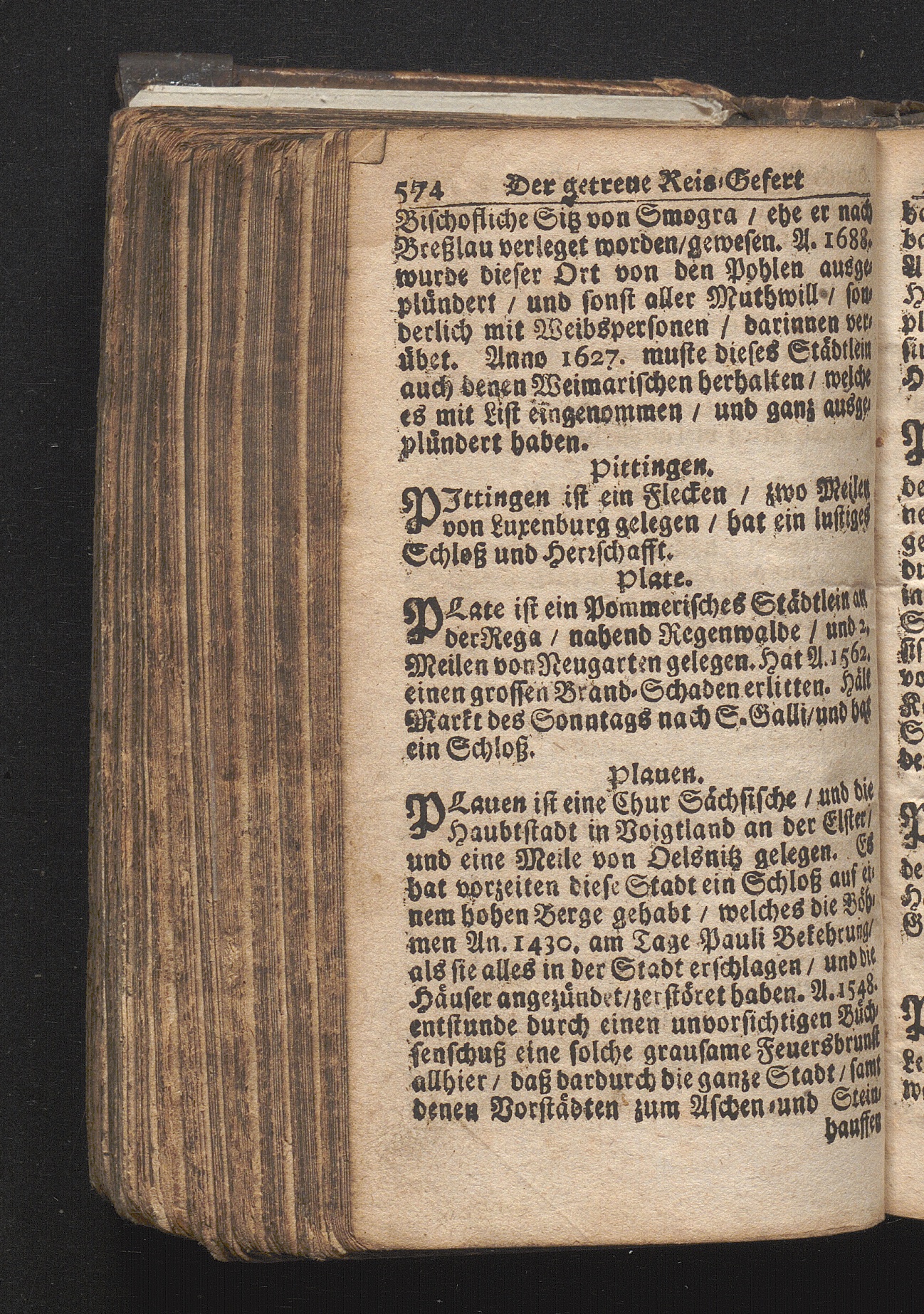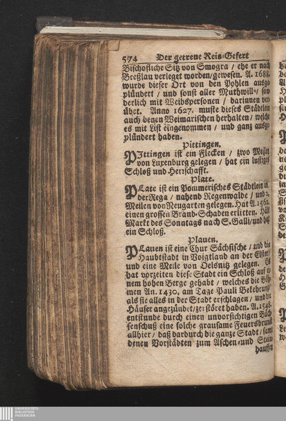 Der getreue Reiß-Gefert durch Ober- und Nieder-Teutschland : Das ist: Grundrichtige und ausführliche Abhandlung derer jenigen Residenzien/ Städte/ Schlösser/ Vestungen/ Städtlein und nahmhafften Markflecken/ welche so wol in Ober- als Nieder-Teutschland/ einem Reisenden sich hin und wieder vorstellig machen und zwar solcher Gestalt/ daß darinn derer Ursprung/ Aufnahm/ Fortification/ Raritäten/ herrliche Gebäue/ und Glück- und Unglücks-Fälle bis auf gegenwärtige Zeit fortgesetzt enthalten. Dabey auch noch über das ein absonderlicher kurz-gefasster Weegweiser angehänget zu finden/ worinnen klärlich zu sehen, wie viel Meilen ein Ort von dem andern entlegen. Alles aus denen bewährtesten Scribenten hervorgesuchet/ zum Nutz-Ergötzen mitgetheilet ...