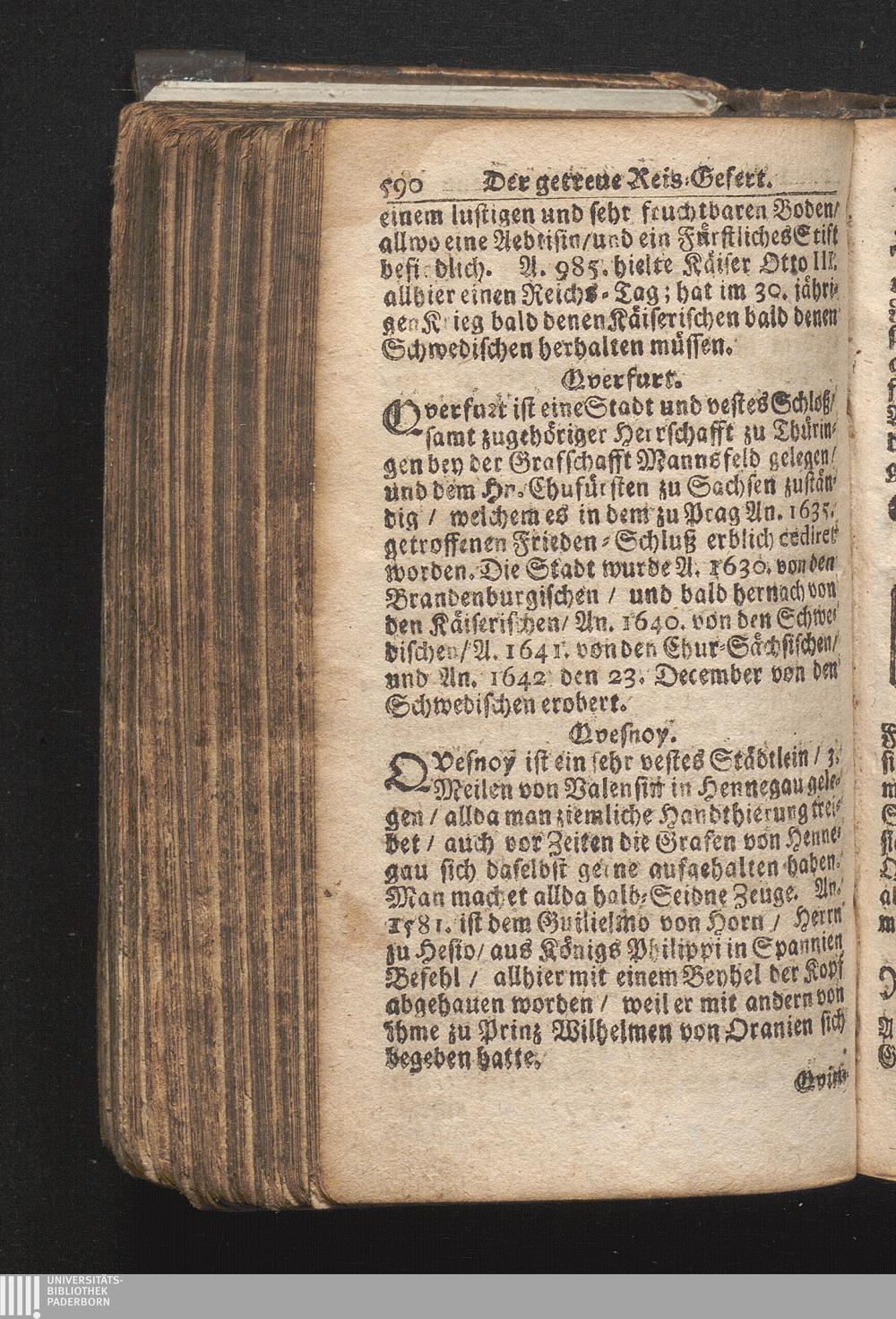 Der getreue Reiß-Gefert durch Ober- und Nieder-Teutschland : Das ist: Grundrichtige und ausführliche Abhandlung derer jenigen Residenzien/ Städte/ Schlösser/ Vestungen/ Städtlein und nahmhafften Markflecken/ welche so wol in Ober- als Nieder-Teutschland/ einem Reisenden sich hin und wieder vorstellig machen und zwar solcher Gestalt/ daß darinn derer Ursprung/ Aufnahm/ Fortification/ Raritäten/ herrliche Gebäue/ und Glück- und Unglücks-Fälle bis auf gegenwärtige Zeit fortgesetzt enthalten. Dabey auch noch über das ein absonderlicher kurz-gefasster Weegweiser angehänget zu finden/ worinnen klärlich zu sehen, wie viel Meilen ein Ort von dem andern entlegen. Alles aus denen bewährtesten Scribenten hervorgesuchet/ zum Nutz-Ergötzen mitgetheilet ...