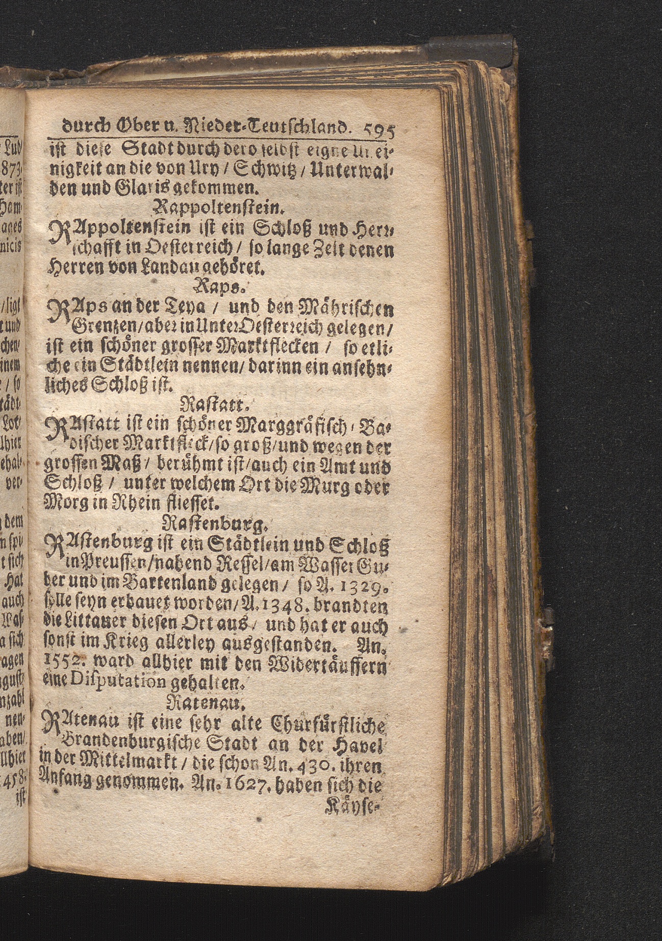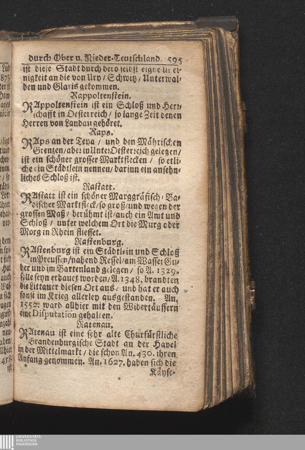 Der getreue Reiß-Gefert durch Ober- und Nieder-Teutschland : Das ist: Grundrichtige und ausführliche Abhandlung derer jenigen Residenzien/ Städte/ Schlösser/ Vestungen/ Städtlein und nahmhafften Markflecken/ welche so wol in Ober- als Nieder-Teutschland/ einem Reisenden sich hin und wieder vorstellig machen und zwar solcher Gestalt/ daß darinn derer Ursprung/ Aufnahm/ Fortification/ Raritäten/ herrliche Gebäue/ und Glück- und Unglücks-Fälle bis auf gegenwärtige Zeit fortgesetzt enthalten. Dabey auch noch über das ein absonderlicher kurz-gefasster Weegweiser angehänget zu finden/ worinnen klärlich zu sehen, wie viel Meilen ein Ort von dem andern entlegen. Alles aus denen bewährtesten Scribenten hervorgesuchet/ zum Nutz-Ergötzen mitgetheilet ...