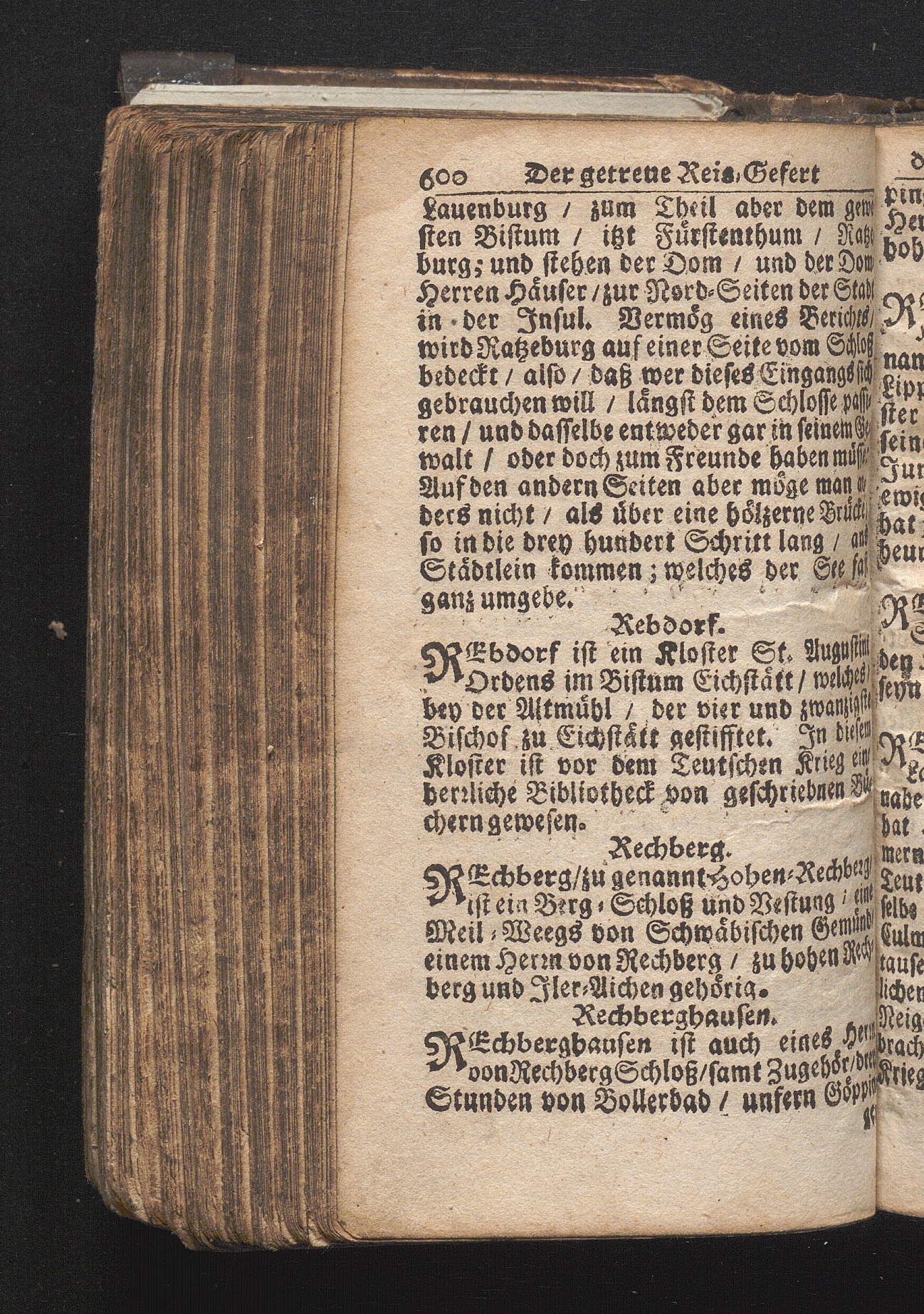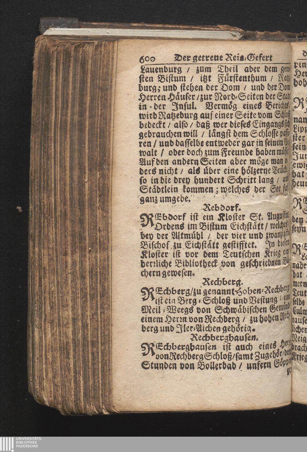 Der getreue Reiß-Gefert durch Ober- und Nieder-Teutschland : Das ist: Grundrichtige und ausführliche Abhandlung derer jenigen Residenzien/ Städte/ Schlösser/ Vestungen/ Städtlein und nahmhafften Markflecken/ welche so wol in Ober- als Nieder-Teutschland/ einem Reisenden sich hin und wieder vorstellig machen und zwar solcher Gestalt/ daß darinn derer Ursprung/ Aufnahm/ Fortification/ Raritäten/ herrliche Gebäue/ und Glück- und Unglücks-Fälle bis auf gegenwärtige Zeit fortgesetzt enthalten. Dabey auch noch über das ein absonderlicher kurz-gefasster Weegweiser angehänget zu finden/ worinnen klärlich zu sehen, wie viel Meilen ein Ort von dem andern entlegen. Alles aus denen bewährtesten Scribenten hervorgesuchet/ zum Nutz-Ergötzen mitgetheilet ...