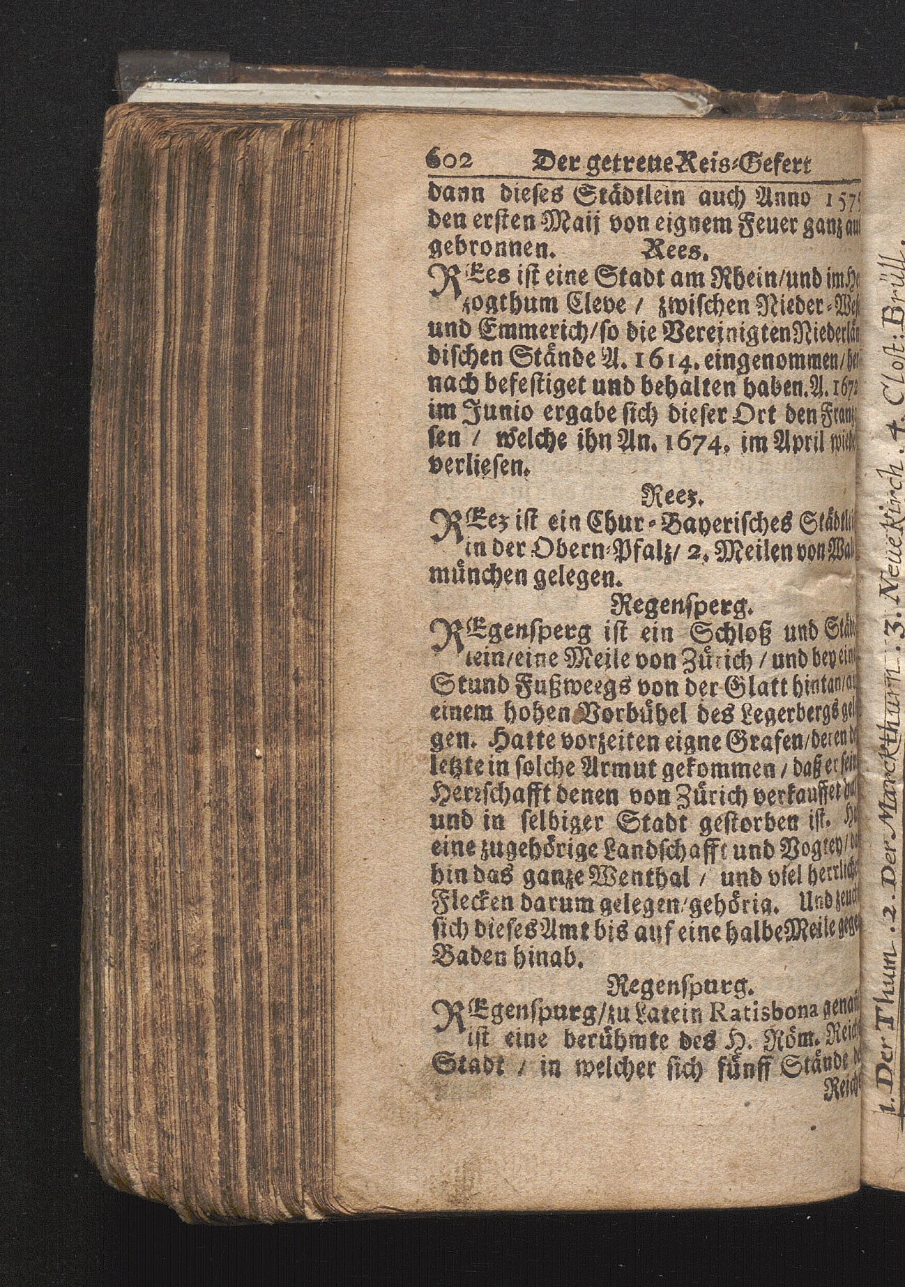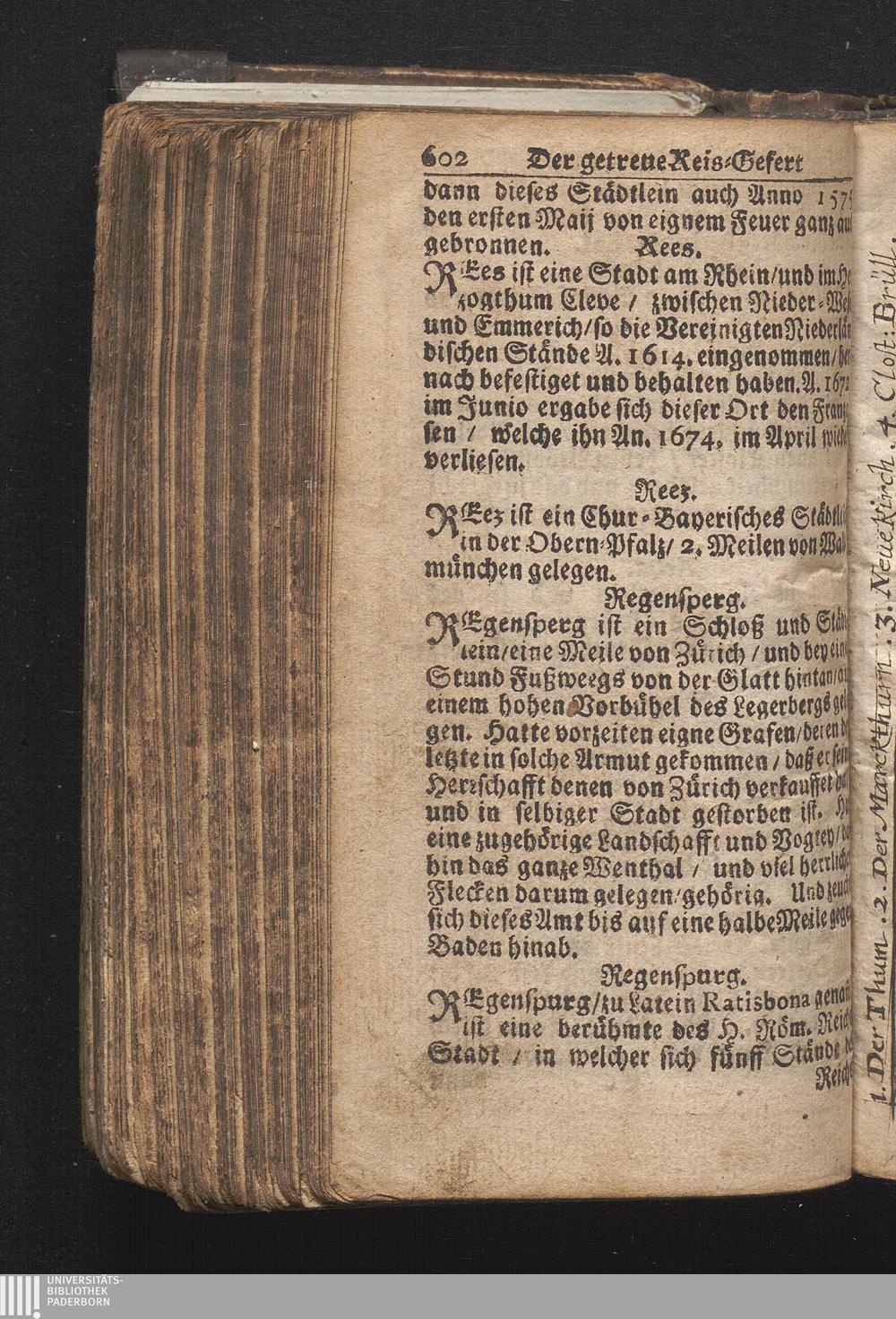 Der getreue Reiß-Gefert durch Ober- und Nieder-Teutschland : Das ist: Grundrichtige und ausführliche Abhandlung derer jenigen Residenzien/ Städte/ Schlösser/ Vestungen/ Städtlein und nahmhafften Markflecken/ welche so wol in Ober- als Nieder-Teutschland/ einem Reisenden sich hin und wieder vorstellig machen und zwar solcher Gestalt/ daß darinn derer Ursprung/ Aufnahm/ Fortification/ Raritäten/ herrliche Gebäue/ und Glück- und Unglücks-Fälle bis auf gegenwärtige Zeit fortgesetzt enthalten. Dabey auch noch über das ein absonderlicher kurz-gefasster Weegweiser angehänget zu finden/ worinnen klärlich zu sehen, wie viel Meilen ein Ort von dem andern entlegen. Alles aus denen bewährtesten Scribenten hervorgesuchet/ zum Nutz-Ergötzen mitgetheilet ...