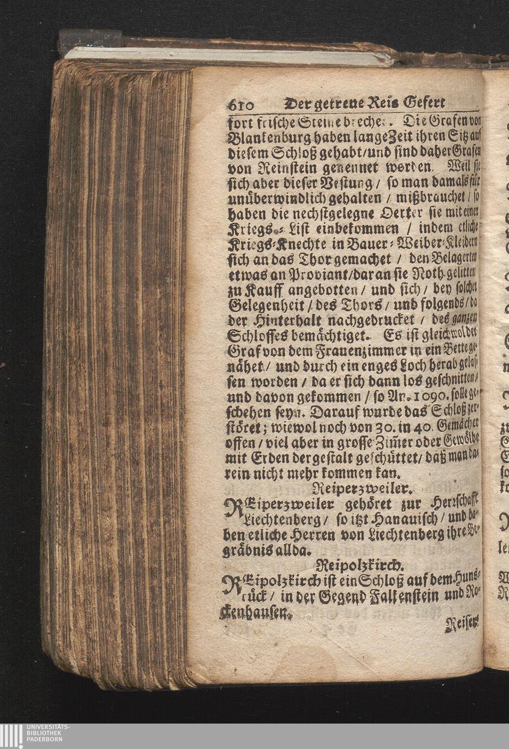 Der getreue Reiß-Gefert durch Ober- und Nieder-Teutschland : Das ist: Grundrichtige und ausführliche Abhandlung derer jenigen Residenzien/ Städte/ Schlösser/ Vestungen/ Städtlein und nahmhafften Markflecken/ welche so wol in Ober- als Nieder-Teutschland/ einem Reisenden sich hin und wieder vorstellig machen und zwar solcher Gestalt/ daß darinn derer Ursprung/ Aufnahm/ Fortification/ Raritäten/ herrliche Gebäue/ und Glück- und Unglücks-Fälle bis auf gegenwärtige Zeit fortgesetzt enthalten. Dabey auch noch über das ein absonderlicher kurz-gefasster Weegweiser angehänget zu finden/ worinnen klärlich zu sehen, wie viel Meilen ein Ort von dem andern entlegen. Alles aus denen bewährtesten Scribenten hervorgesuchet/ zum Nutz-Ergötzen mitgetheilet ...
