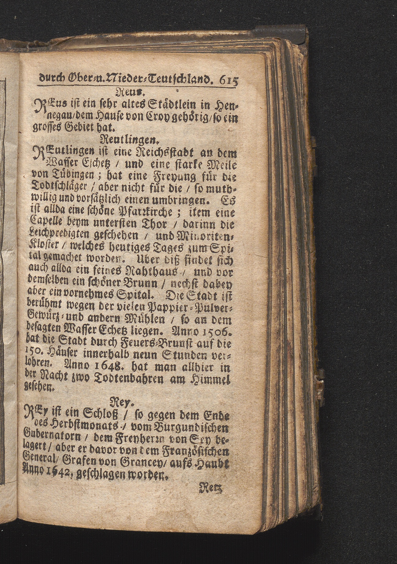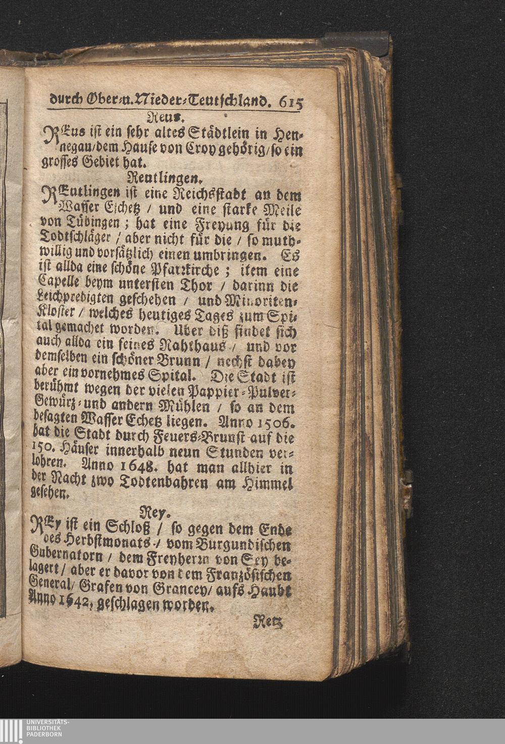 Der getreue Reiß-Gefert durch Ober- und Nieder-Teutschland : Das ist: Grundrichtige und ausführliche Abhandlung derer jenigen Residenzien/ Städte/ Schlösser/ Vestungen/ Städtlein und nahmhafften Markflecken/ welche so wol in Ober- als Nieder-Teutschland/ einem Reisenden sich hin und wieder vorstellig machen und zwar solcher Gestalt/ daß darinn derer Ursprung/ Aufnahm/ Fortification/ Raritäten/ herrliche Gebäue/ und Glück- und Unglücks-Fälle bis auf gegenwärtige Zeit fortgesetzt enthalten. Dabey auch noch über das ein absonderlicher kurz-gefasster Weegweiser angehänget zu finden/ worinnen klärlich zu sehen, wie viel Meilen ein Ort von dem andern entlegen. Alles aus denen bewährtesten Scribenten hervorgesuchet/ zum Nutz-Ergötzen mitgetheilet ...