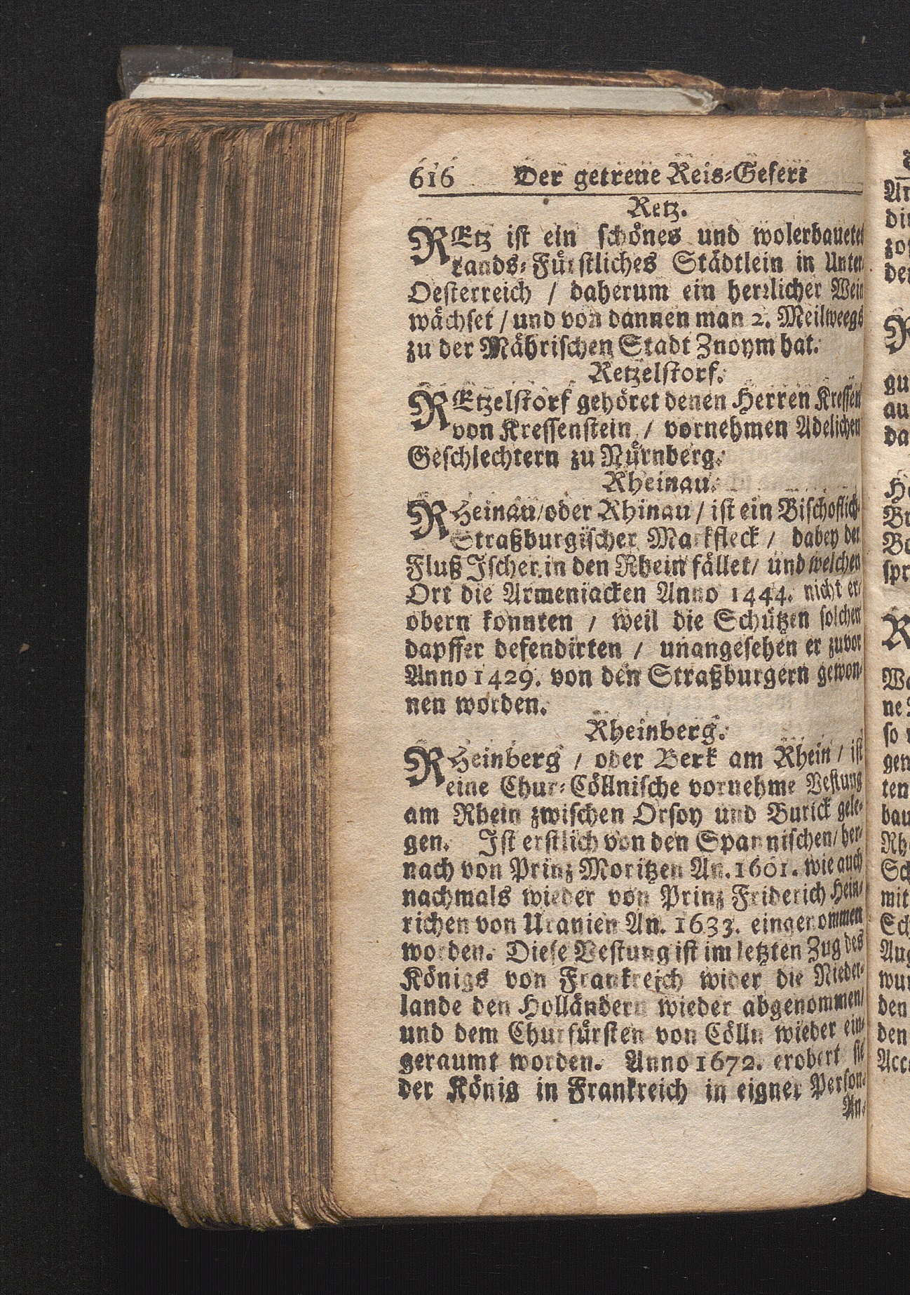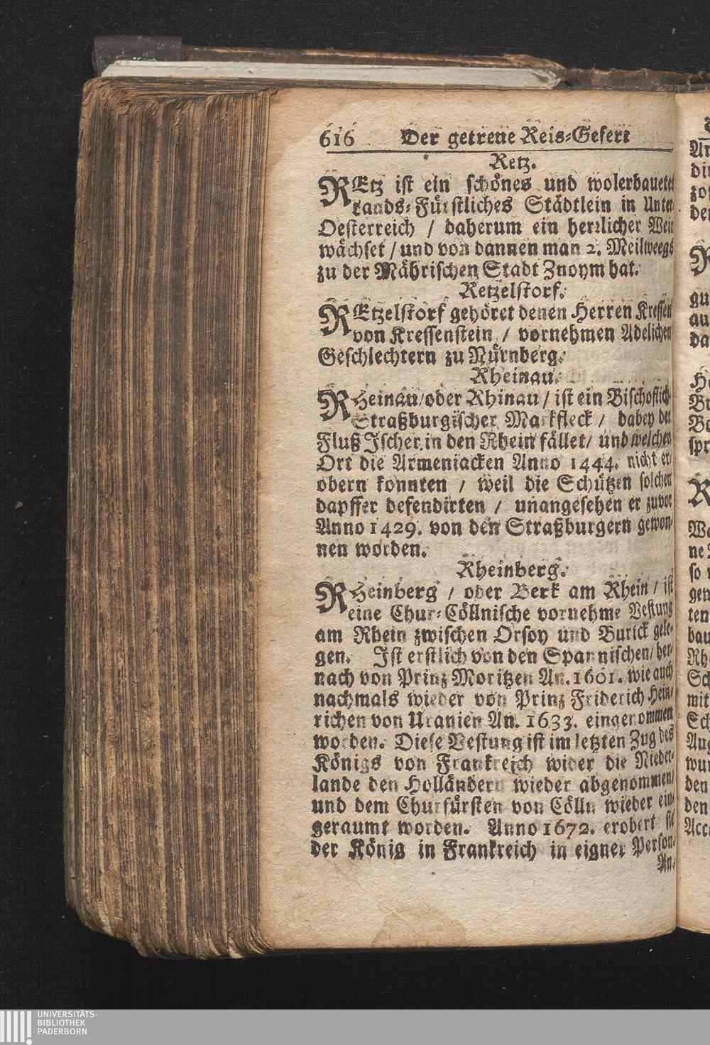 Der getreue Reiß-Gefert durch Ober- und Nieder-Teutschland : Das ist: Grundrichtige und ausführliche Abhandlung derer jenigen Residenzien/ Städte/ Schlösser/ Vestungen/ Städtlein und nahmhafften Markflecken/ welche so wol in Ober- als Nieder-Teutschland/ einem Reisenden sich hin und wieder vorstellig machen und zwar solcher Gestalt/ daß darinn derer Ursprung/ Aufnahm/ Fortification/ Raritäten/ herrliche Gebäue/ und Glück- und Unglücks-Fälle bis auf gegenwärtige Zeit fortgesetzt enthalten. Dabey auch noch über das ein absonderlicher kurz-gefasster Weegweiser angehänget zu finden/ worinnen klärlich zu sehen, wie viel Meilen ein Ort von dem andern entlegen. Alles aus denen bewährtesten Scribenten hervorgesuchet/ zum Nutz-Ergötzen mitgetheilet ...