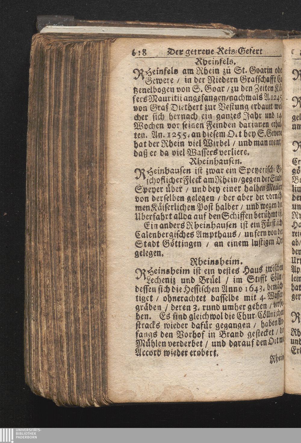 Der getreue Reiß-Gefert durch Ober- und Nieder-Teutschland : Das ist: Grundrichtige und ausführliche Abhandlung derer jenigen Residenzien/ Städte/ Schlösser/ Vestungen/ Städtlein und nahmhafften Markflecken/ welche so wol in Ober- als Nieder-Teutschland/ einem Reisenden sich hin und wieder vorstellig machen und zwar solcher Gestalt/ daß darinn derer Ursprung/ Aufnahm/ Fortification/ Raritäten/ herrliche Gebäue/ und Glück- und Unglücks-Fälle bis auf gegenwärtige Zeit fortgesetzt enthalten. Dabey auch noch über das ein absonderlicher kurz-gefasster Weegweiser angehänget zu finden/ worinnen klärlich zu sehen, wie viel Meilen ein Ort von dem andern entlegen. Alles aus denen bewährtesten Scribenten hervorgesuchet/ zum Nutz-Ergötzen mitgetheilet ...