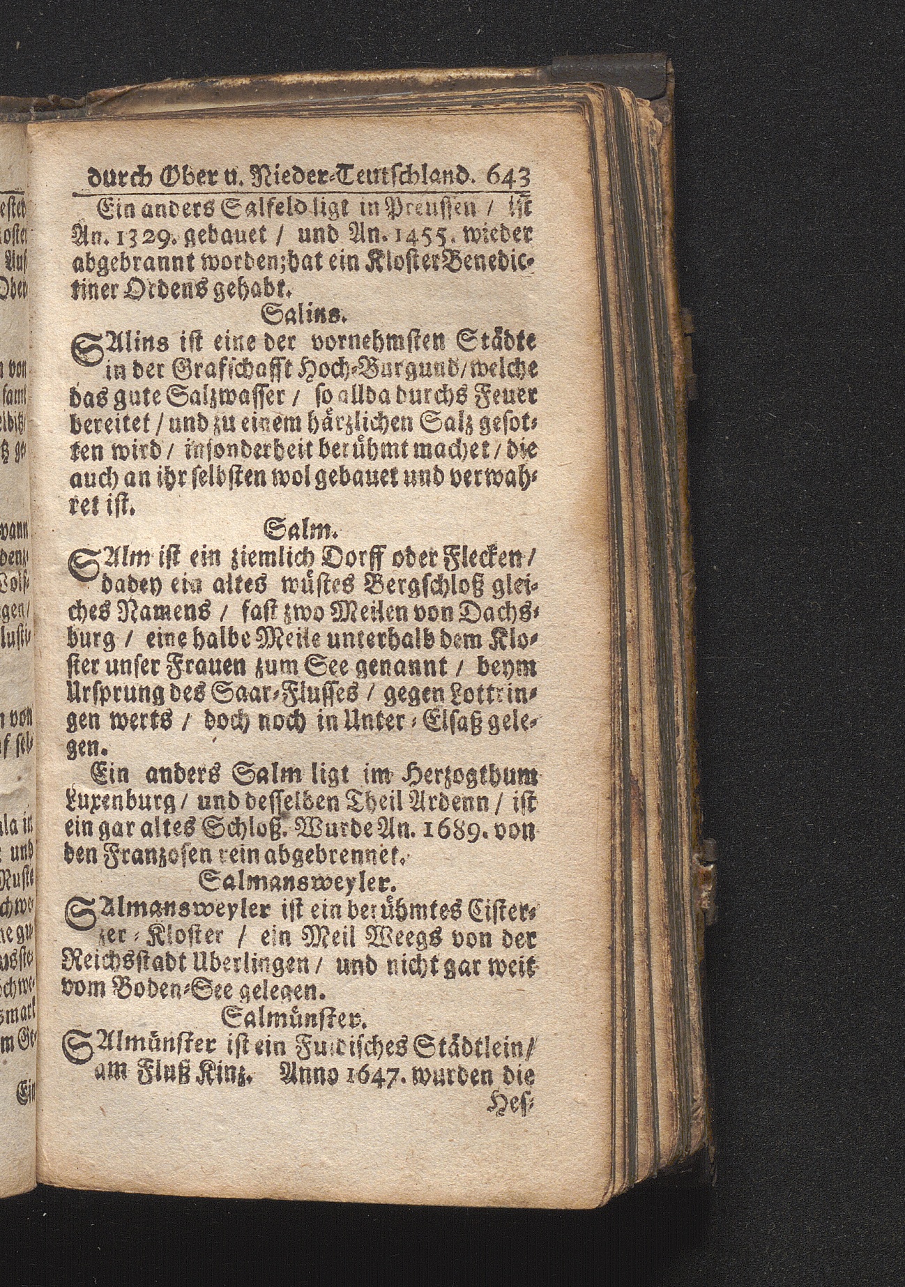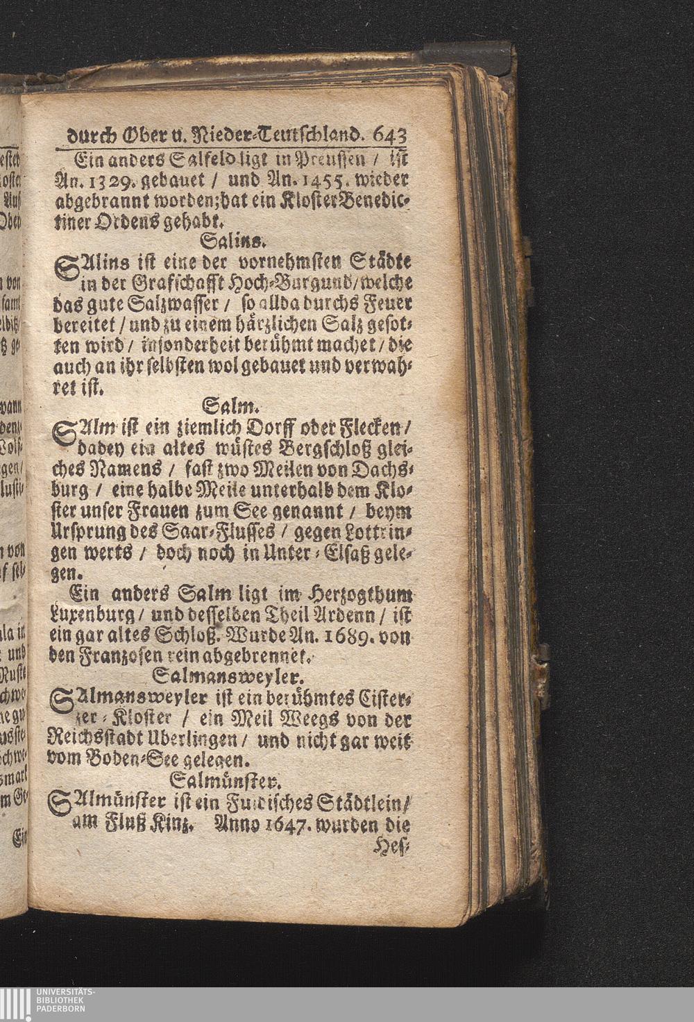 Der getreue Reiß-Gefert durch Ober- und Nieder-Teutschland : Das ist: Grundrichtige und ausführliche Abhandlung derer jenigen Residenzien/ Städte/ Schlösser/ Vestungen/ Städtlein und nahmhafften Markflecken/ welche so wol in Ober- als Nieder-Teutschland/ einem Reisenden sich hin und wieder vorstellig machen und zwar solcher Gestalt/ daß darinn derer Ursprung/ Aufnahm/ Fortification/ Raritäten/ herrliche Gebäue/ und Glück- und Unglücks-Fälle bis auf gegenwärtige Zeit fortgesetzt enthalten. Dabey auch noch über das ein absonderlicher kurz-gefasster Weegweiser angehänget zu finden/ worinnen klärlich zu sehen, wie viel Meilen ein Ort von dem andern entlegen. Alles aus denen bewährtesten Scribenten hervorgesuchet/ zum Nutz-Ergötzen mitgetheilet ...