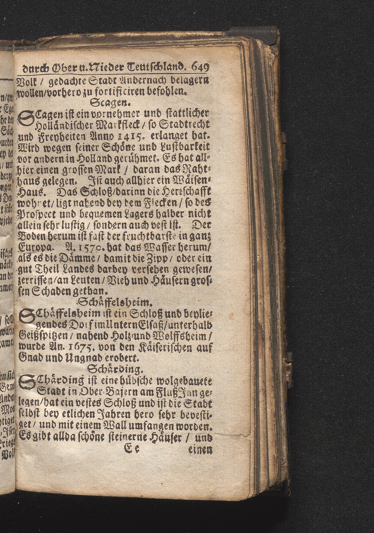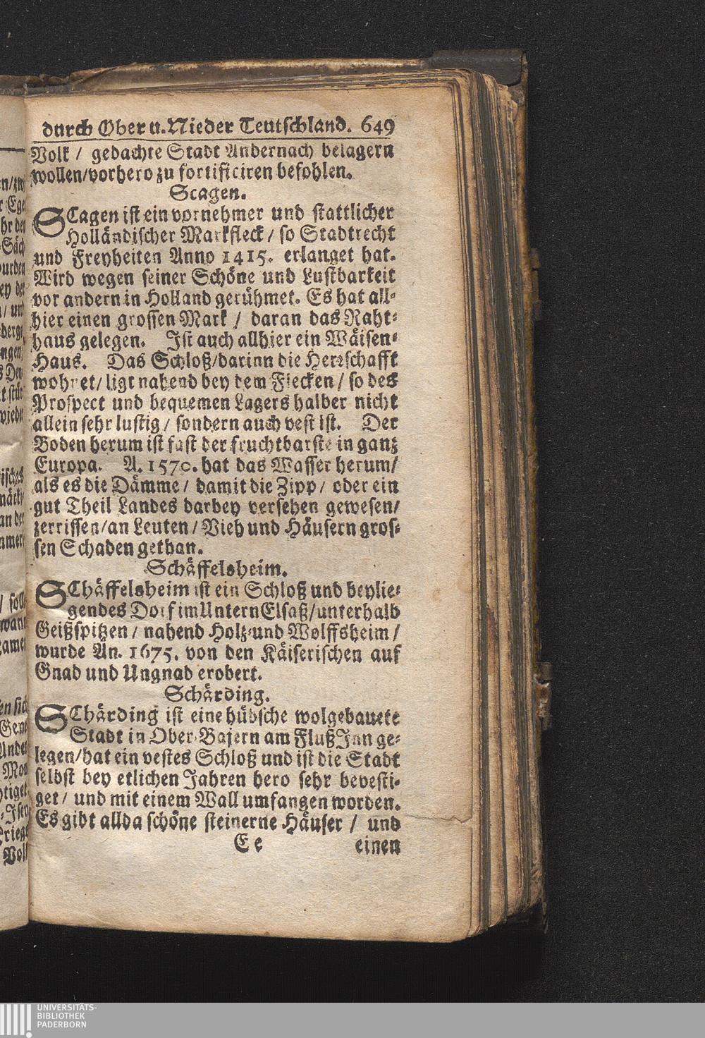 Der getreue Reiß-Gefert durch Ober- und Nieder-Teutschland : Das ist: Grundrichtige und ausführliche Abhandlung derer jenigen Residenzien/ Städte/ Schlösser/ Vestungen/ Städtlein und nahmhafften Markflecken/ welche so wol in Ober- als Nieder-Teutschland/ einem Reisenden sich hin und wieder vorstellig machen und zwar solcher Gestalt/ daß darinn derer Ursprung/ Aufnahm/ Fortification/ Raritäten/ herrliche Gebäue/ und Glück- und Unglücks-Fälle bis auf gegenwärtige Zeit fortgesetzt enthalten. Dabey auch noch über das ein absonderlicher kurz-gefasster Weegweiser angehänget zu finden/ worinnen klärlich zu sehen, wie viel Meilen ein Ort von dem andern entlegen. Alles aus denen bewährtesten Scribenten hervorgesuchet/ zum Nutz-Ergötzen mitgetheilet ...